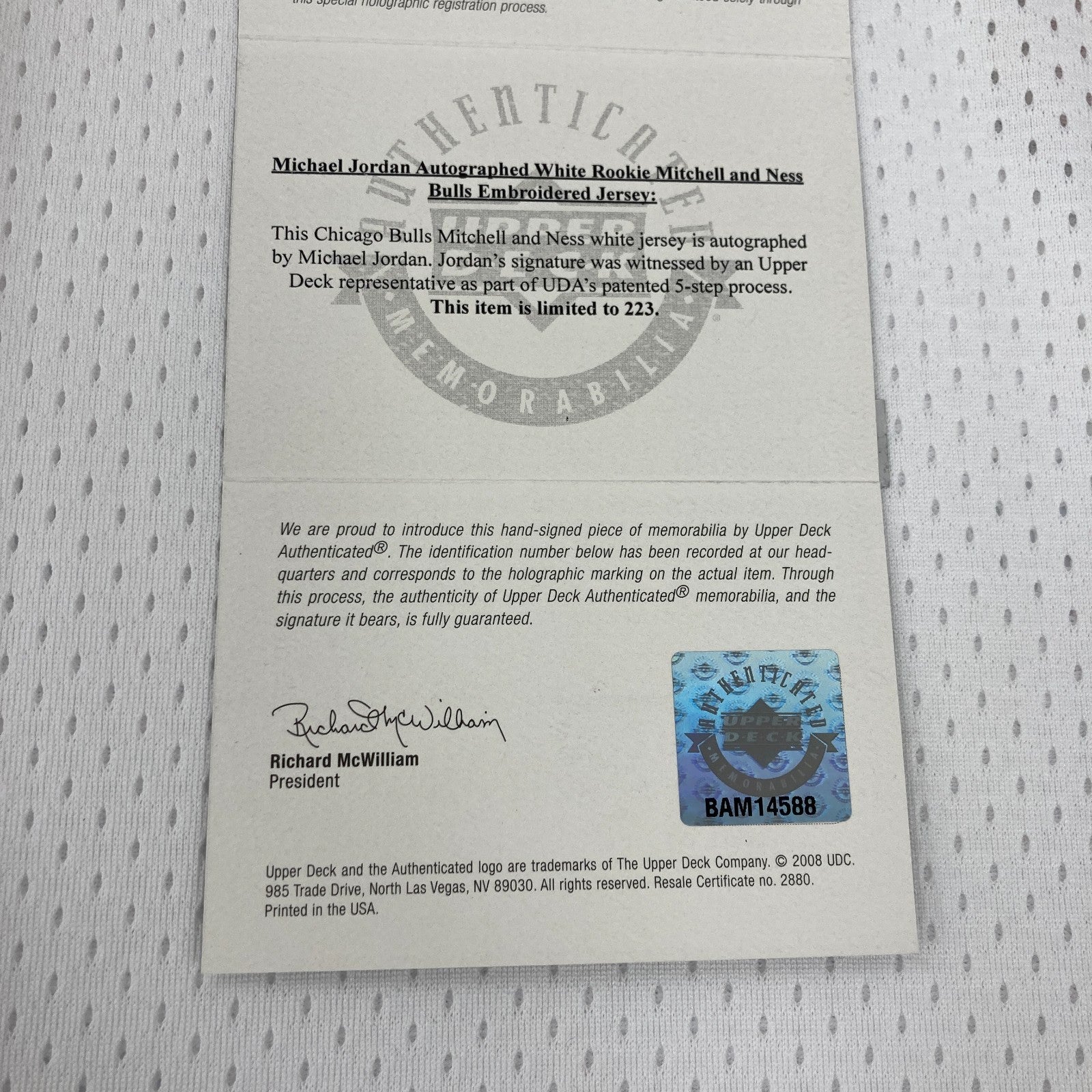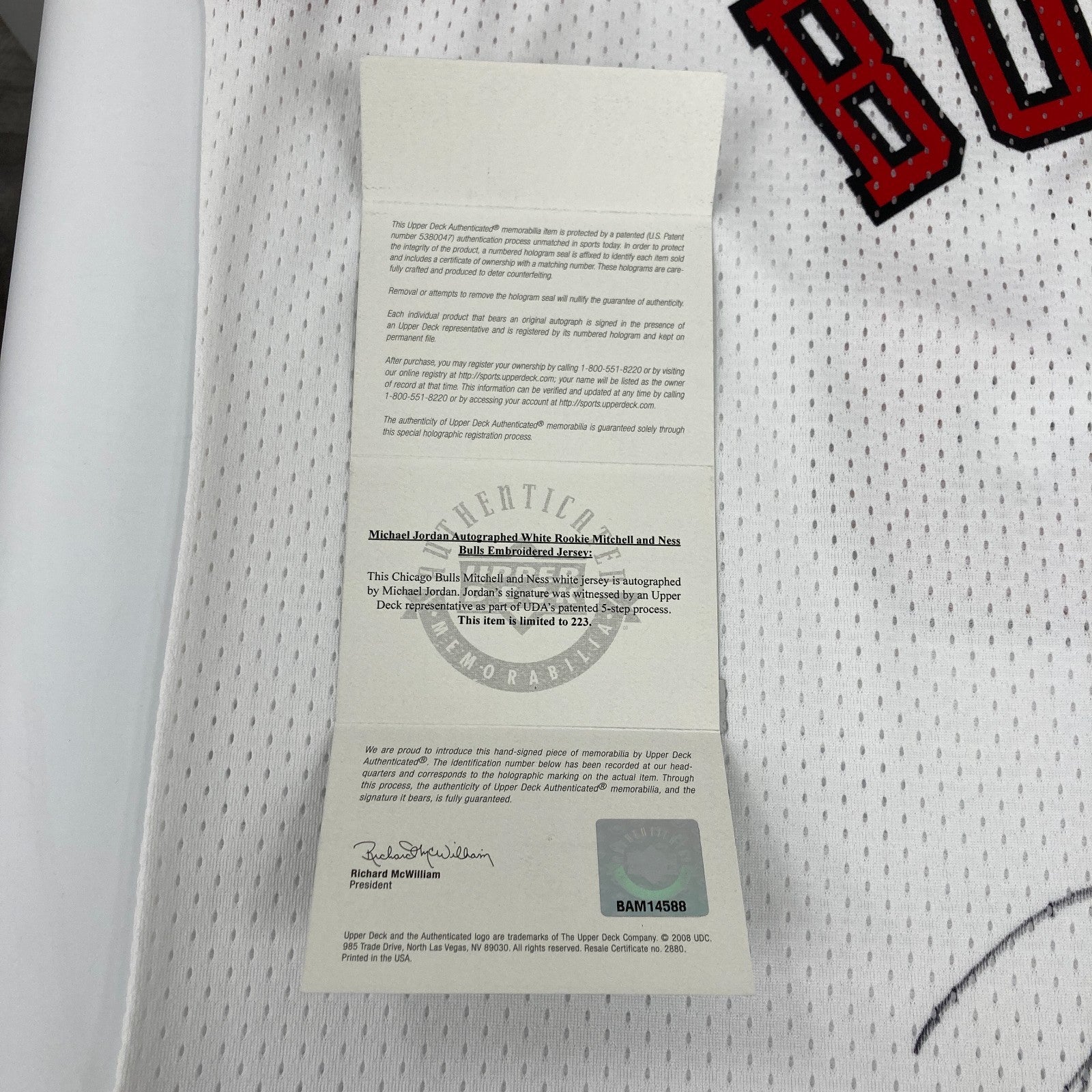 Jordan is regarded as one of the greatest basketball players of all-time, with six NBA Championship victories (1991–1993, 1996–1998). Jordan was inducted into the Naismith Memorial Basketball Hall of Fame in 2009 for his individual career, and again in 2010 as a member of the 1992 United States Olympic "Dream Team." Jordan has penned his black ink signature across the front of this jersey. The limited-edition jersey is serial numbered "134/223." COA from UDA (BAM14588) for the signature accompanies.