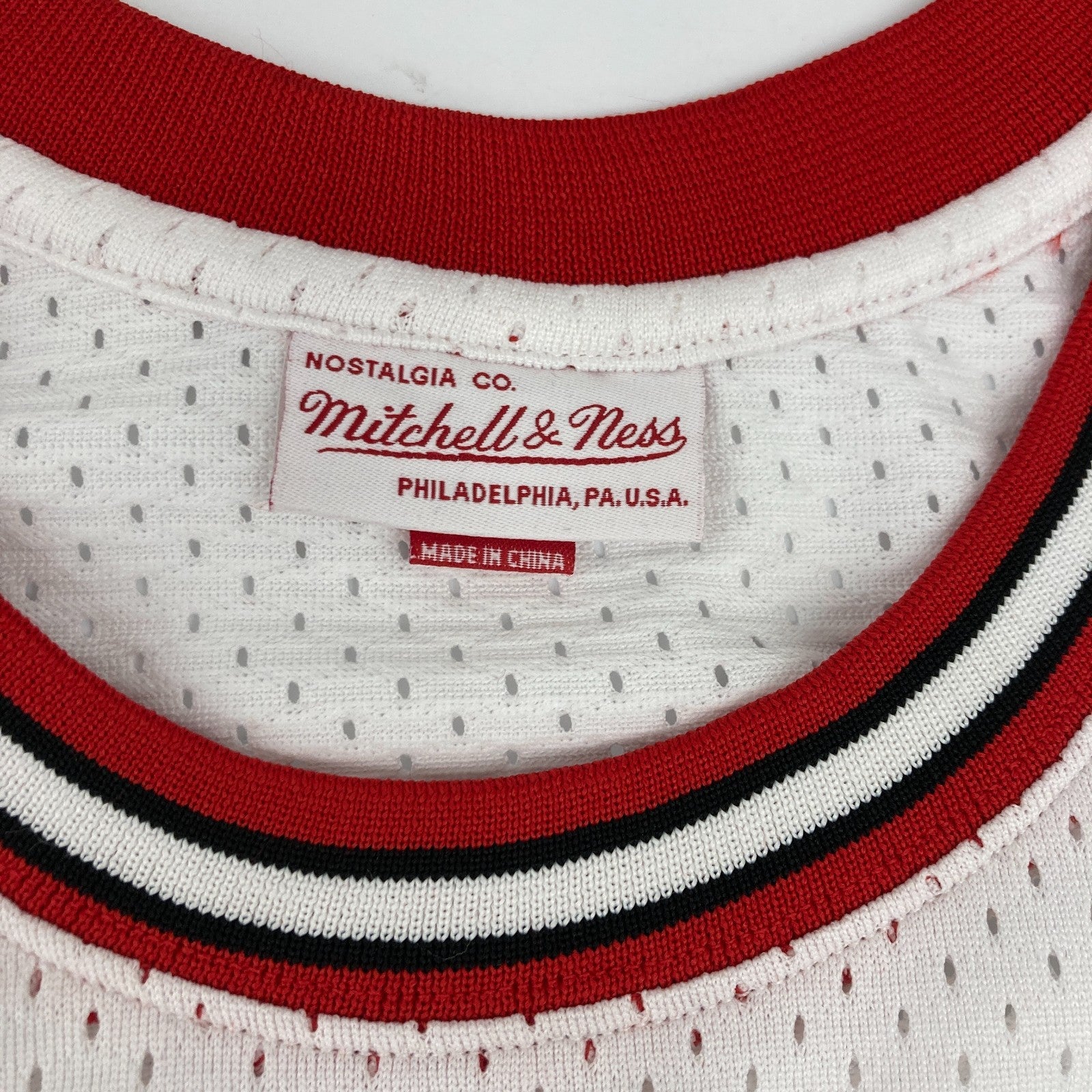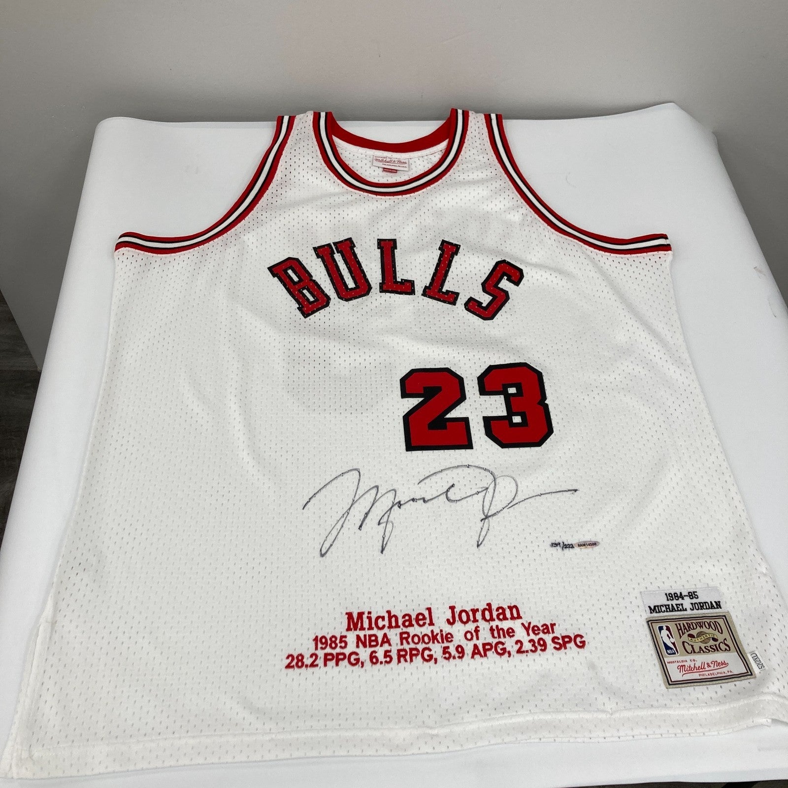 Presented is an authentic 1984-85 Mitchell & Ness Chicago Bulls Embroidered jersey signed by NBA legend and international icon Michael Jordan. Huge 12 inch autograph!