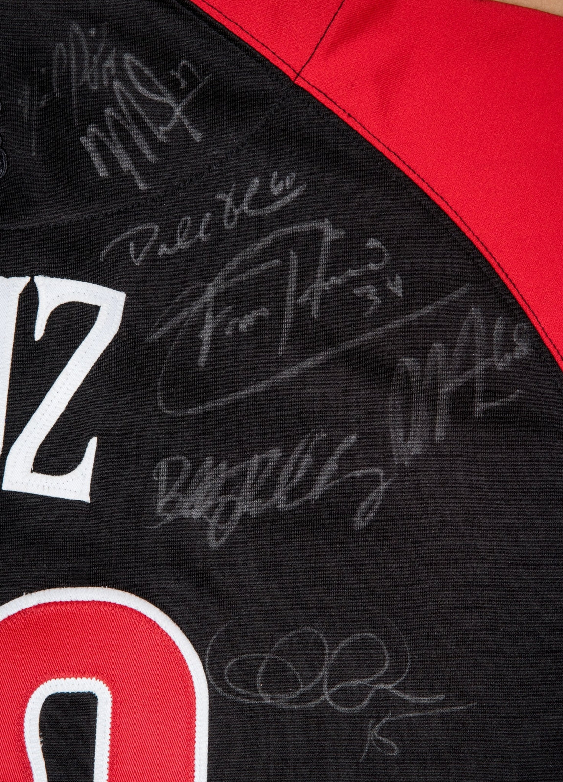 This black and red jersey features numerous signatures on the back, with players such as Albert Pujols, Felix Hernandez, Mike Trout, and Manny Machado putting pen to the jersey. Other signatures include Jose Altuve, Josh Donaldson, Adam Jones, David Price, Russell Martin, Nelson Cruz, Dellin Betances, Dallas Keuchel, Prince Fielder, Hector Santiago, and Glen Perkins. The signatures have been written in silver marker.