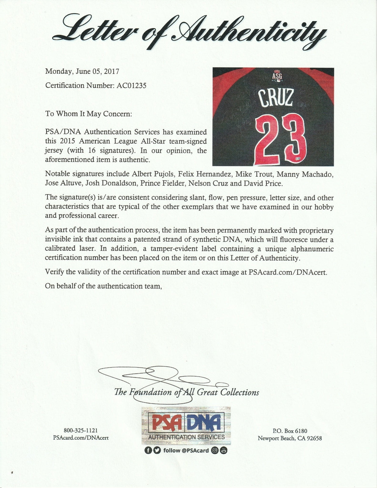 Mike Trout Albert Pujols Jose Altuve 2015 All Star Game Signed Jersey PSA DNA
