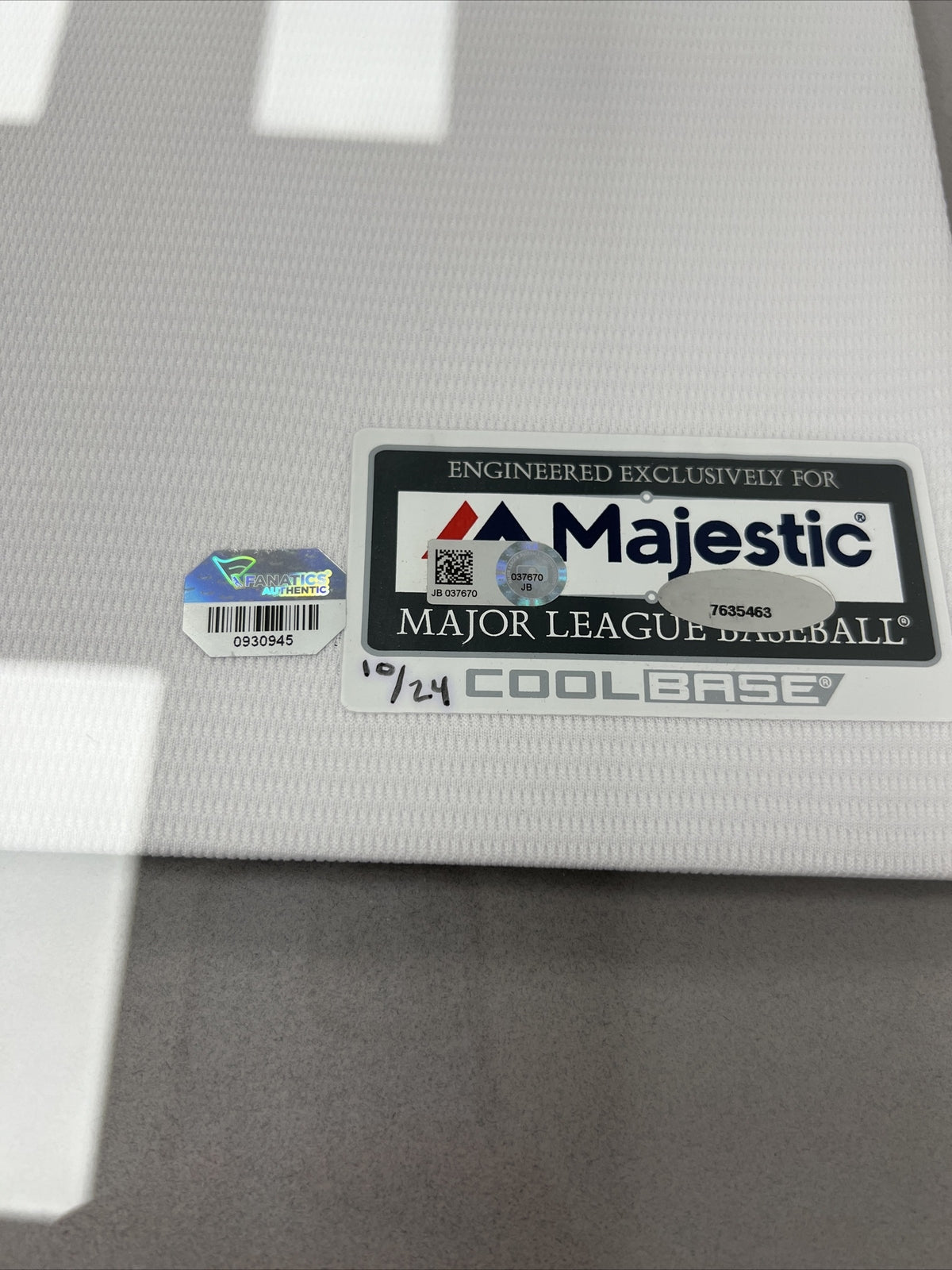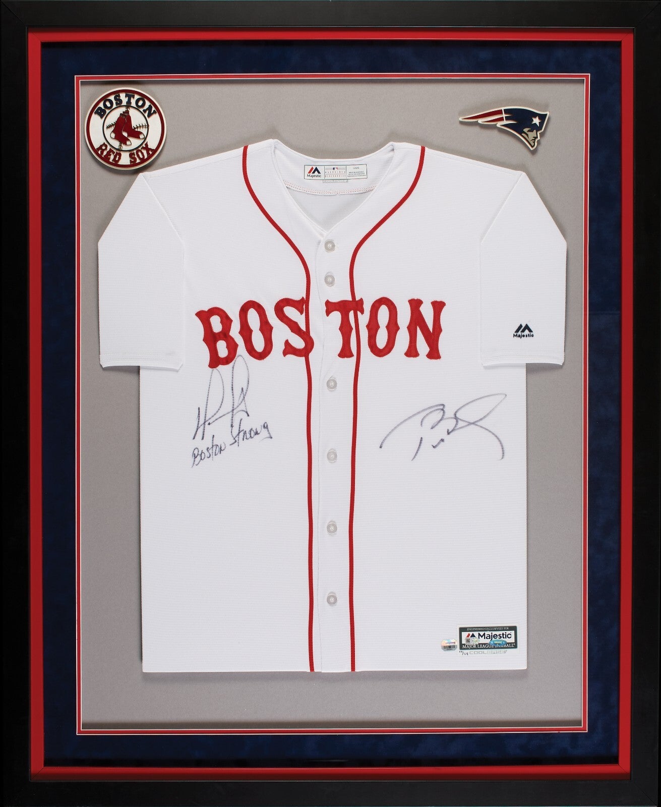 This 36x44 framed and matted jersey features signatures from both Tom Brady and David Ortiz, with "Boston Strong" inscribed under Ortiz' signature. Both players signed in black Sharpie of this white "Boston" jersey. There are MLB, Fanatics and Tri-Star holograms affixed near the Majestic label in the bottom right and the jersey is hand-numbered 10/24.