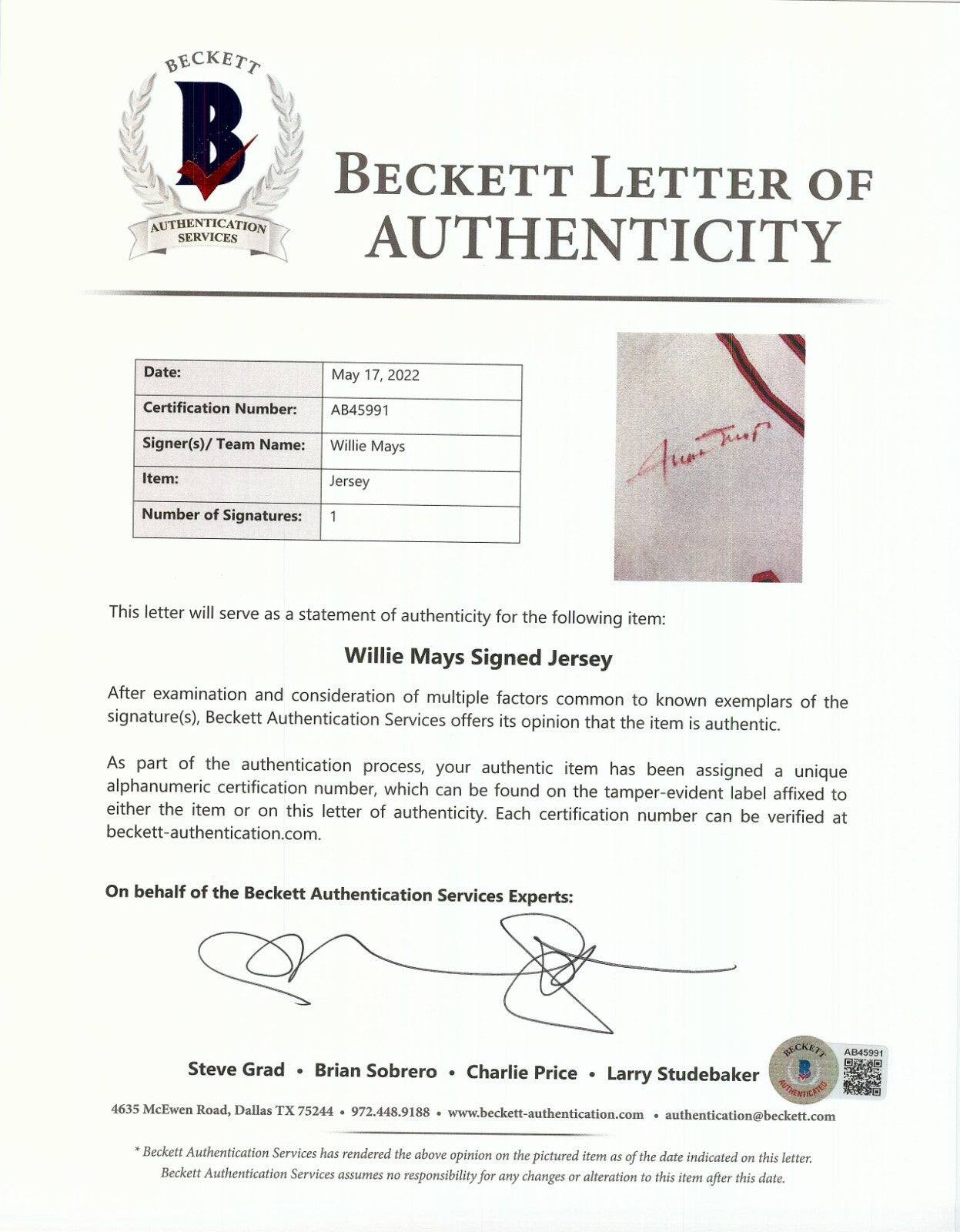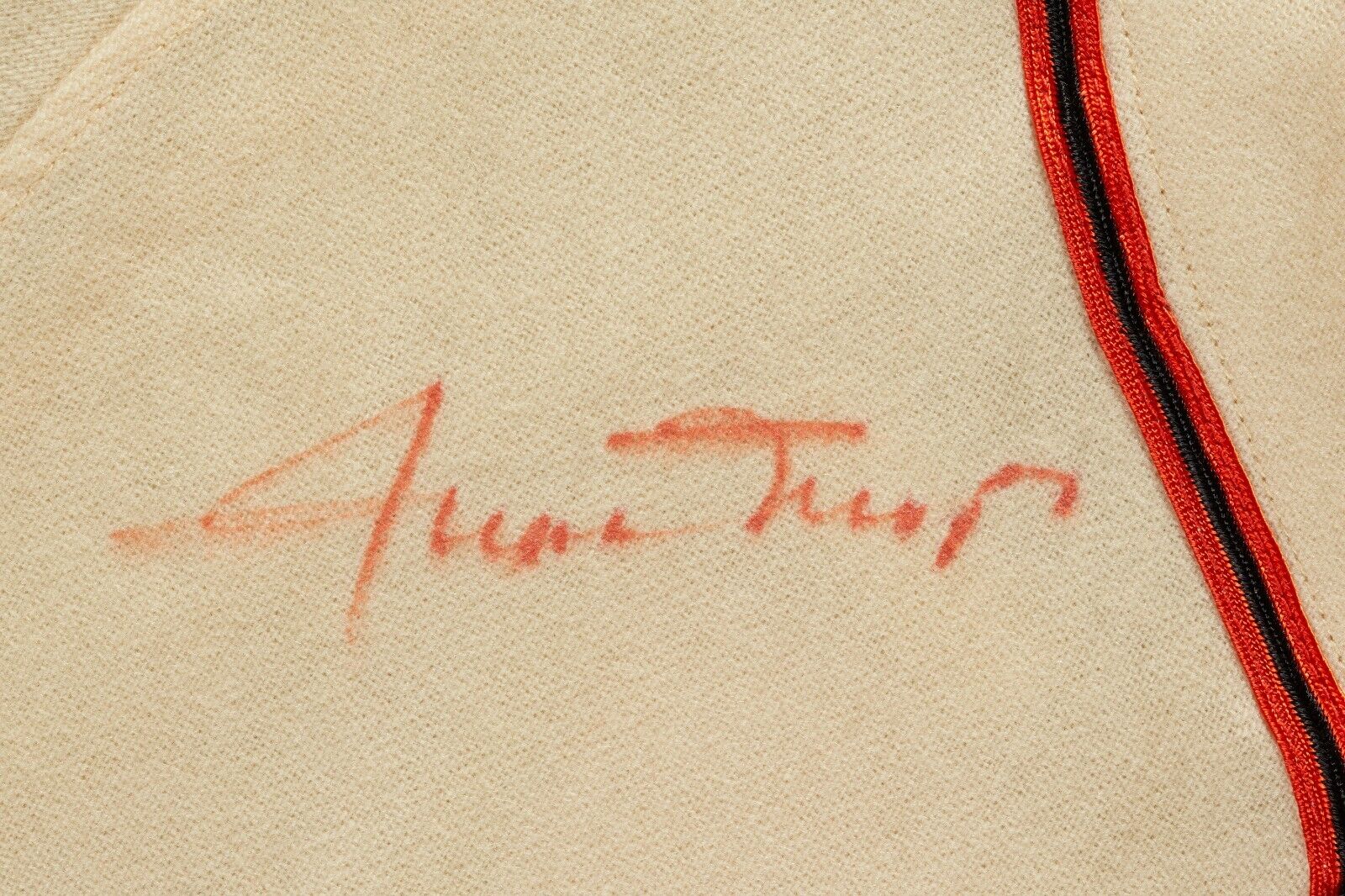 This flannel Minneapolis Millers jersey is signed on the front near the neck by Willie Mays. The red felt tip pen signature is authenticated by BAS with a full LOA. Mays spent 35 games with the Millers in 1951 before being called up by the Giants.