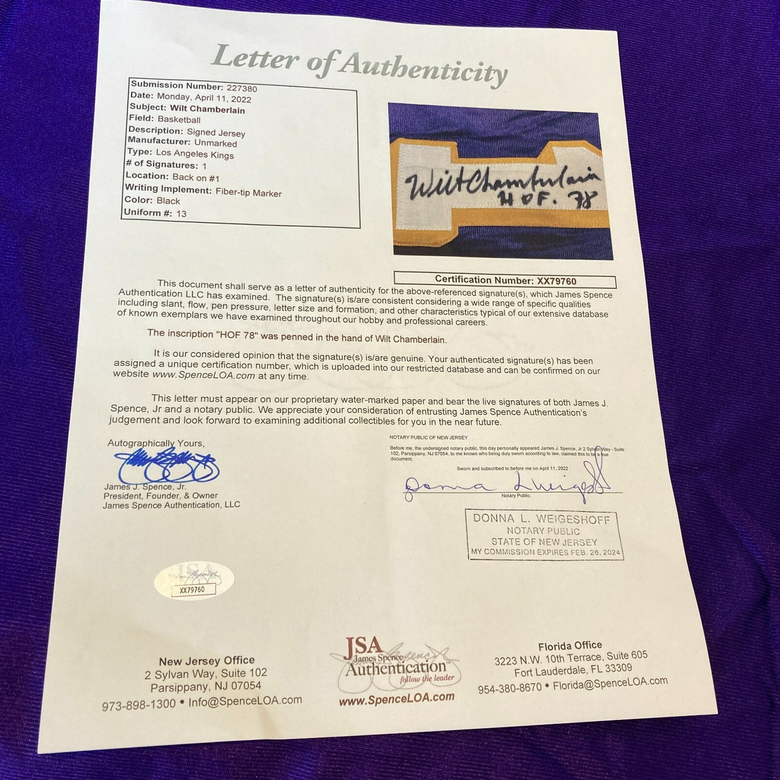 Wilt "The Stilt" Chamberlain joined the Lakers in 1968-69, and the former Warriors and 76ers star would play the final five seasons of his career in Los Angeles. Chamberlain averaged 17.7 points and 19.2 rebounds per game with the Lakers, and despite playing the twilight of his career in the Western Conference, never averaged fewer than 42.1 minutes per game in the Forum. Chamberlain, who was inducted into the Naismith Memorial Basketball Hall of Fame in 1978, has signed 1971-72 Mitchell & Ness Los Angeles Lakers Authentic Jersey on the back in black ink. “The Big Dipper” added an inscription of “HOF 78” to his signature. This jersey comes with an LOA from JSA.