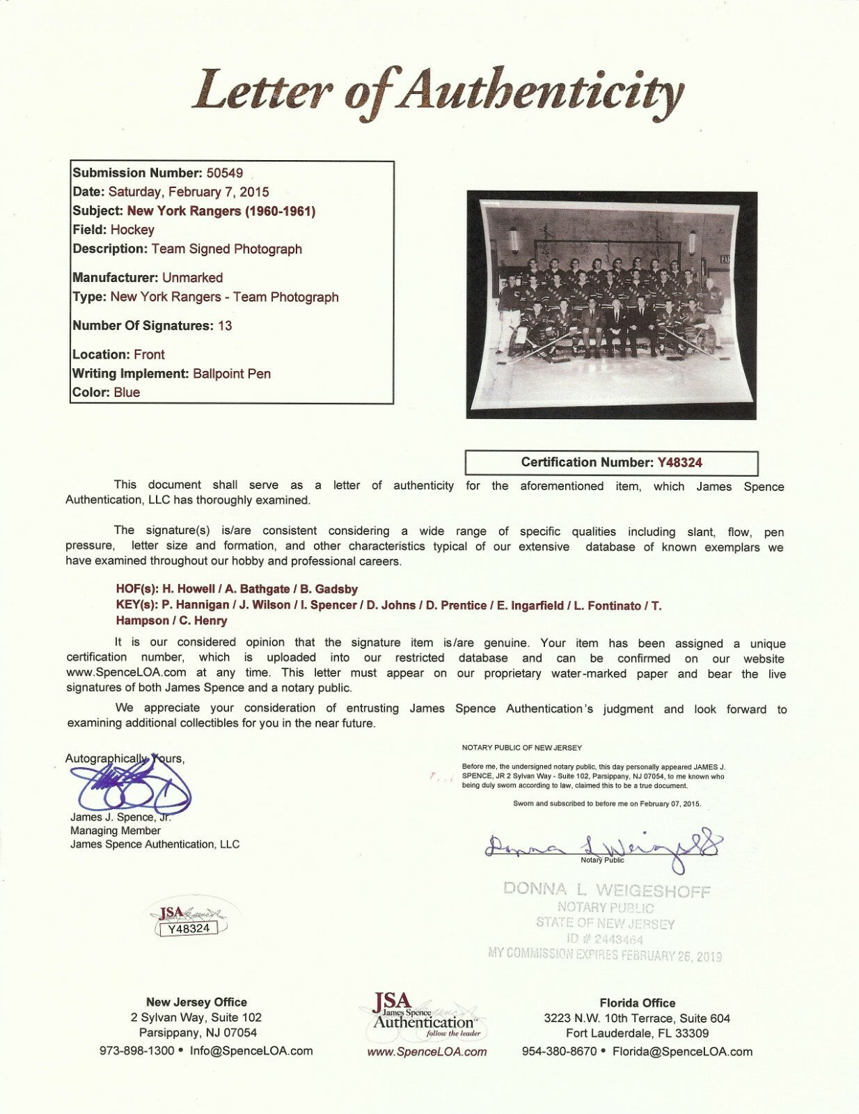 This 8x10 photo features the 1960-61 New York Rangers team and includes 13 signatures, led by HOFers Harry Howell, Andy Bathgate and Bill Gadsby. Other signatures include: Hannigan, Wilson, Spencer, Johns, Prentice, Ingarfield, Fontinato, Hampson and Henry. Each signature is in blue ballpoint pen and authenticated by JSA with a full LOA.