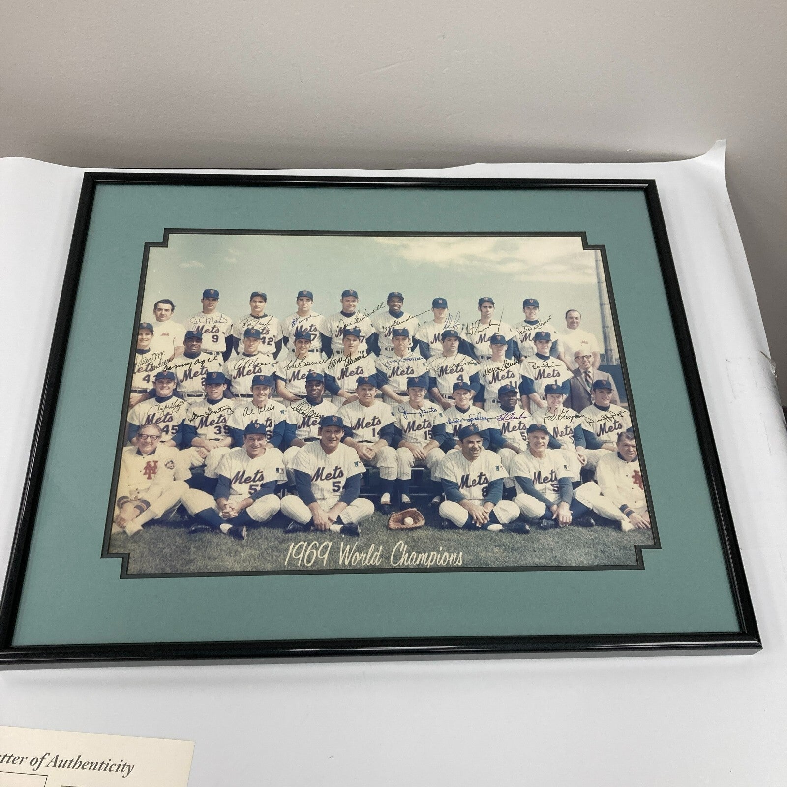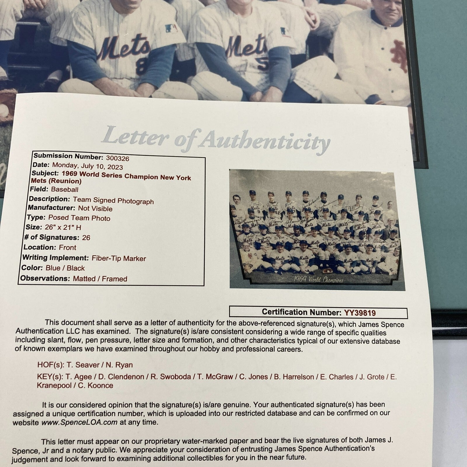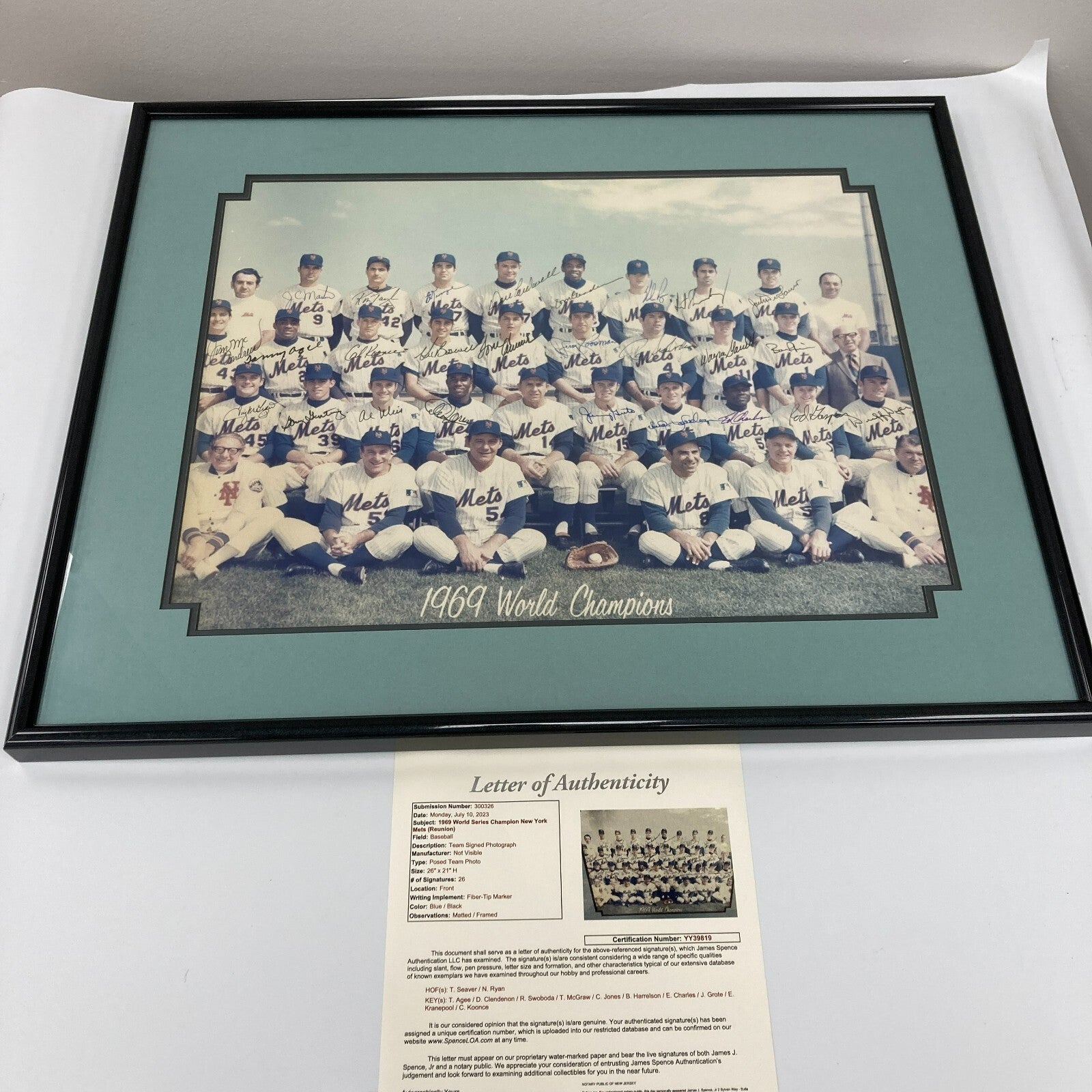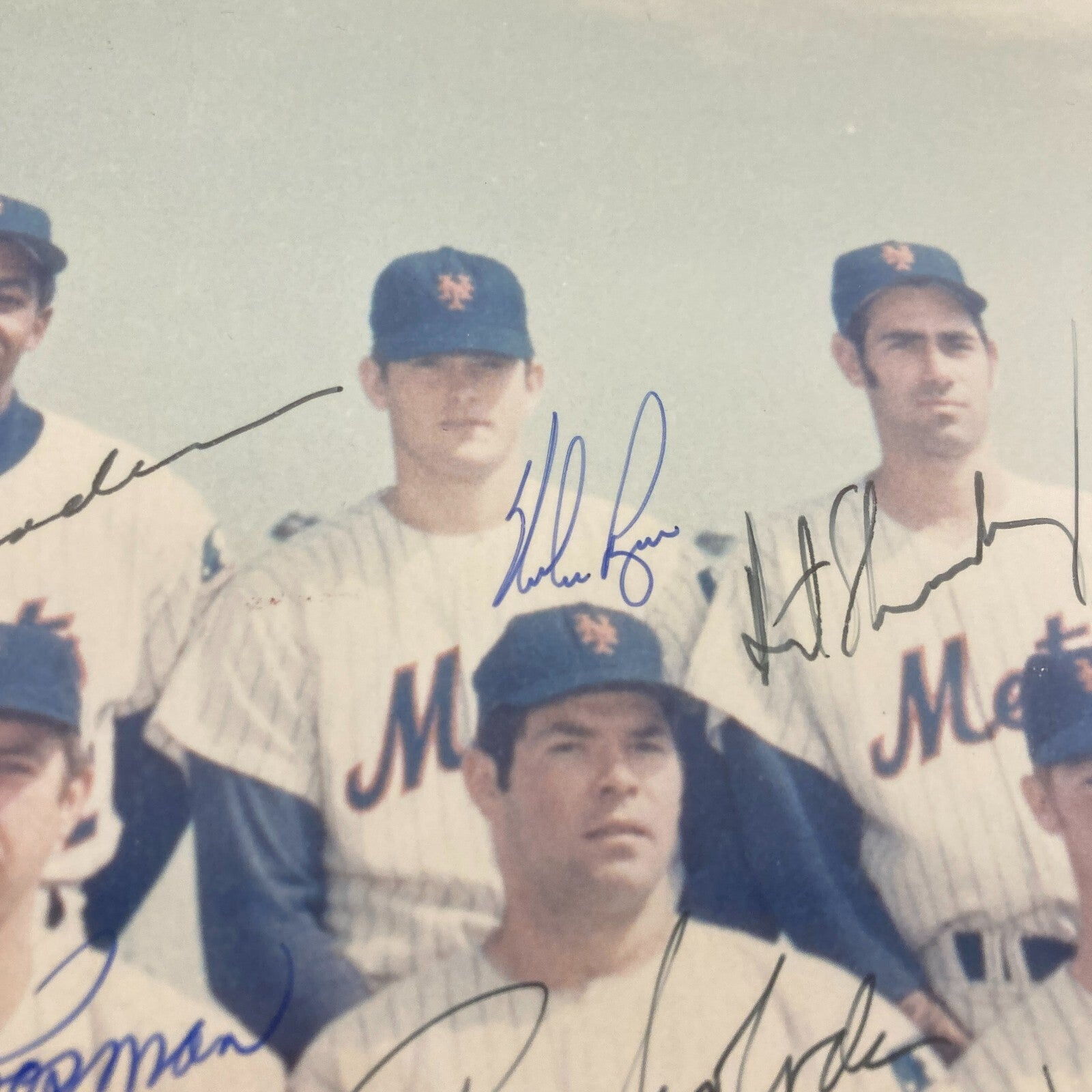 (26) signatures from that legendary club. Includes (left to right, top to bottom): J.C. Martin, Ron Taylor, Ed Kranepool, Don Cardwell, Donn Clendenon, Nolan Ryan, Art Shamsky, Jack DiLauro, Jim McAndrew, Tommy Agee, Cal Koonce, Ken Boswell, Tom Seaver, Jerry Koosman, Ron Swoboda, Wayne Garrett, Bobby Pfeil, Tug McGraw, Gary Gentry, Al Weis, Cleon Jones, Jerry Grote, Buddy Harrelson, Ed Charles, Rod Gaspar, Duffy Dyer.