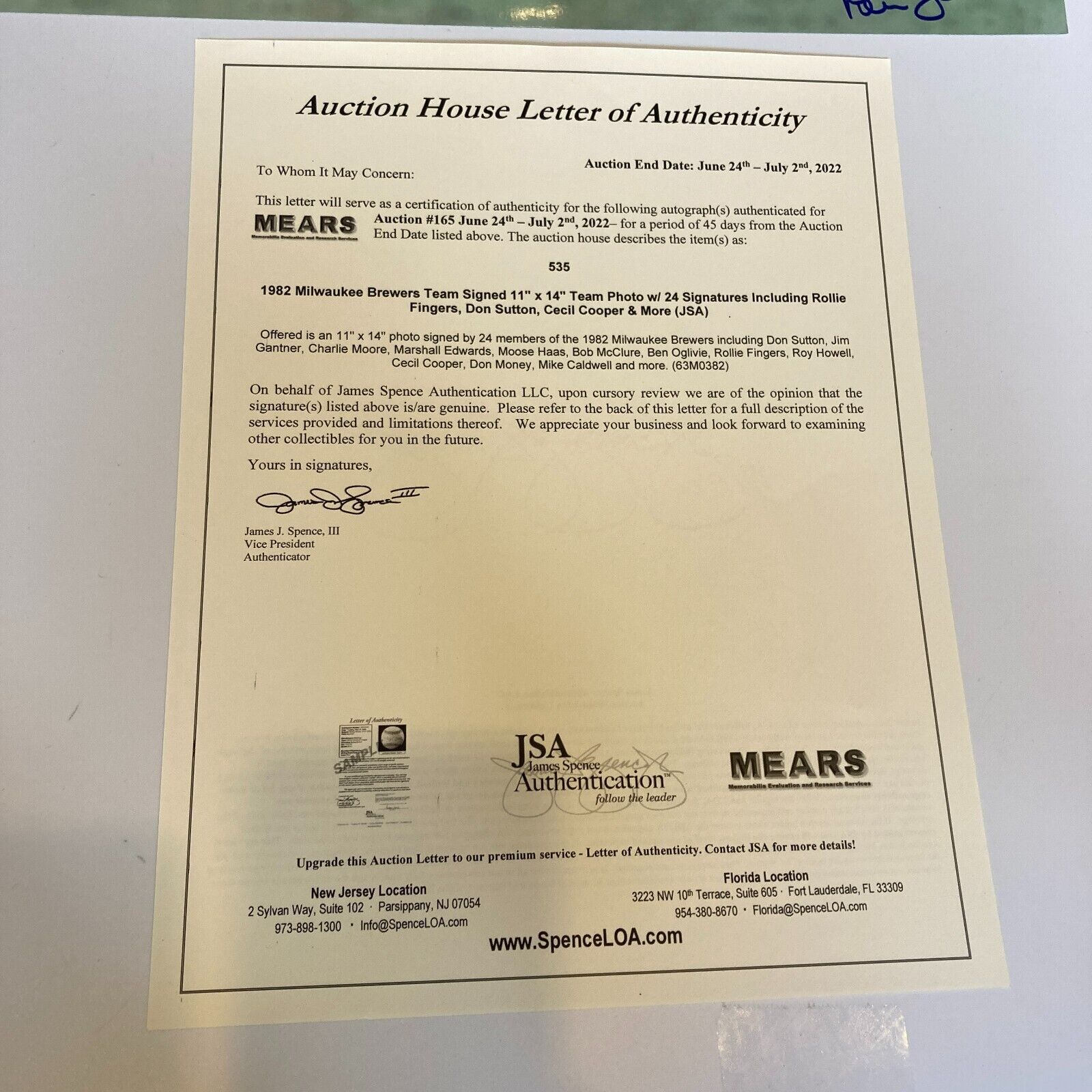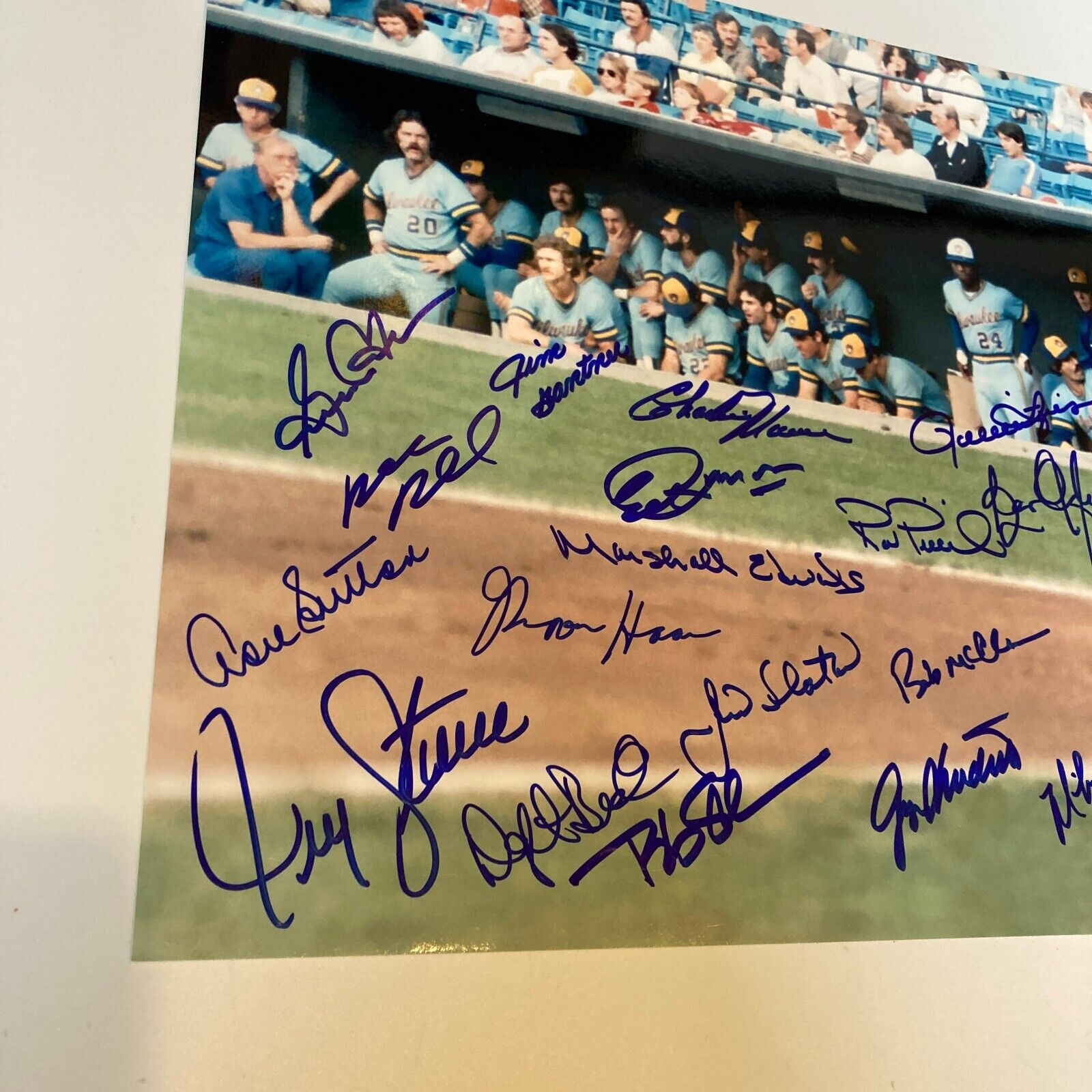 Offered is an 11" x 14" photo signed by 24 members of the 1982 Milwaukee Brewers including Don Sutton, Jim Gantner, Charlie Moore, Marshall Edwards, Moose Haas, Bob McClure, Ben Oglivie, Rollie Fingers, Roy Howell, Cecil Cooper, Don Money, Mike Caldwell and more.