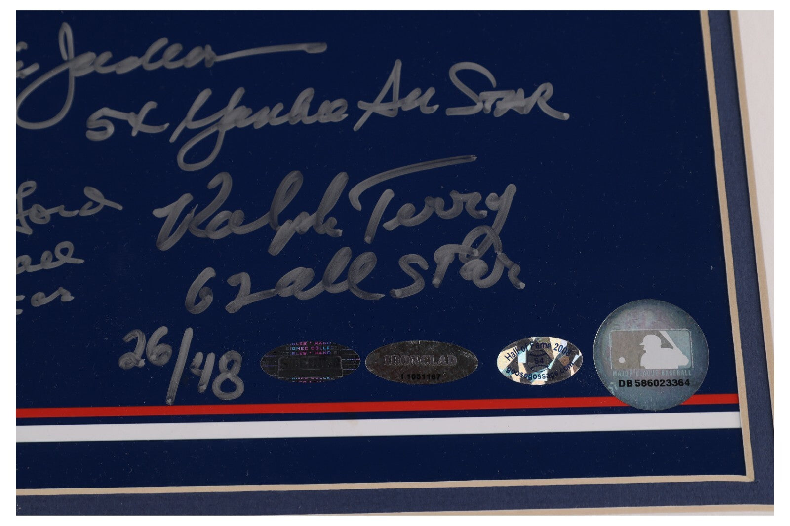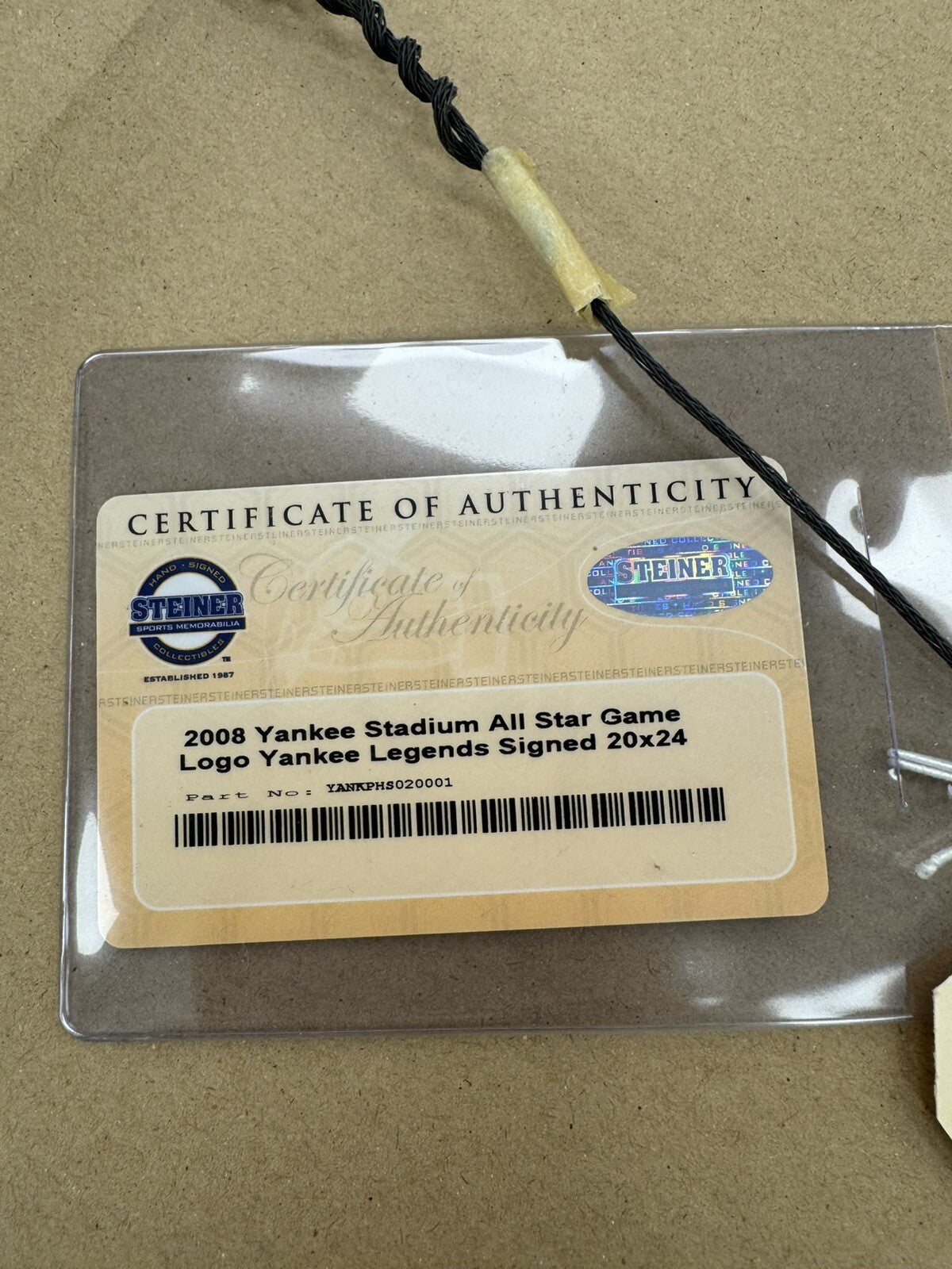 Presented is a 2008 MLB All-Star Game print that is signed by 22 former New York Yankees in honor of the game being played in Yankee Stadium. Notable signers include Derek Jeter, Mariano Rivera, Reggie Jackson, Whitey Ford, Paul O'Neil, Graig Nettles, David Cone, Mike Stanton (not to be confused with current Yankee Giancarlo Stanton, who was referred to as Mike Stanton until 2012), Mel Stottlemyre, Don Mattingly, and Bobby Richardson. Many of the signers have contributed a short inscription after their autograph, usually relating to their number of All-Star appearances as a member of the Yankees. The piece is housed in an attractive 31.5-by-28-inch frame with white matting and comes with a COA from Steiner for the autographs. The item is hand serial-numbered "26/48."