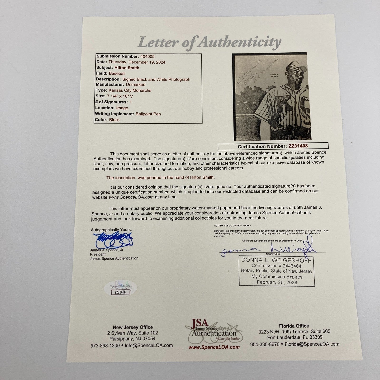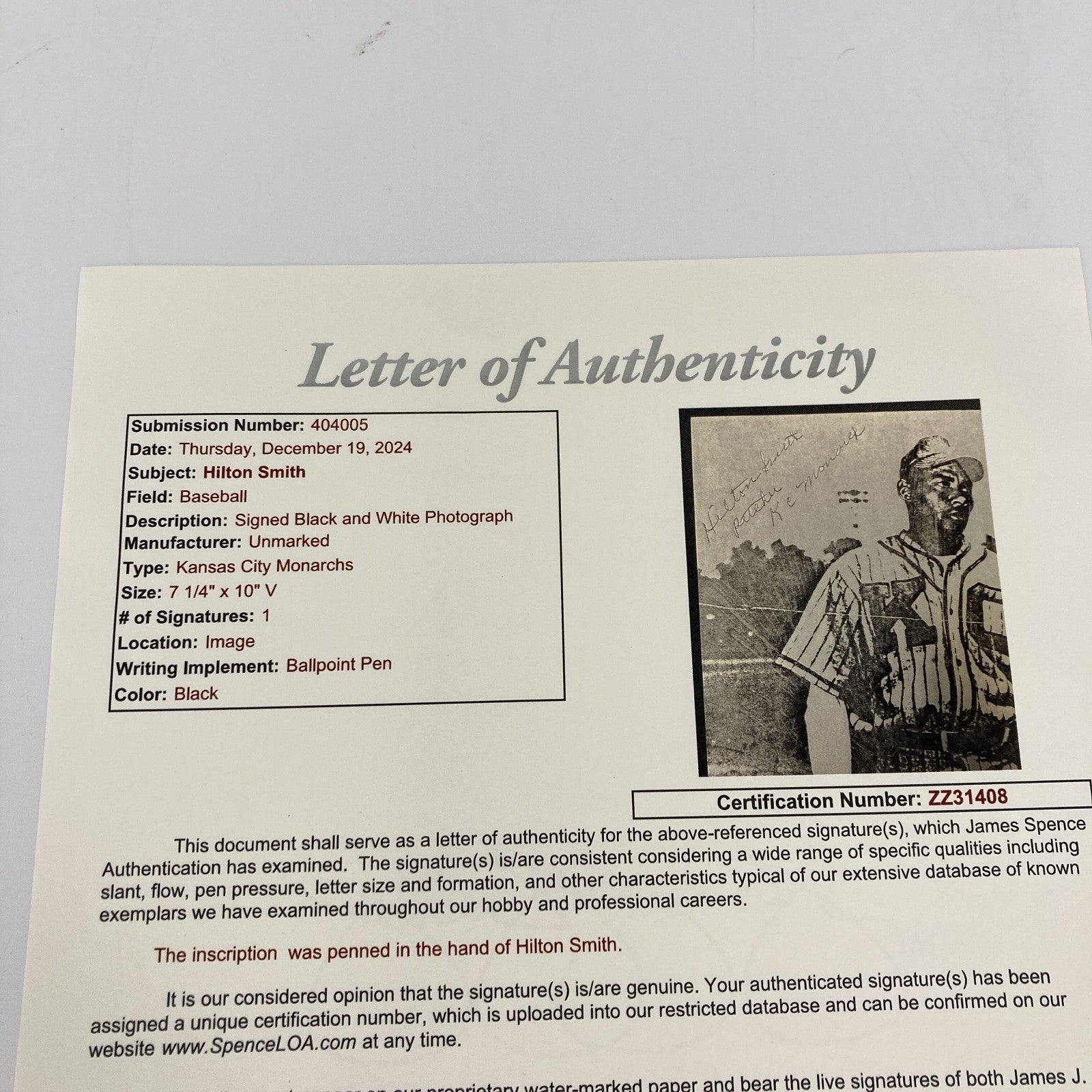 Black-and-white print signed in black ink by Hall of Fame pitcher and former Negro League star Hilton Smith (1907-1983). Smith has added the inscription "Pitcher/KC Monarchs" under his signature. According to his Negro League and Major League contemporaries alike, Hilton Smith was one of the top pitchers to ever take the mound. Despite pitching in the shadow of Satchel Paige for much of his career, Smith’s accomplishments actually rivaled those of his more flamboyant teammate. Smith won twenty or more games in each of his twelve seasons with the Monarchs and appeared in six Negro-League All-Star Games. He was at his best between the years 1939 and 1942, when he won ninety-three games against only eleven losses. Smith passed away in 1983 and was elected to the Baseball Hall of Fame in 2001. The print (7 x 10 inches) has a few tiny creases and is in Excellent condition overall. Full LOA from James Spence/JSA.