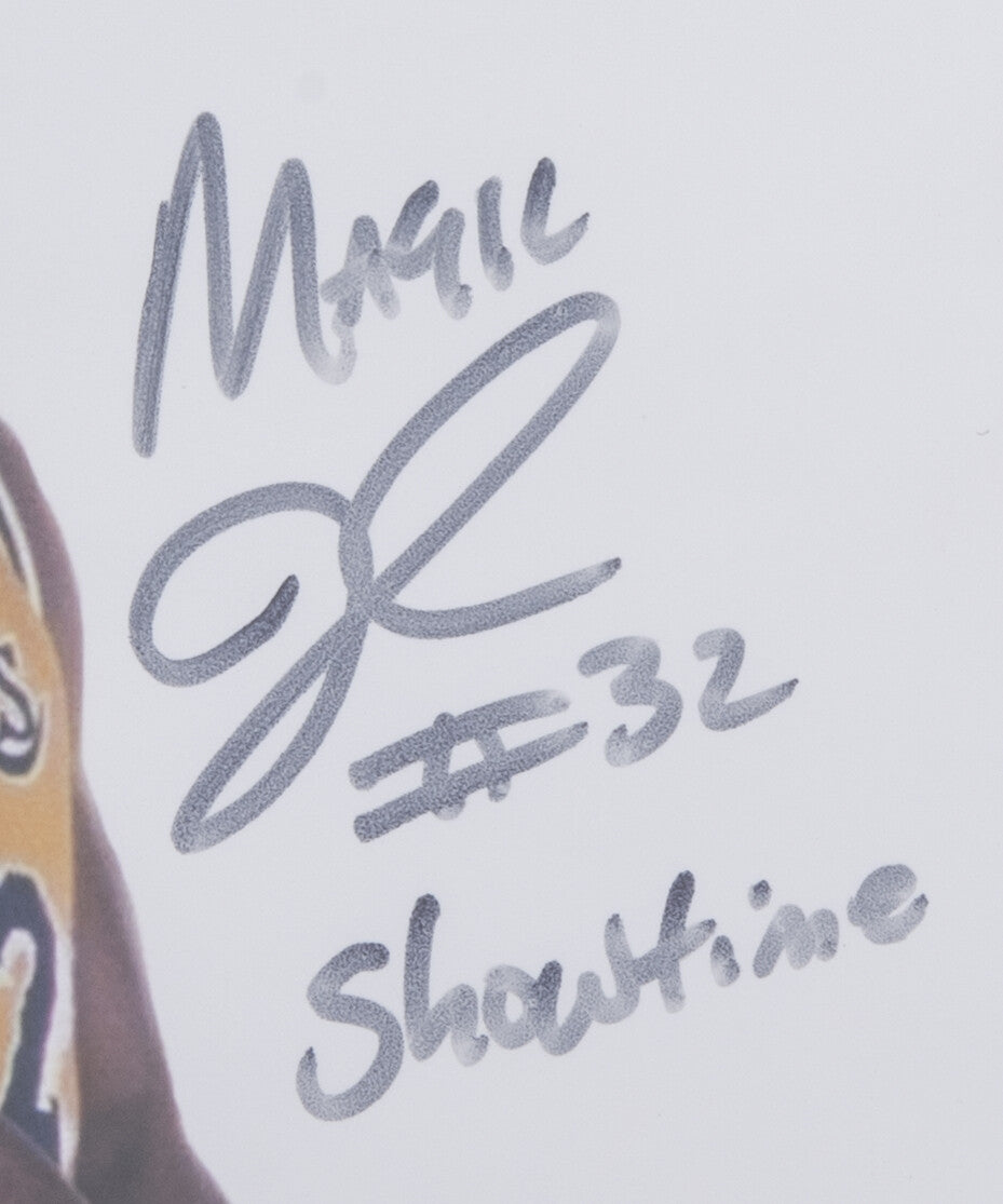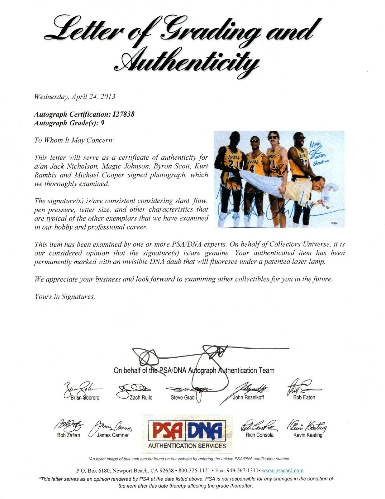 In 1986, at the very apex of the Los Angeles Lakers' "Showtime" dynasty, photographer Brian Lanker gathered Magic Johnson, Kurt Rambis, Michael Cooper and Byron Scott to stand for a shoot featuring the team's most famous fan, Jack Nicholson. The iconic image eventually made its way to Sports Illustrated, perfectly documenting the personality of the Laker team of that era. Presented here is an 11 x 14 photograph signed by all four team members as well as Nicholson himself. The photograph has been framed to an overall size of 21 x 21.5 along with a descriptive plaque and Lakers logos. The photograph is accompanied by an LOA from PSA/DNA (I27838), with signatures graded "9".