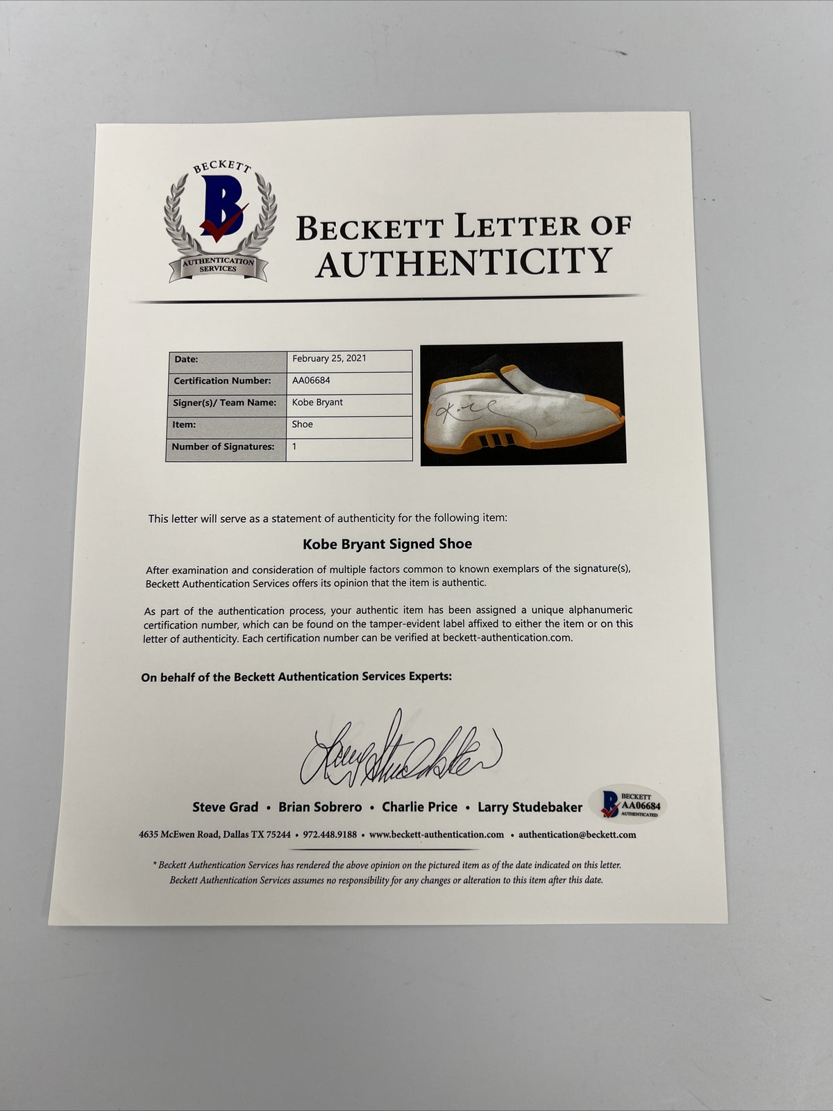 LOA from Resolution (BK021921, for photo match). LOAs from Beckett (AA06683 and AA96684, for autographs).