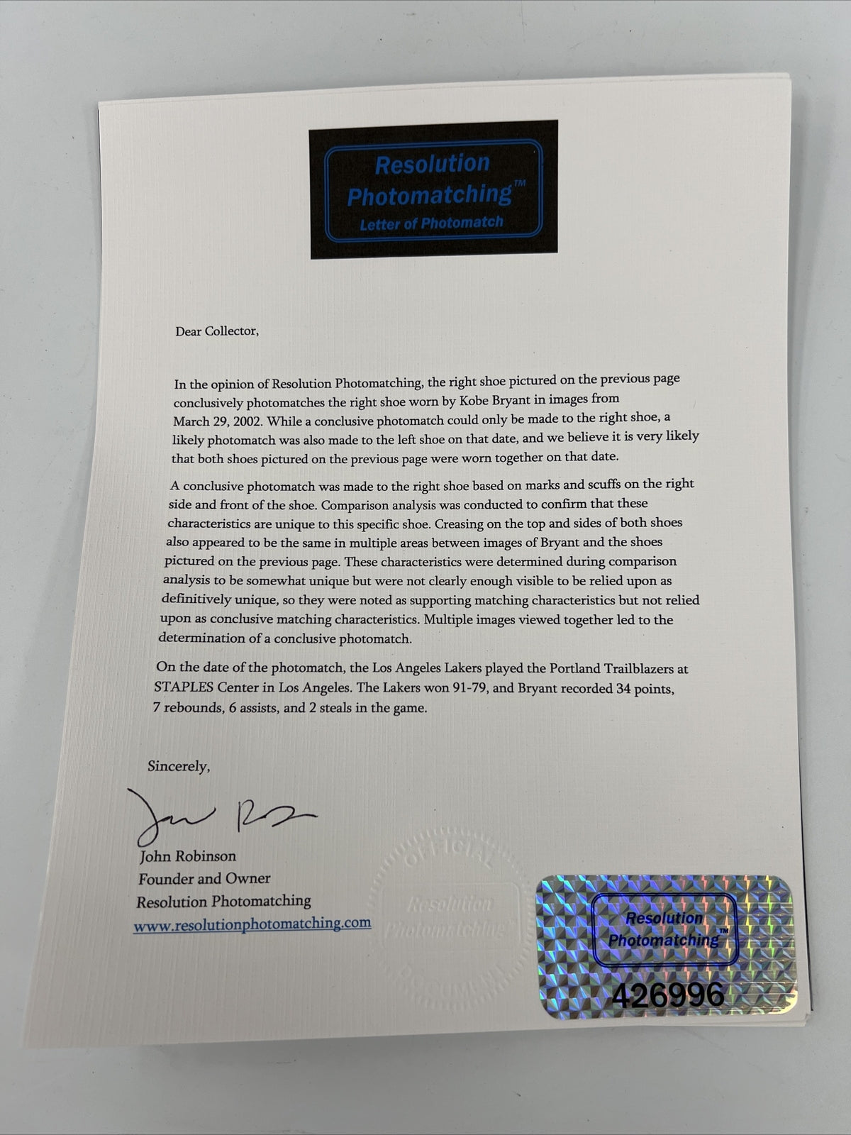 These shoes are photo matched to that game on March 29th. Resolution's LOA states, "While a conclusive photomatch could only be made to the right shoe, a likely photomatch was also made to the left shoe on that date, and we believe it is very likely that both shoes pictured on the previous page were worn together on that date." Kobe's stat line was 34 points, 7 rebounds and 6 assists.