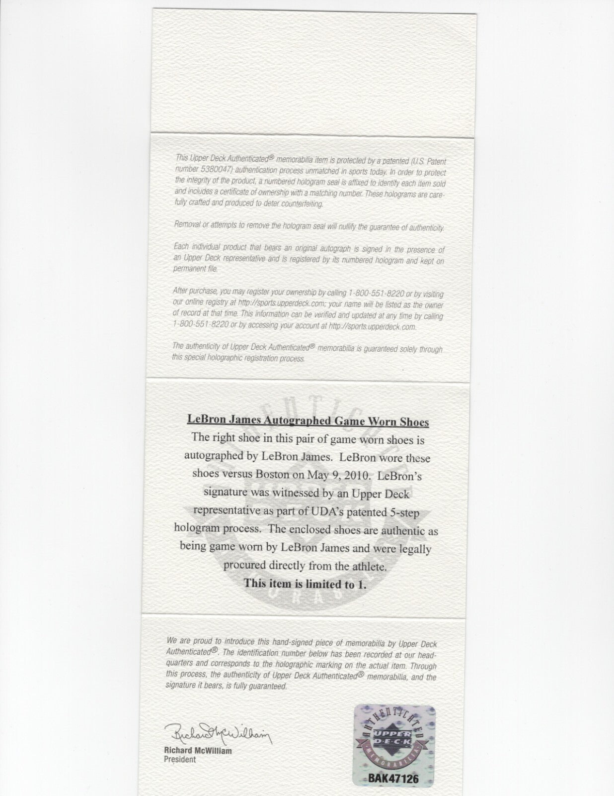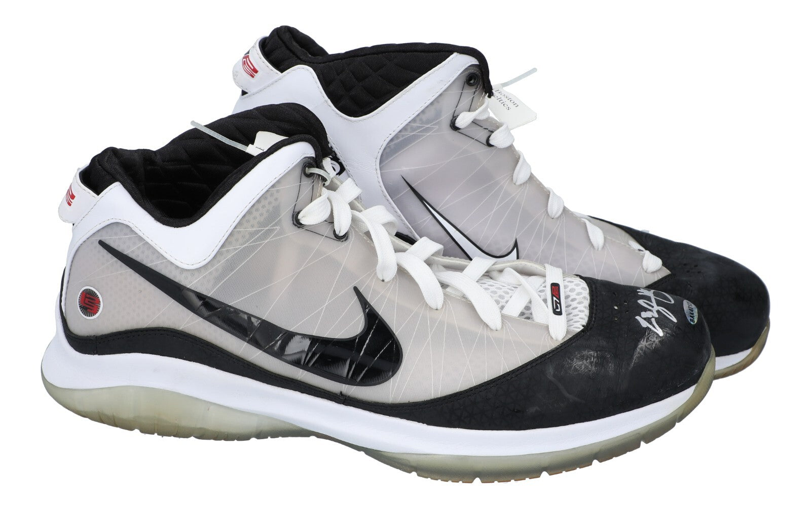 These offered size 16 Nike Zoom LeBron VII PS sneakers are grey and white with black, white, and red accents. The laces are white with the "L7PS" logo in black, white, and red on the bottom cross-section. The same logo appears on the back heel of each shoe. A black Nike "Swoosh" appears on the outside of each upper, while a white "Swoosh" appears on the inside. The outside of each heel has James' "L23" logo in red, black, and white, and the inside of each heel has a black lion with red eyes wearing a crown. James has handwritten "5/9 Bos" onto the toe box of each shoe in black marker, while the left sole has a piece of blue tape that has "5/9/10 BOSTON" written in green marker. James signed his name on the toe of the right shoe in silver metallic marker. These sneakers display excellent use. The limited-edition piece is serial-numbered "1/1." The sneakers come with a COA from Upper Deck Authenticated (BAK47126) authenticating that James wore them during the May 9, 2010, Eastern Conference Finals game. The shoes also come with an LOA from Sports Investors Authentication (220809M6), which has photo-matched them to the same game.