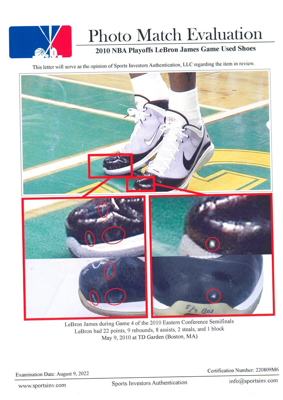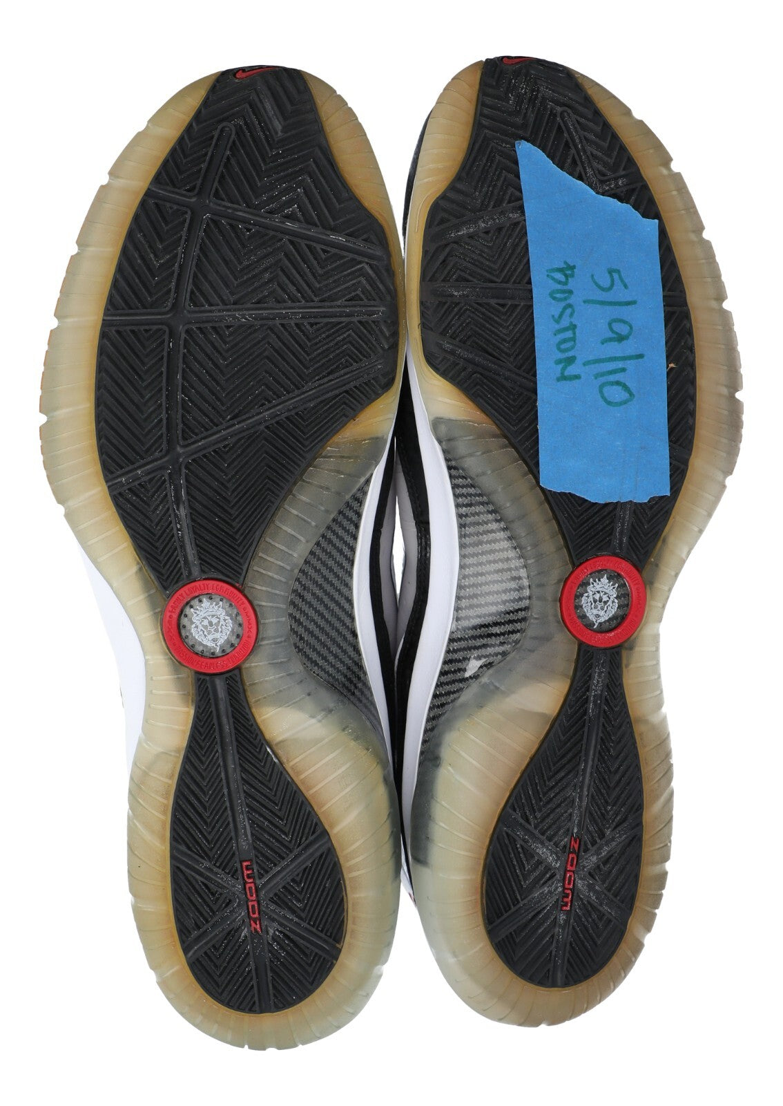 While wearing the presented Nike sneakers, LeBron James scored 22 points while contributing 9 rebounds, 8 assists, 2 steals, and 1 block during Game 4 of the 2010 Eastern Conference Finals against the Boston Celtics at TD Garden in Boston on May 9.