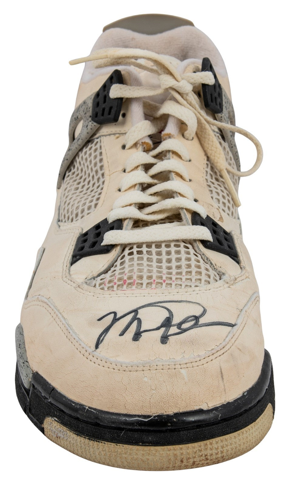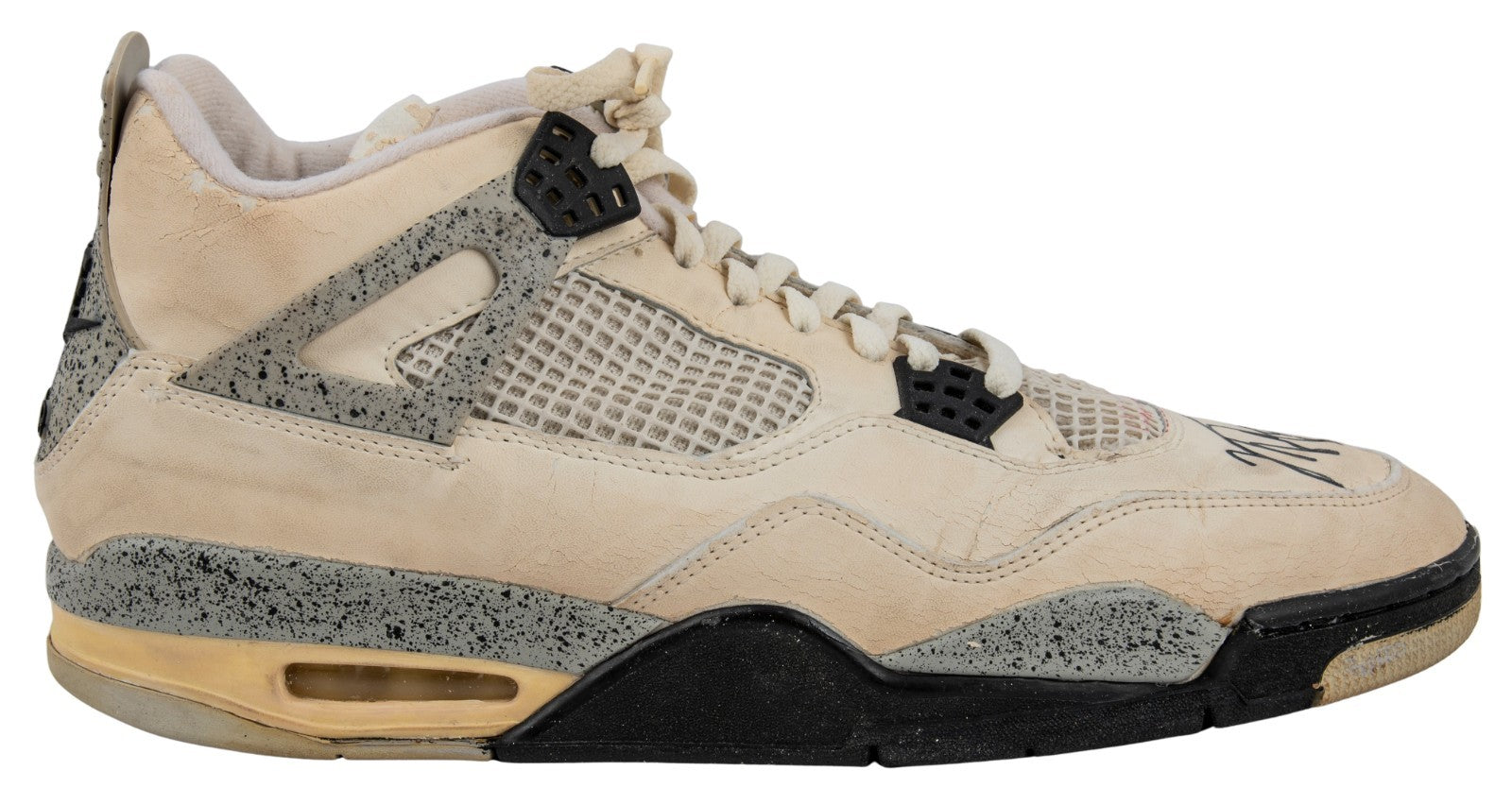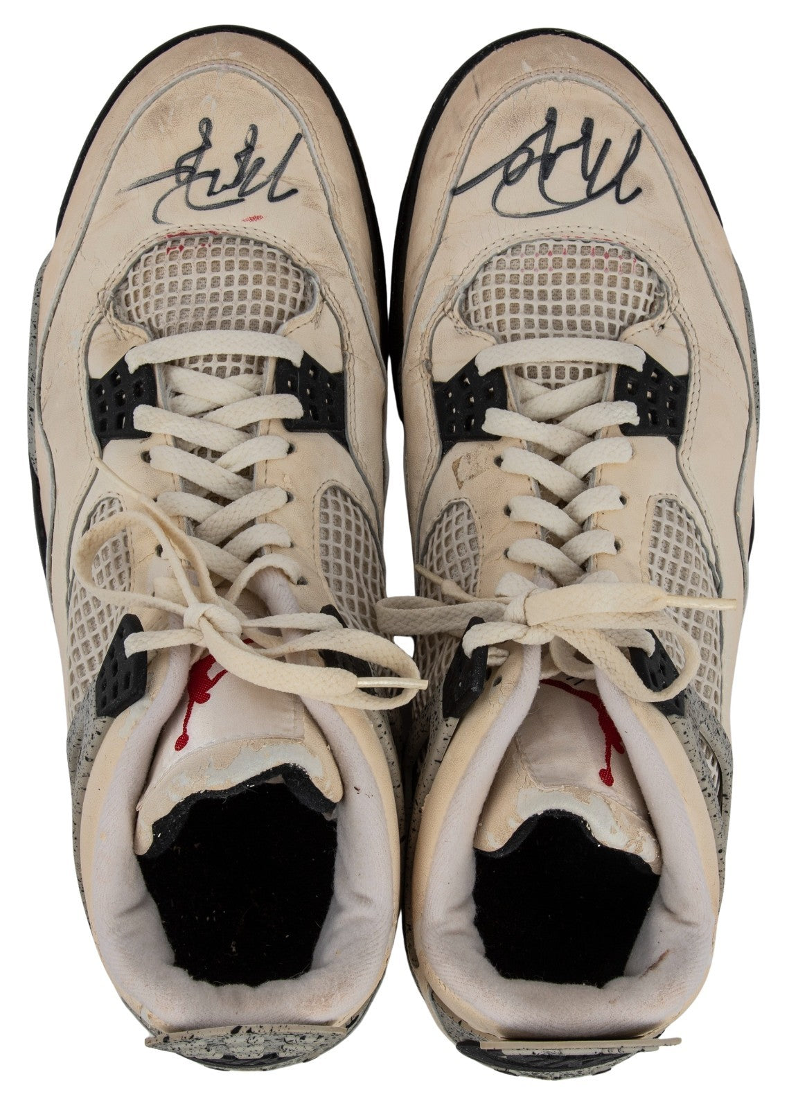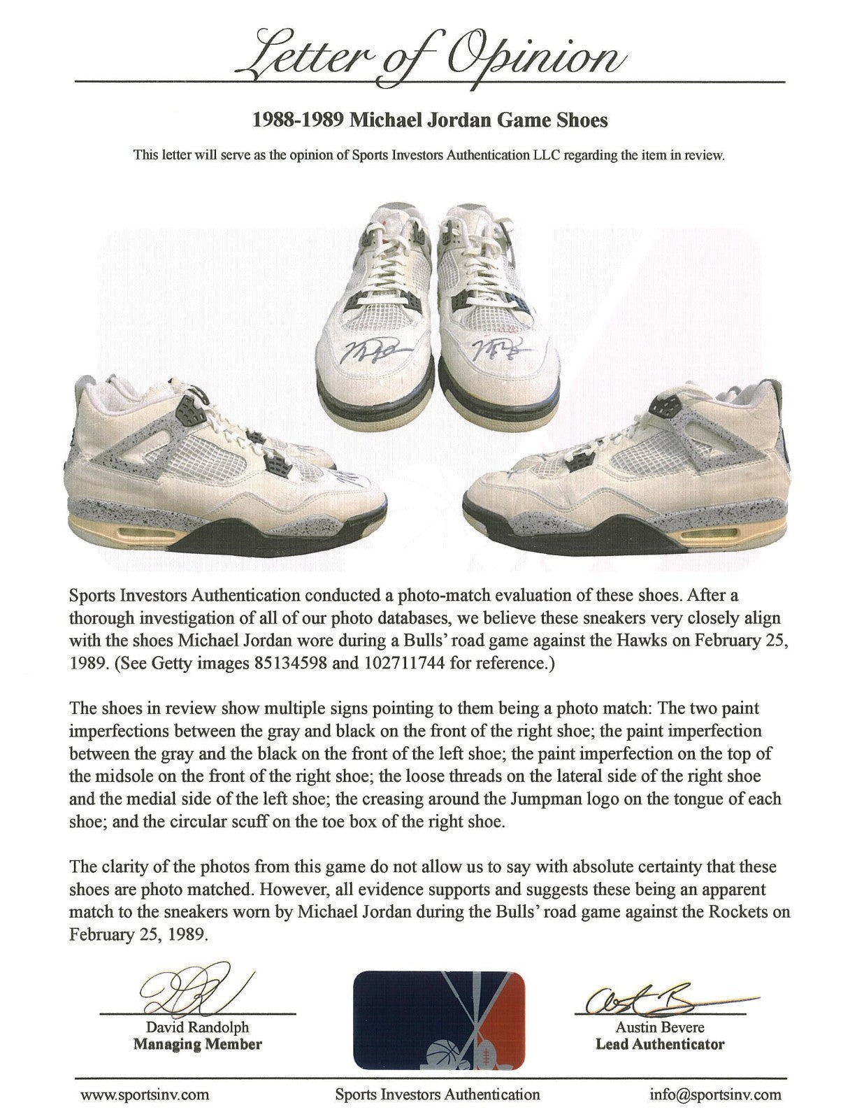 Presented is a pair of Nike Jordan Brand basketball sneakers used by NBA Hall of Famer and basketball icon Michael Jordan during the 1988-89 NBA regular season. Jordan's evolution into the Association's leading scorer was already complete by year no. 5 of his already impressive career; coming off his first MVP Award, Jordan led the Association in scoring for the third consecutive year with an average of 32.5 points per game, while adding 8.0 total rebounds and 8.0 assists in 81 games played. The sneakers exhibit a black/gray/white colorway and have been signed by Jordan, who has penned his flowing signature in black marker across each toe box. Accompanying the sneakers is an LOA from Sports Investors Authentication, who state that they "believe these sneakers very closely align with the shoes Michael Jordan wore during a Bulls' road game against the Hawks on February 25, 1989." In that game, the Hawks defeated the Bulls 125-95, with Jordan recording a team-high 18 points with 5 total rebounds and 3 assists, as well as 3 steals. SIA concludes, "The clarity of the photos from this game do not allow us to say with absolute certainty that these shoes are photo matched. However, all evidence supports and suggests these being an apparent match to the sneakers worn by Michael Jordan during the Bulls' road game against the Rockets on February. 25, 1989." The sneakers exhibit extensive wear. Size "13" manufacturer's tag are affixed to the interior of the sneakers. Letter of Opinion from Sports Investors Authentication. LOAs from Beckett (AE04179, AE04180) for signatures. Full Letter COA's from GOAT Authentics. This originally had an LOP from the Ball Boy but it was misplaced.