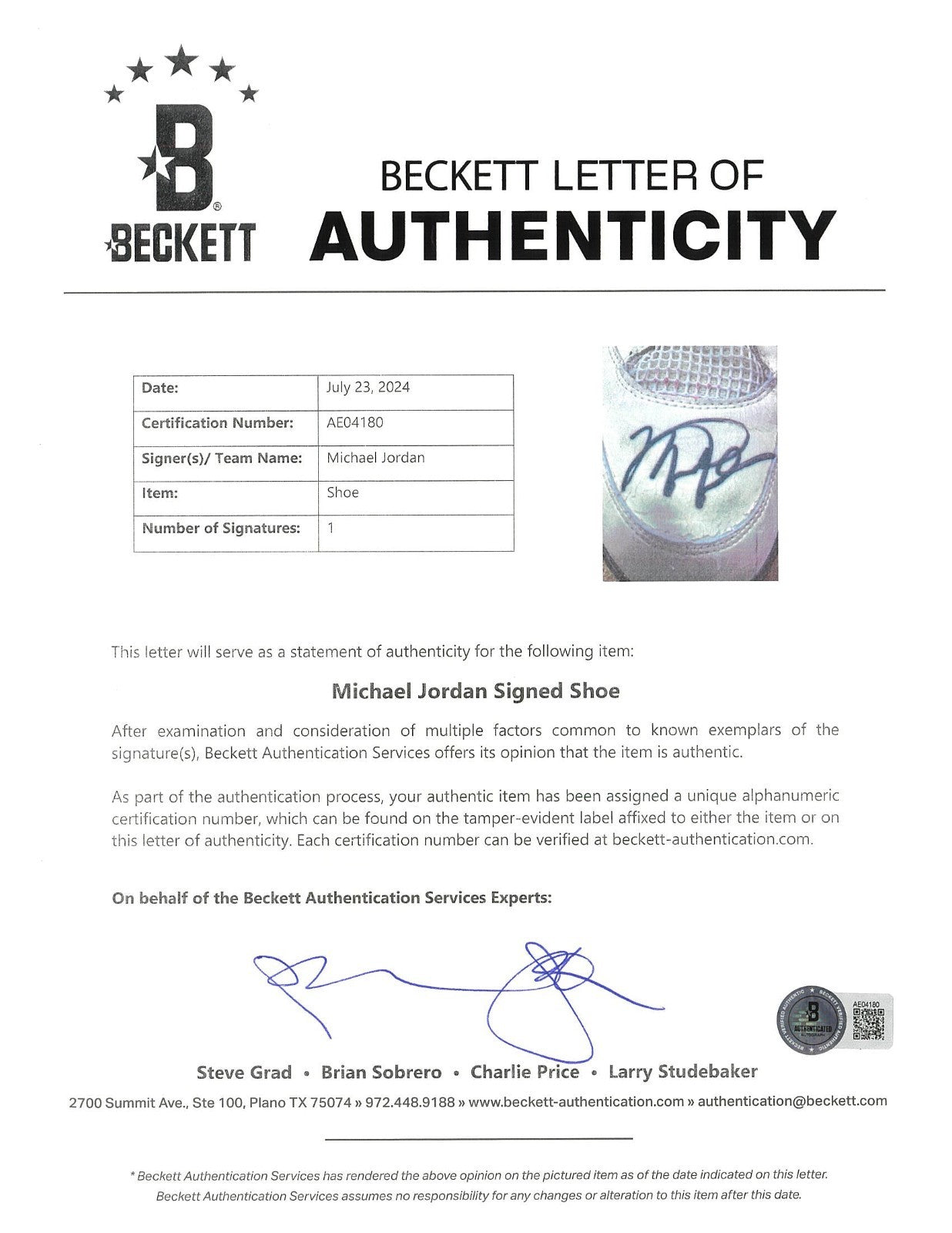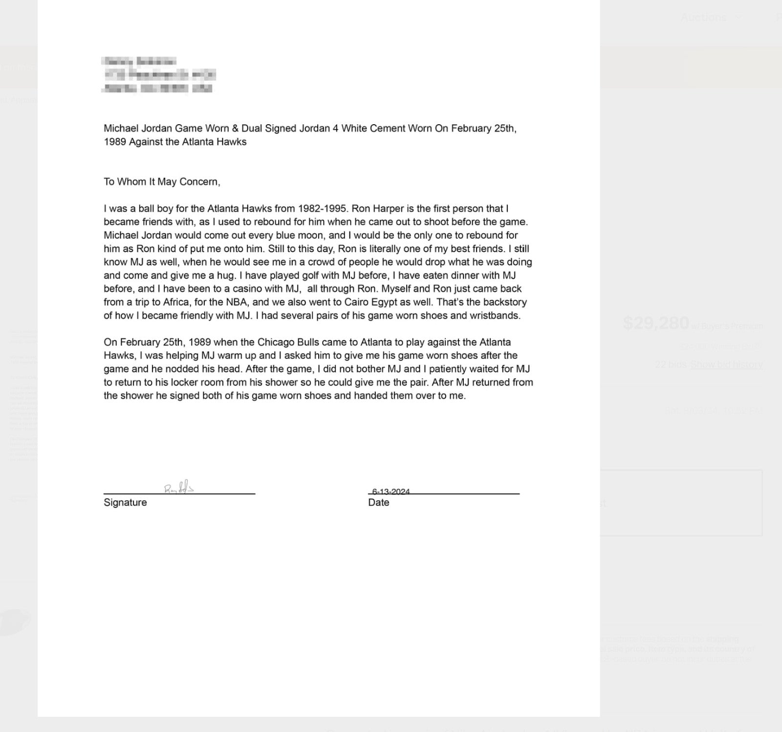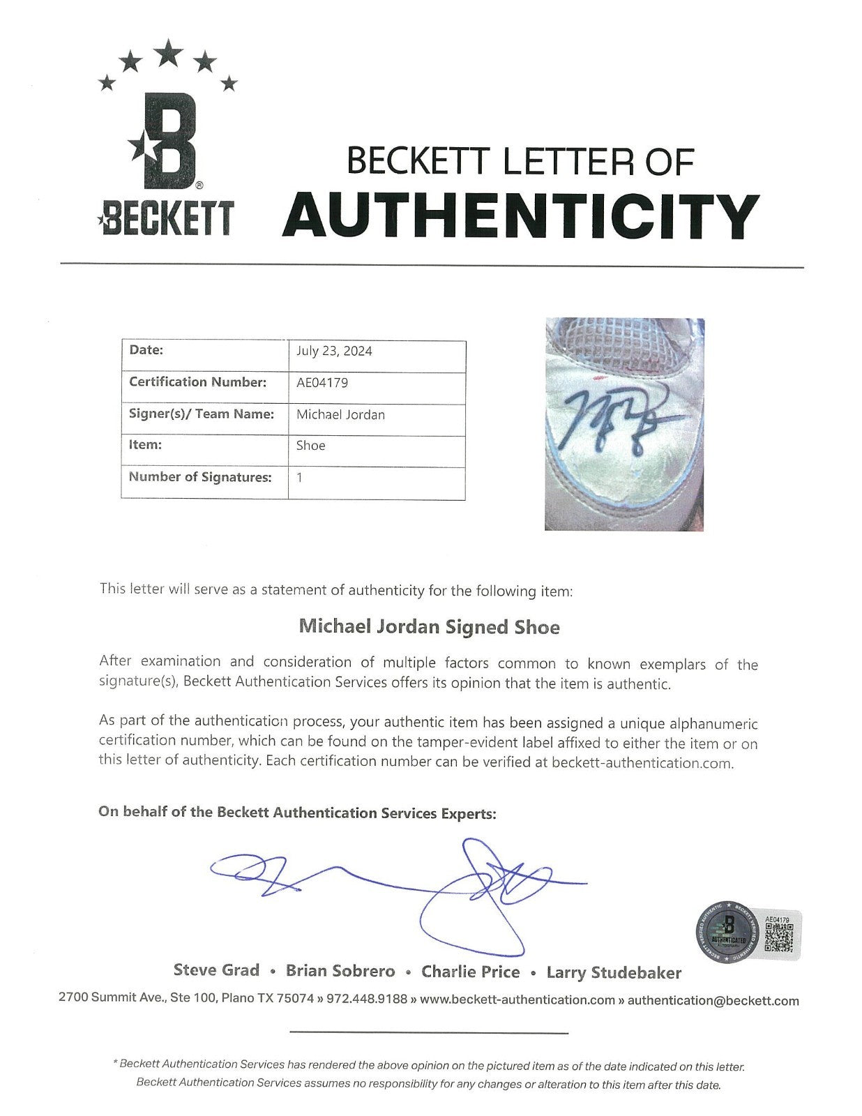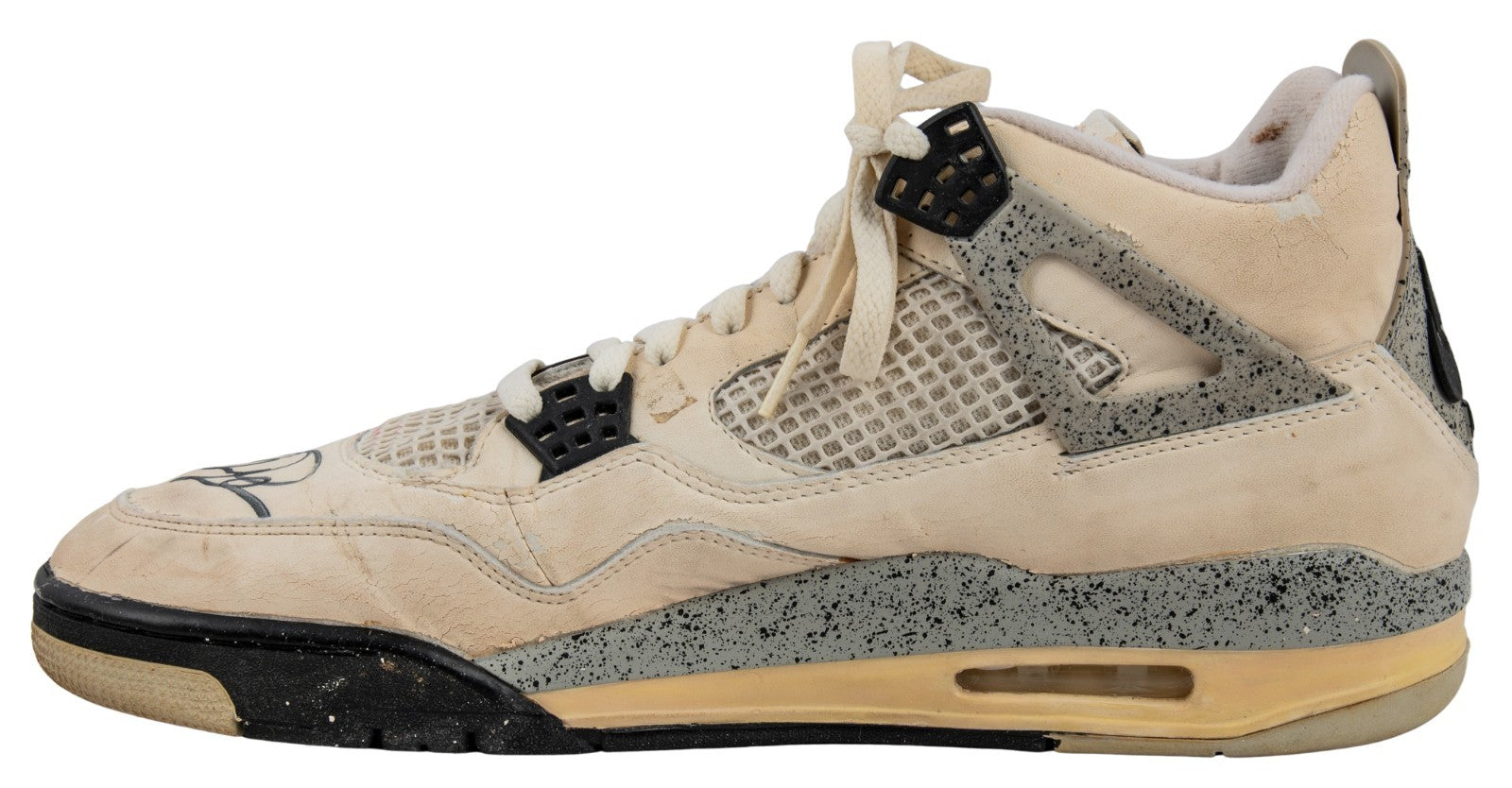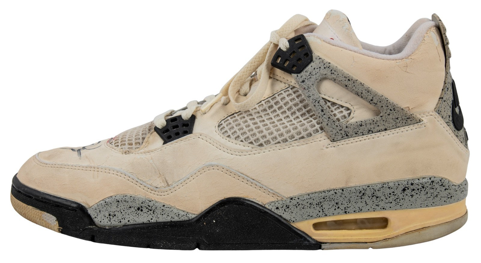 Presented is a pair of Nike Jordan Brand basketball sneakers used by NBA Hall of Famer and basketball icon Michael Jordan during the 1988-89 NBA regular season. Jordan's evolution into the Association's leading scorer was already complete by year no. 5 of his already impressive career; coming off his first MVP Award, Jordan led the Association in scoring for the third consecutive year with an average of 32.5 points per game, while adding 8.0 total rebounds and 8.0 assists in 81 games played. The sneakers exhibit a black/gray/white colorway and have been signed by Jordan, who has penned his flowing signature in black marker across each toe box. Accompanying the sneakers is an LOA from Sports Investors Authentication, who state that they "believe these sneakers very closely align with the shoes Michael Jordan wore during a Bulls' road game against the Hawks on February 25, 1989." In that game, the Hawks defeated the Bulls 125-95, with Jordan recording a team-high 18 points with 5 total rebounds and 3 assists, as well as 3 steals. SIA concludes, "The clarity of the photos from this game do not allow us to say with absolute certainty that these shoes are photo matched. However, all evidence supports and suggests these being an apparent match to the sneakers worn by Michael Jordan during the Bulls' road game against the Rockets on February. 25, 1989." The sneakers exhibit extensive wear. Size "13" manufacturer's tag are affixed to the interior of the sneakers. Letter of Opinion from Sports Investors Authentication. LOAs from Beckett (AE04179, AE04180) for signatures. Full Letter COA's from GOAT Authentics. This originally had an LOP from the Ball Boy but it was misplaced.