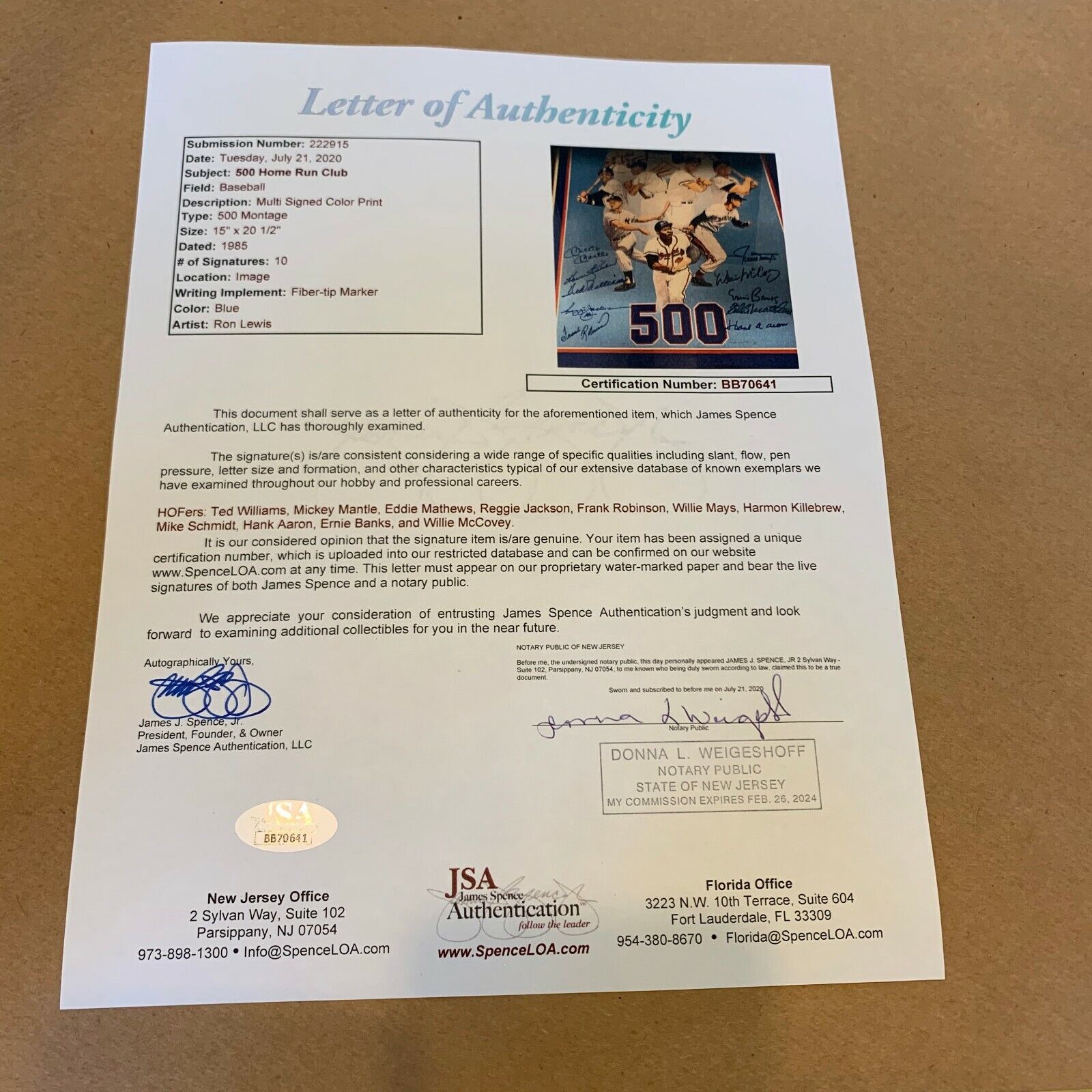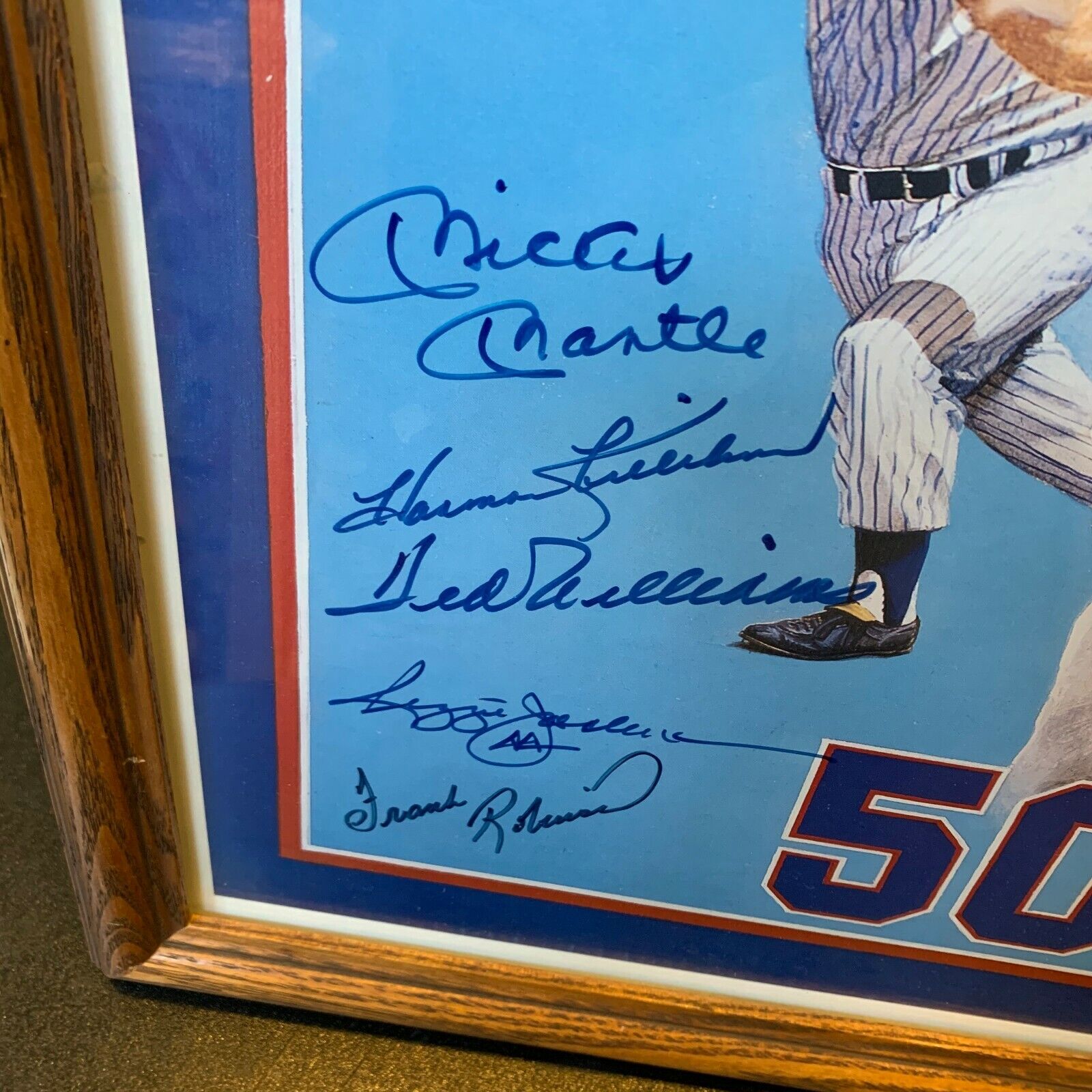 Presented here is a 500 Home Run Club 16x20 lithograph signed by 10 members of the National Baseball Hall of Fame. This lithograph, by the famed sports artist Ron Lewis, has been signed by Willie Mays, Ted Williams, Mickey Mantle, Willie McCovey, Ernie Banks, Eddie Mathews, Hank Aaron, Reggie Jackson, Frank Robinson, and Harmon Killebrew. Custom framed. Full letter JSA COA.