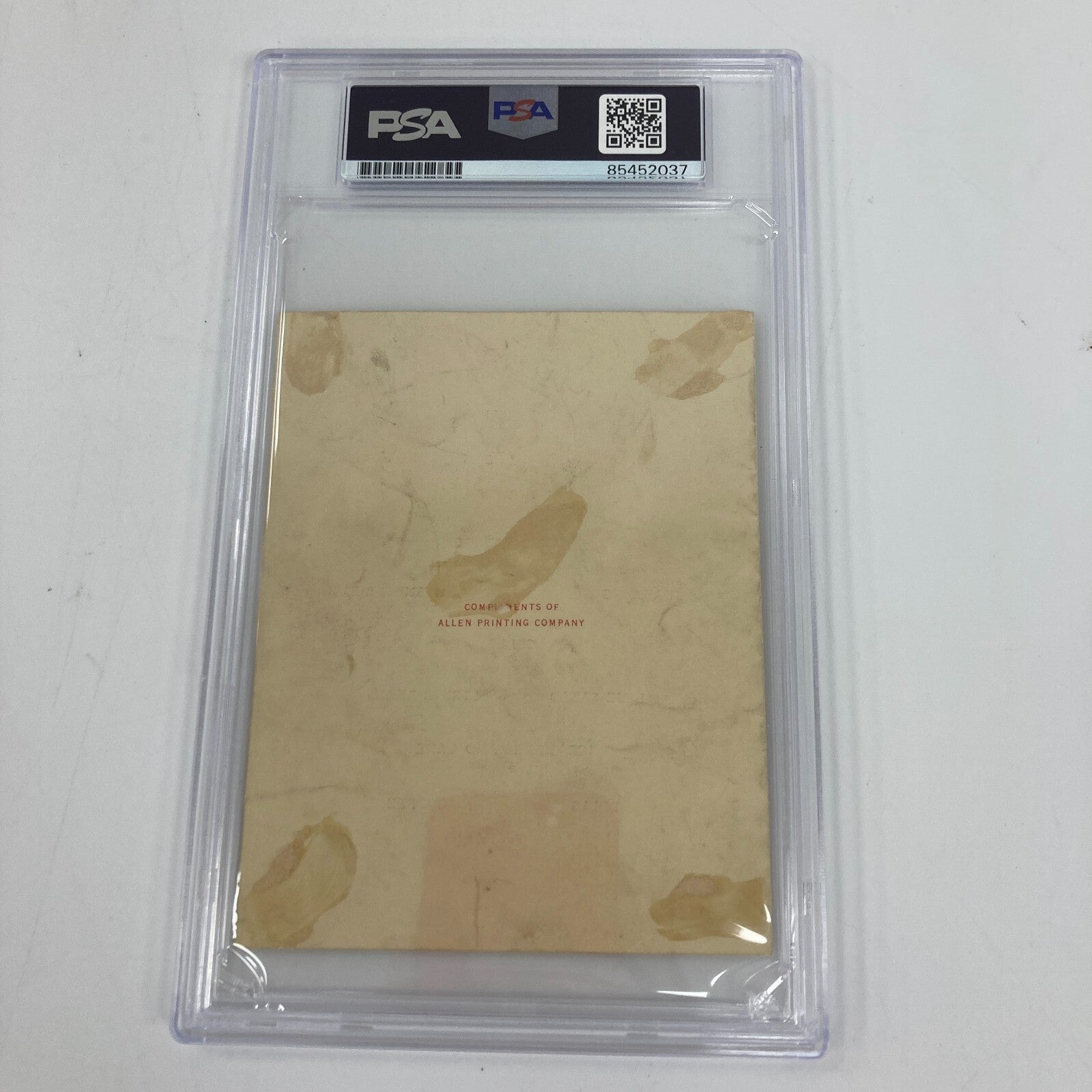 All-American halfback and 1939 Heisman Trophy winner (1918–1943) who became a United States Navy aviator during World War II and died in a training flight off the coast of Venezuela. Rare pencil signature, "Nile Kinnick," on a 3.5 x 4.5 menu from the "1940 Lyons Club Seventh Annual Football Banquet and Ladies Night," which featured the All-American halfback as its guest speaker. In fine condition. Encapsulated in a PSA/DNA authentication holder.