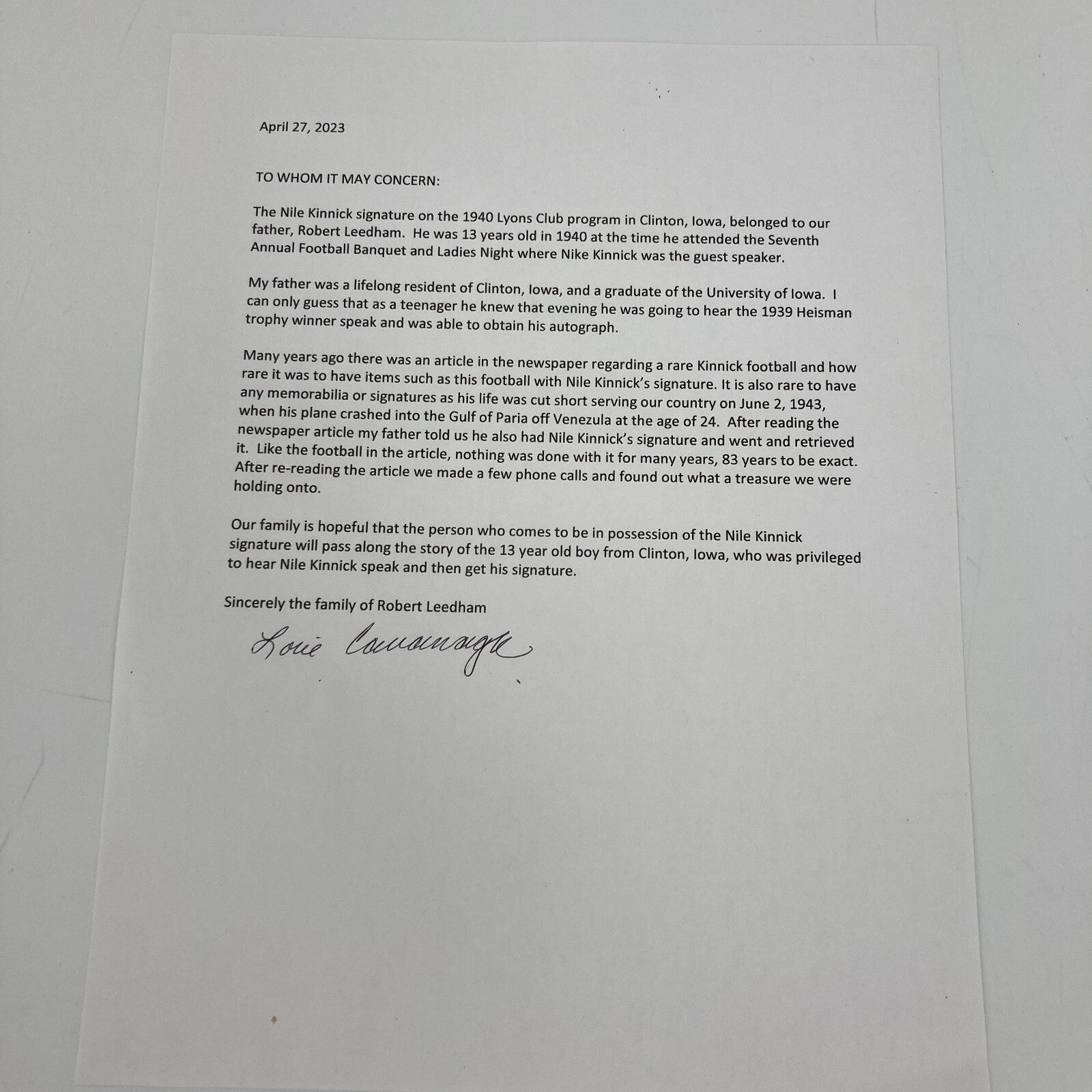 Accompanied by a letter of provenance, in part: "The Nile Kinnick signature on the 1940 Lyons Club program in Clinton, Iowa, belonged to our father, Robert Leedham. He was 13 years old in 1940 at the time he attended the Seventh Annual Football Banquet and Ladies Night where Nike Kinnick was the guest speaker. My father was a lifelong resident of Clinton, Iowa, and a graduate of the University of Iowa. I can only guess that as a teenager he knew that evening he was going to hear the 1939 Heisman trophy winner speak and was able to obtain his autograph."