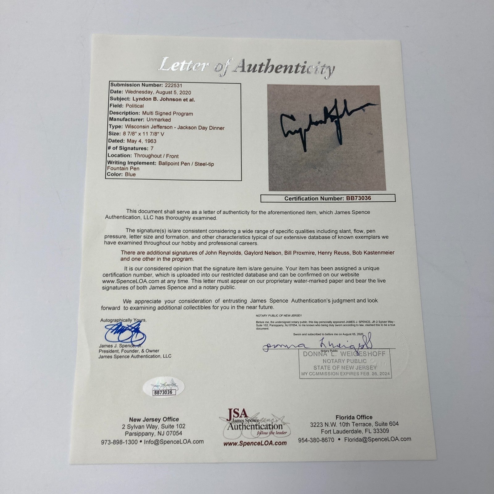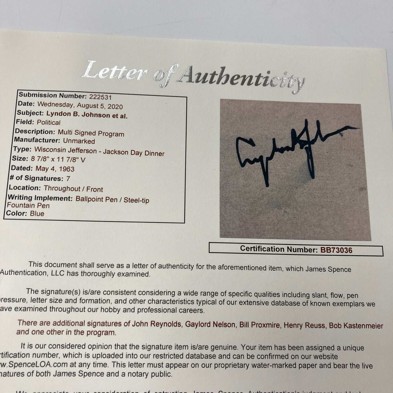 President Lyndon B. Johnson Signed 1963 Program Photo With full letter JSA COA