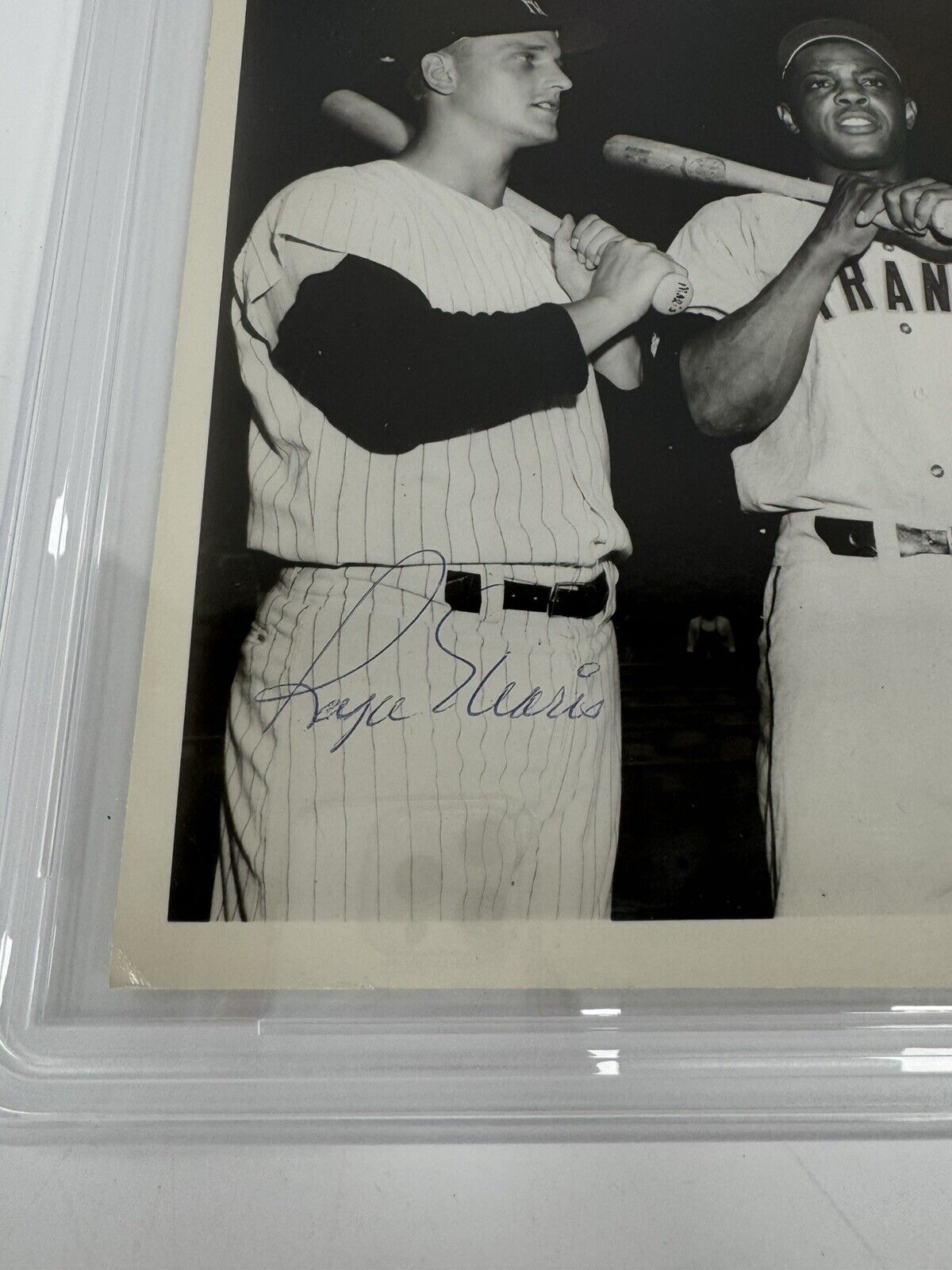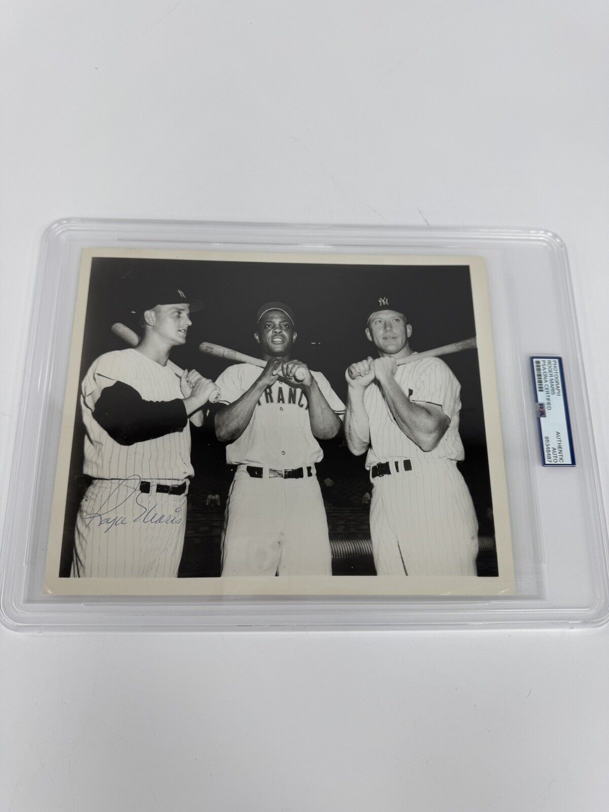 TRIPLE THREAT!!! Maris, Mays and Mantle each left an indelible mark on Major League Baseball. Photos including all three represent a rare intersection of their HOF careers. This 8" x 10" photo was likely taken prior to an exhibition game at Yankee stadium on July 24, 1961. Roger Maris has signed on his image in blue ballpoint pen. A significant historic photo for your collection! PSA encapsulated and graded Authentic. PSA/DNA Certified.