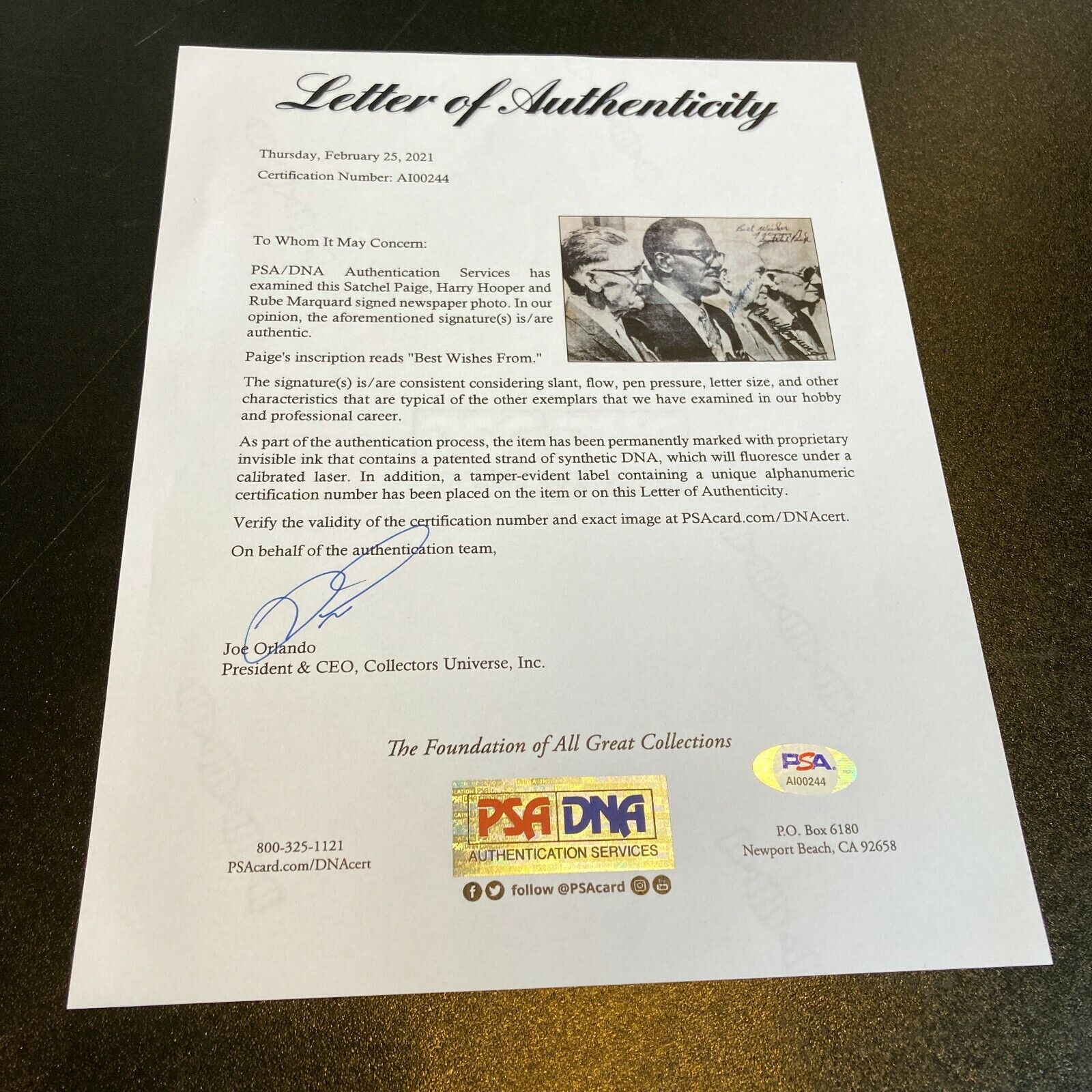 Satchel Paige Harry Hooper Rube Marquard Signed 1971 HOF Induction Photo PSA DNA. Approximately 6.5”x4.25”.