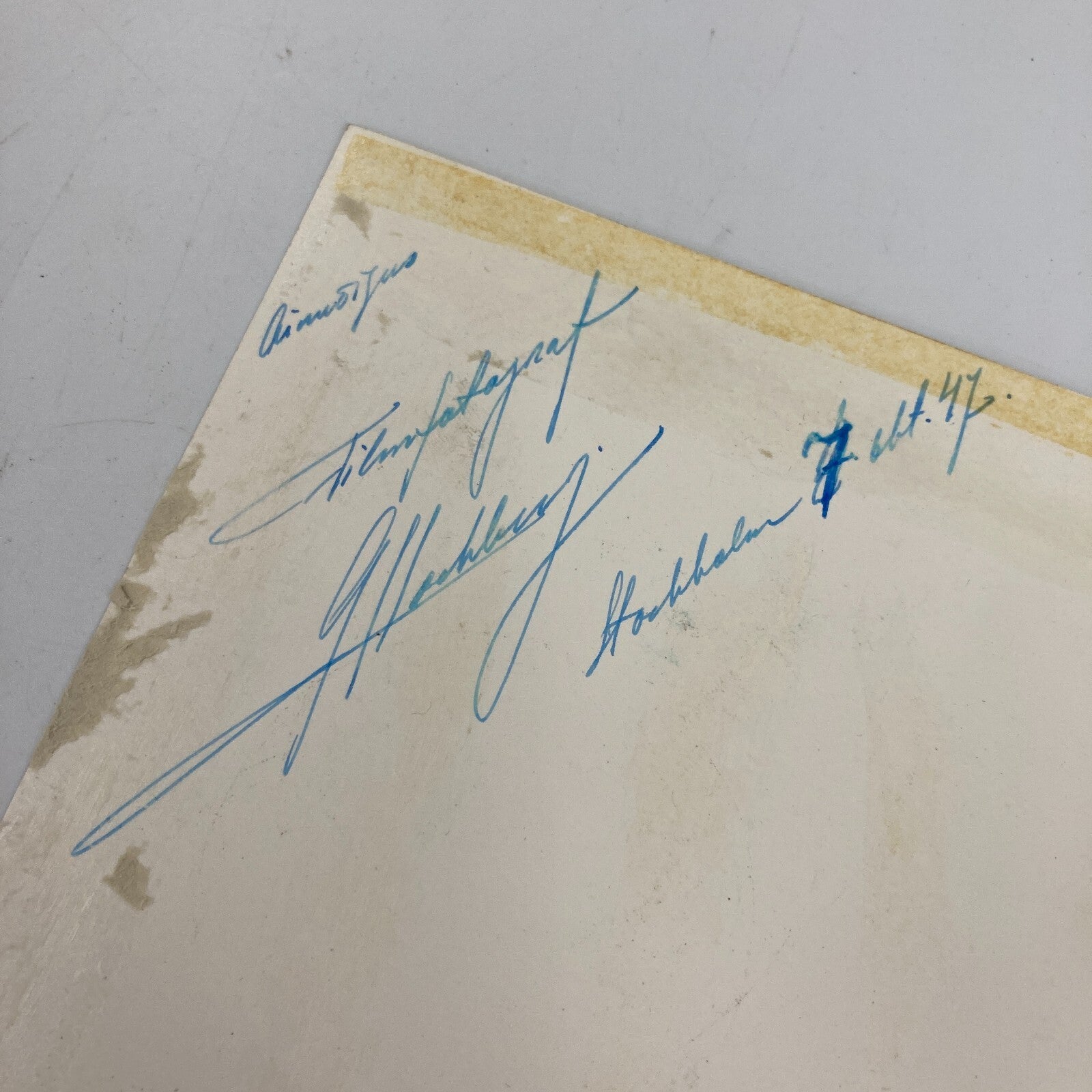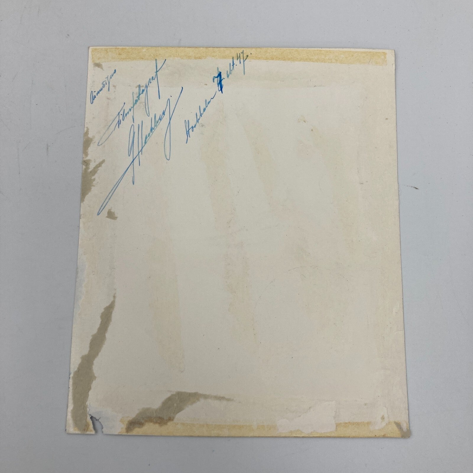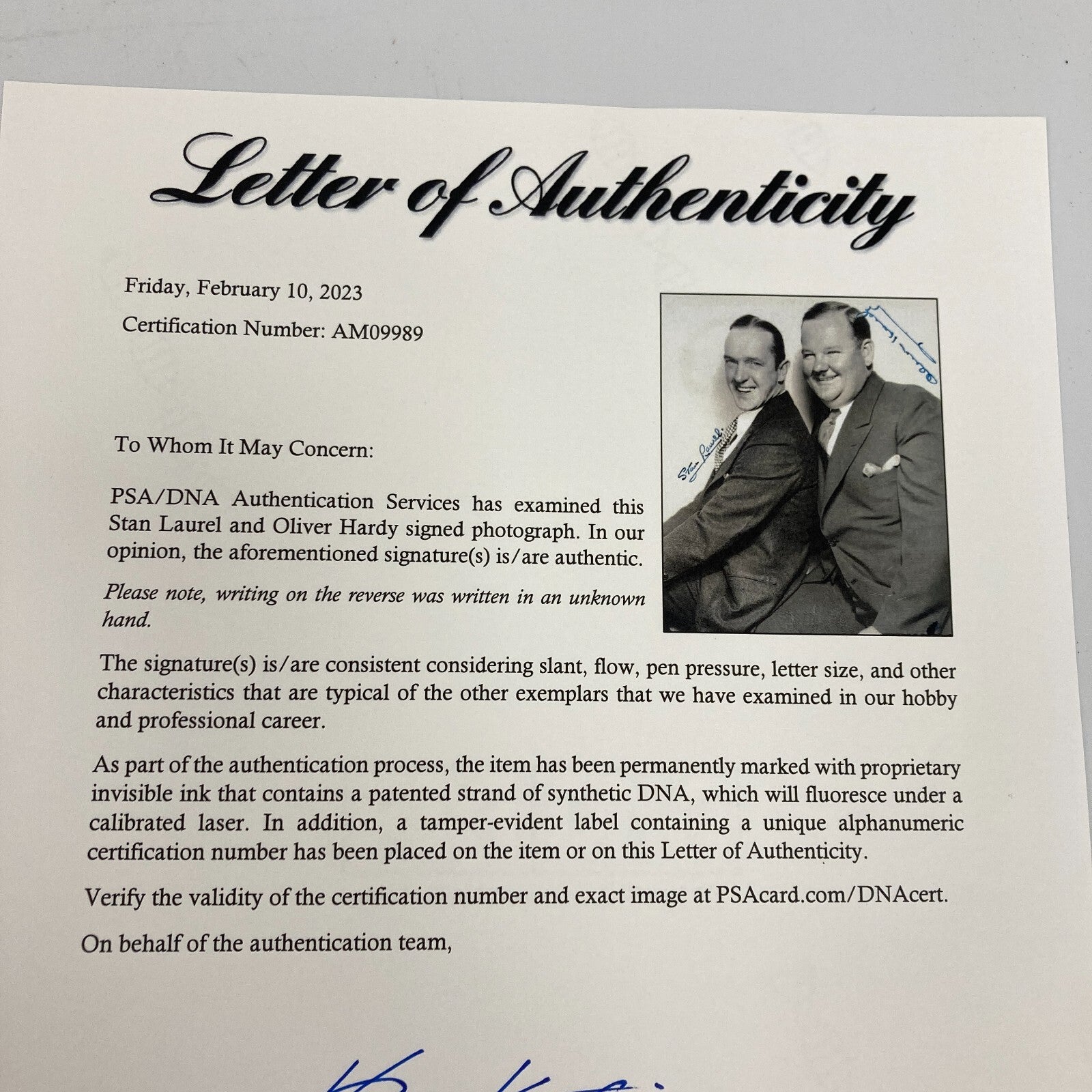 Presented is a 8x10 photograph signed by English comic duo Stan Laurel and Oliver Hardy. Both have penned their flowing signature in blue ink adjacent to their respective likeness. The photograph exhibits moderate wear from handling and comes with an LOA from PSA/DNA for signature.