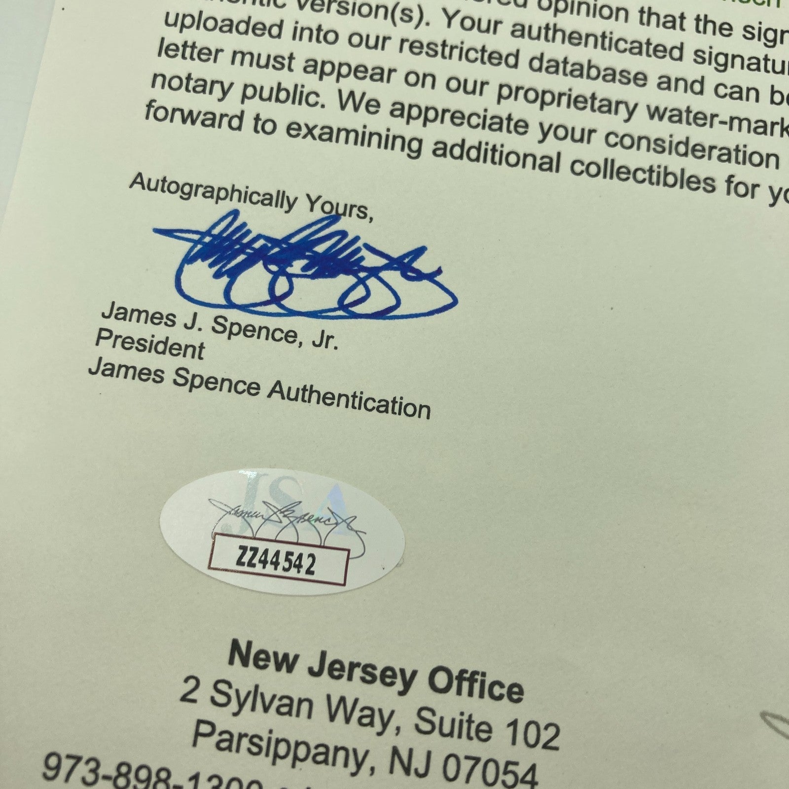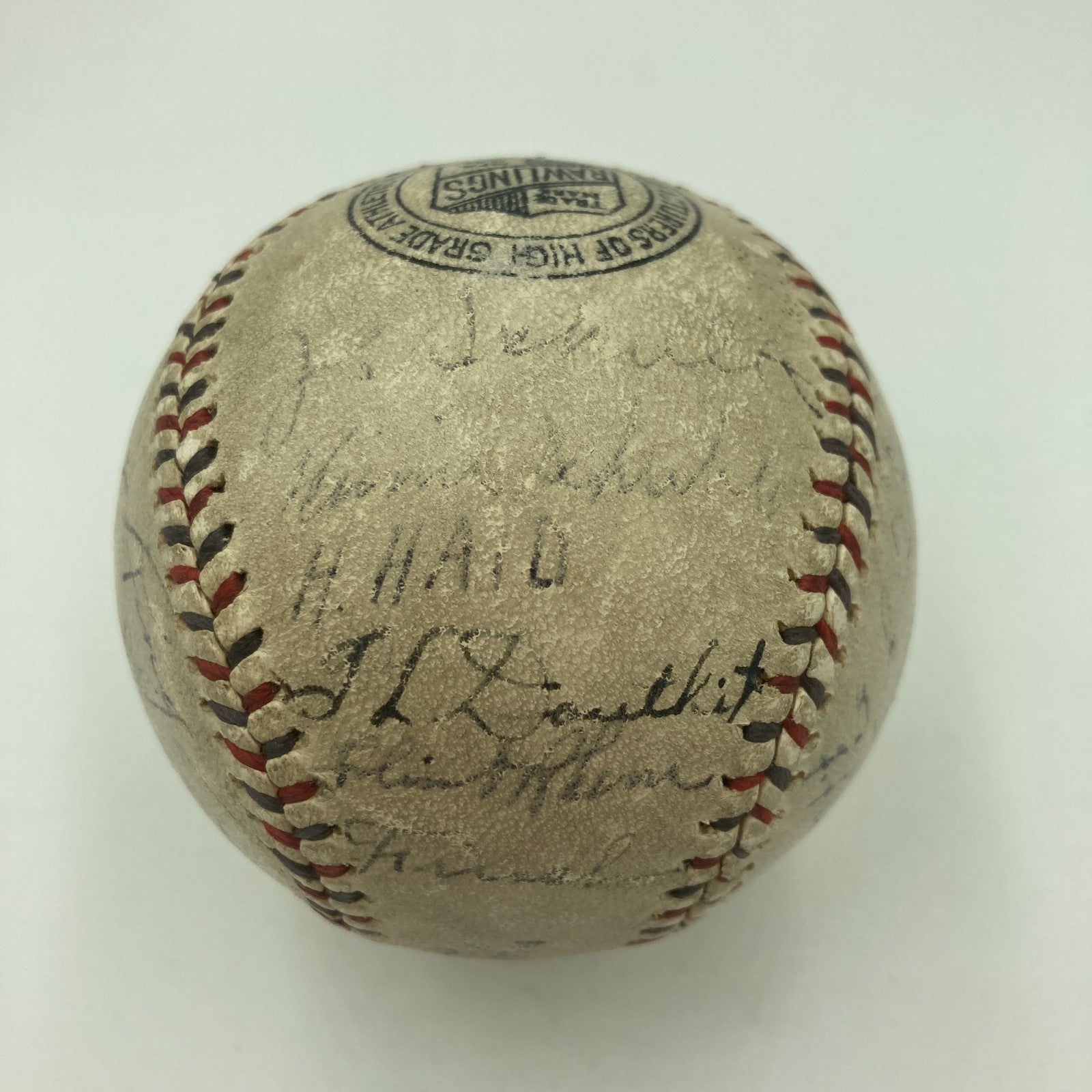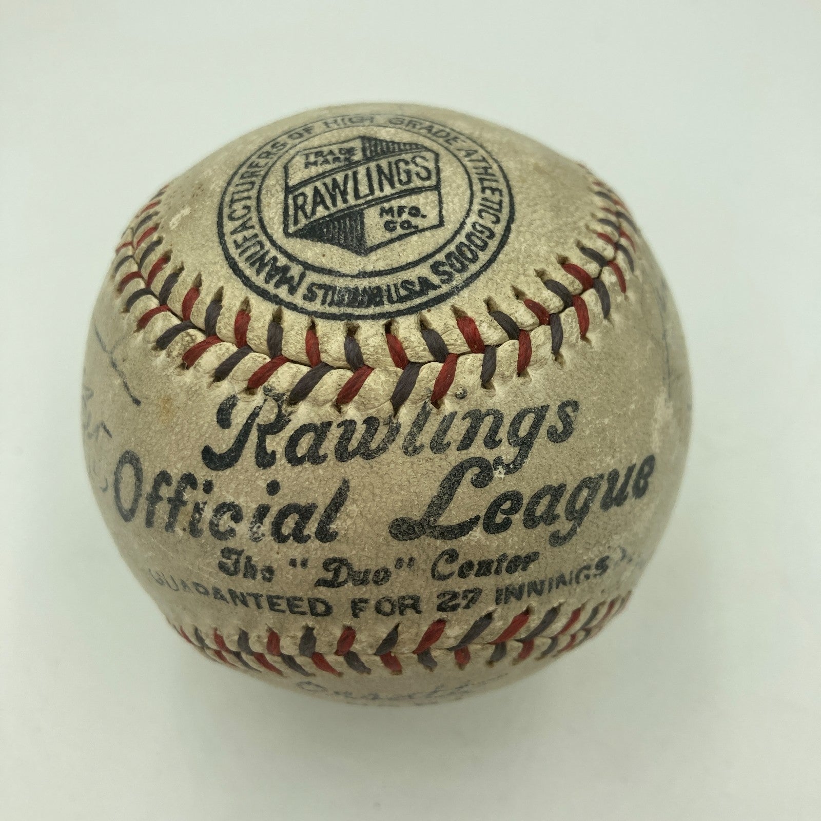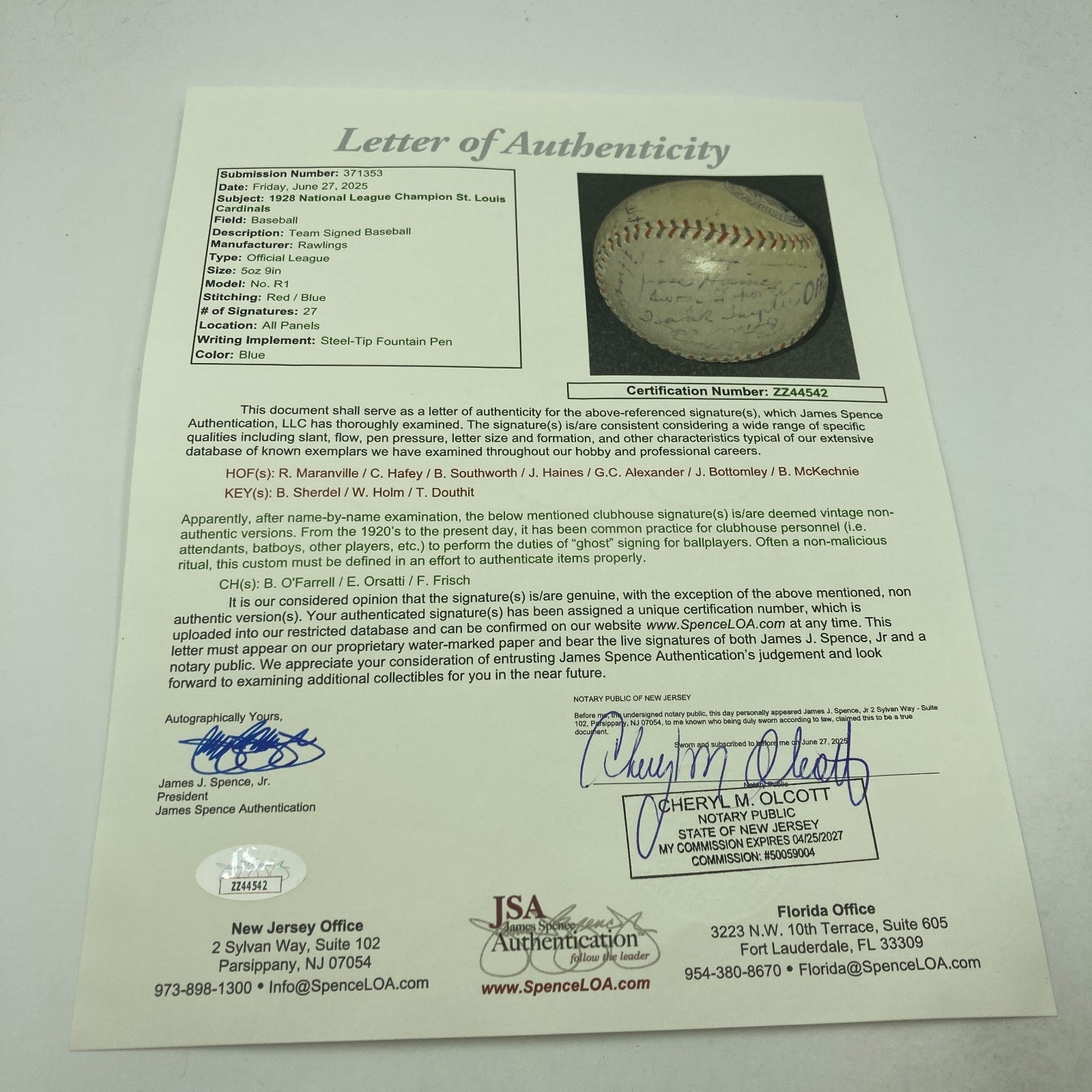 Rawlings "Official League" baseball signed in black ink by 27 members of the 1928 National League Champion St. Louis Cardinals, including Grover Cleveland Alexander, Jim Bottomley, Chick Hafey, Jesse Haines, Rabbit Maranville, Billy Southworth, Bill McKechnie, Reinhart, H. Bell, Ring (played for Cardinals only in 1927), Thevenow, Holm, Toporcer, Snyder, Frankhouse, Rhem, Douthit, Blades (sweet spot), Littlejohn (played for Cardinals only in 1927 and 1928), and eight we could not identify. (Frank Frisch, Ernie Orsatti, and Bob O'Farrell have been deemed clubhouse by JSA.) All of the manufacturer’s stampings remain bold and legible. In Very Good condition overall. Full LOA from James Spence/JSA.