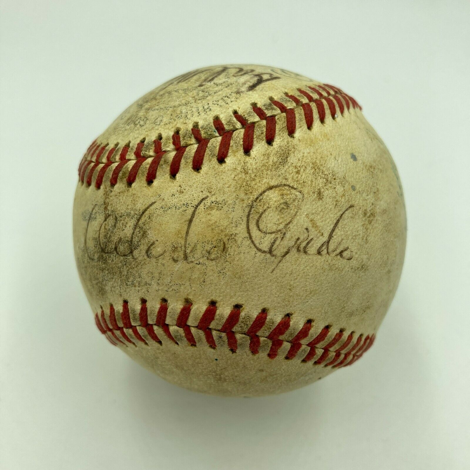 The latter five penned their signatures to this Official National League (Heydler) baseball.From the west panel and extending into the sweet spot we find the signature of Rogers Hornsby; then on the east panel extending into the sweet spot, there appears Capt. Charlie Grim ; Hack Wilson and Riggs Stephenson signed the north panel, and the south panel holds Kiki Cuyler (along with a small stamping “Courtesy of Majestic Radio”). Impressive as all this might be, however, there’s penned beneath Grimm’s signature a handwritten inscription, “Murderer’s Row Chicago Cubs Champions 1929.” These five masters at the bat recorded a .351 average, with 120 home runs, and 611 RBI in that pennant-winning 1929 season.