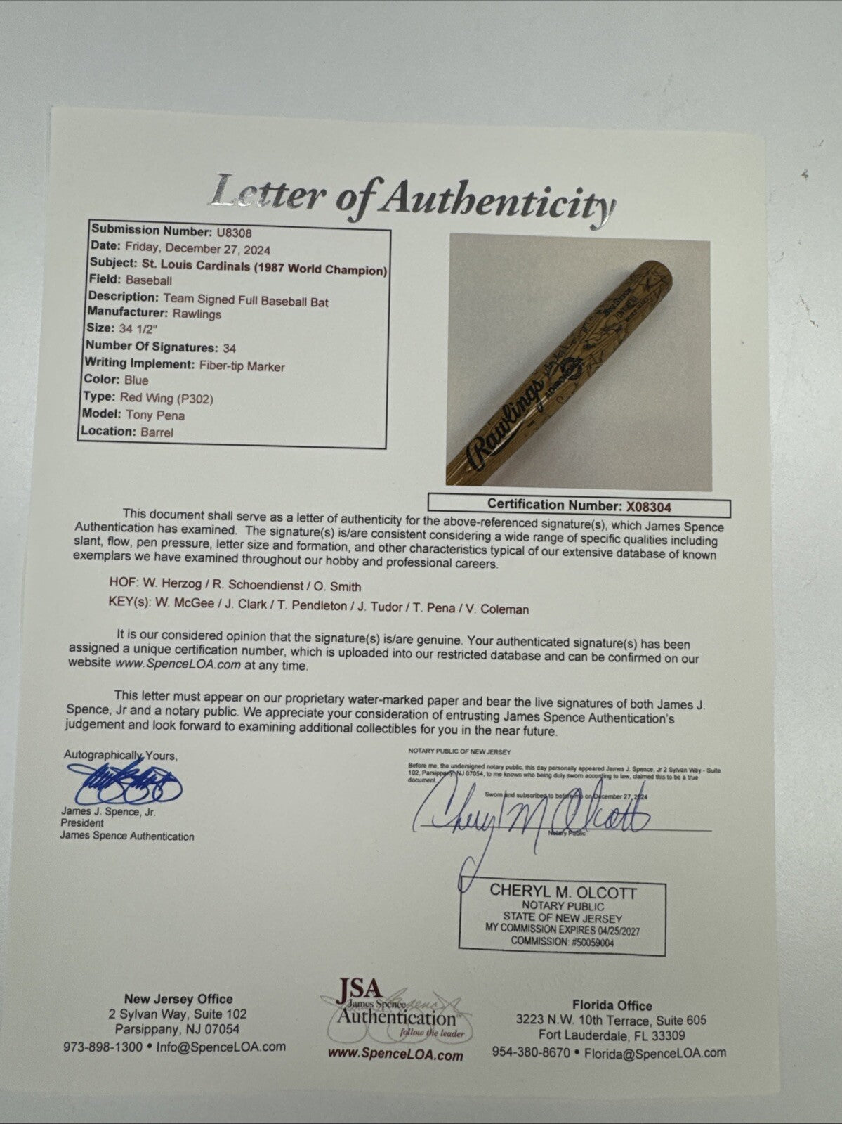 1987 St. Louis Cardinals NL Champs Team Signed World Series Game Issued Bat. 34 signatures withW. Herzog / R. Schoendienst / O. Smith, W. McGee / J. Clark / T. Pendleton / J. Tudor / T. Pena / V. Coleman and many others. Certified by JSA with a hologram and COA
