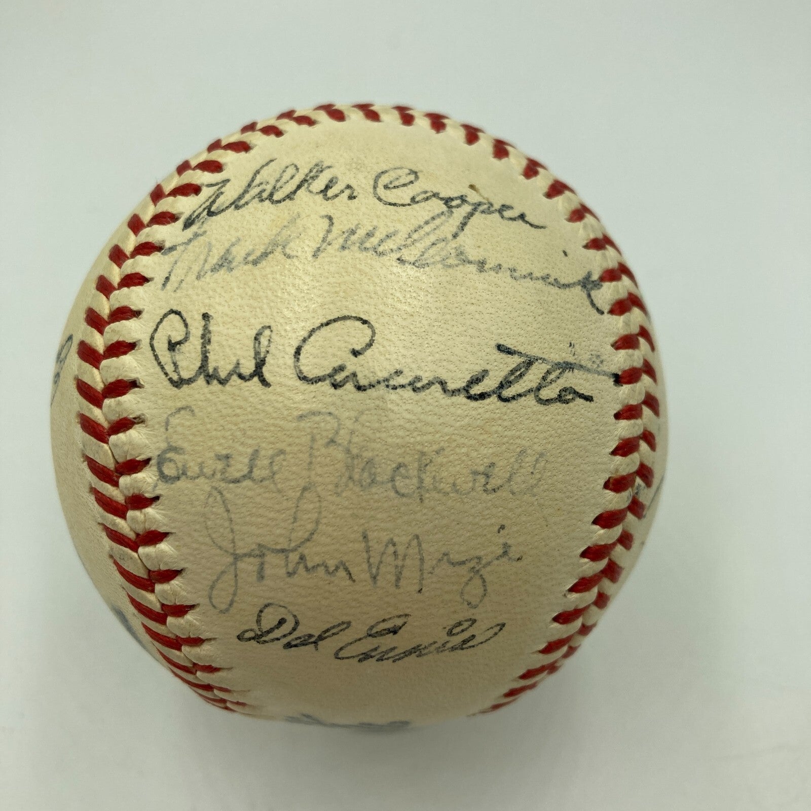 1946 National League All-Star Team. Twenty black fountain-pen signatures on an Official National League (Frick) ball, including Phil Masi, Stan Musial, Dixie Walker, Johnny Mize, Enos Slaughter, Red Schoendienst, Charlie Grimm (Mgr.), Dixie Walker, Peanuts Lowrey (sweet spot), Claude Passeau (sweet spot), Johnny Hopp, Whitey Kurowski, Walker Cooper, Ewell Blackwell, Phil Cavarretta, Kirby Higbe, and Del Ennis. The black-ink notation "National League All-Stars 46" is written on a side panel.