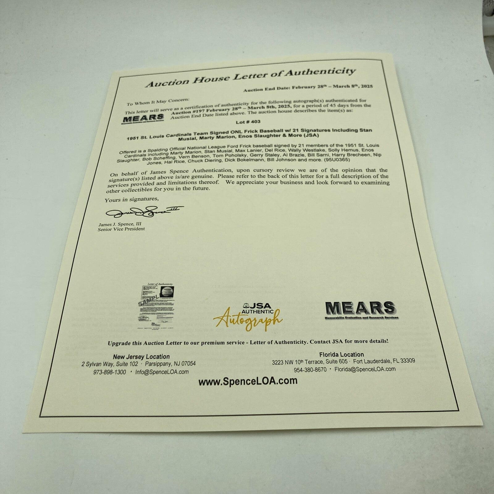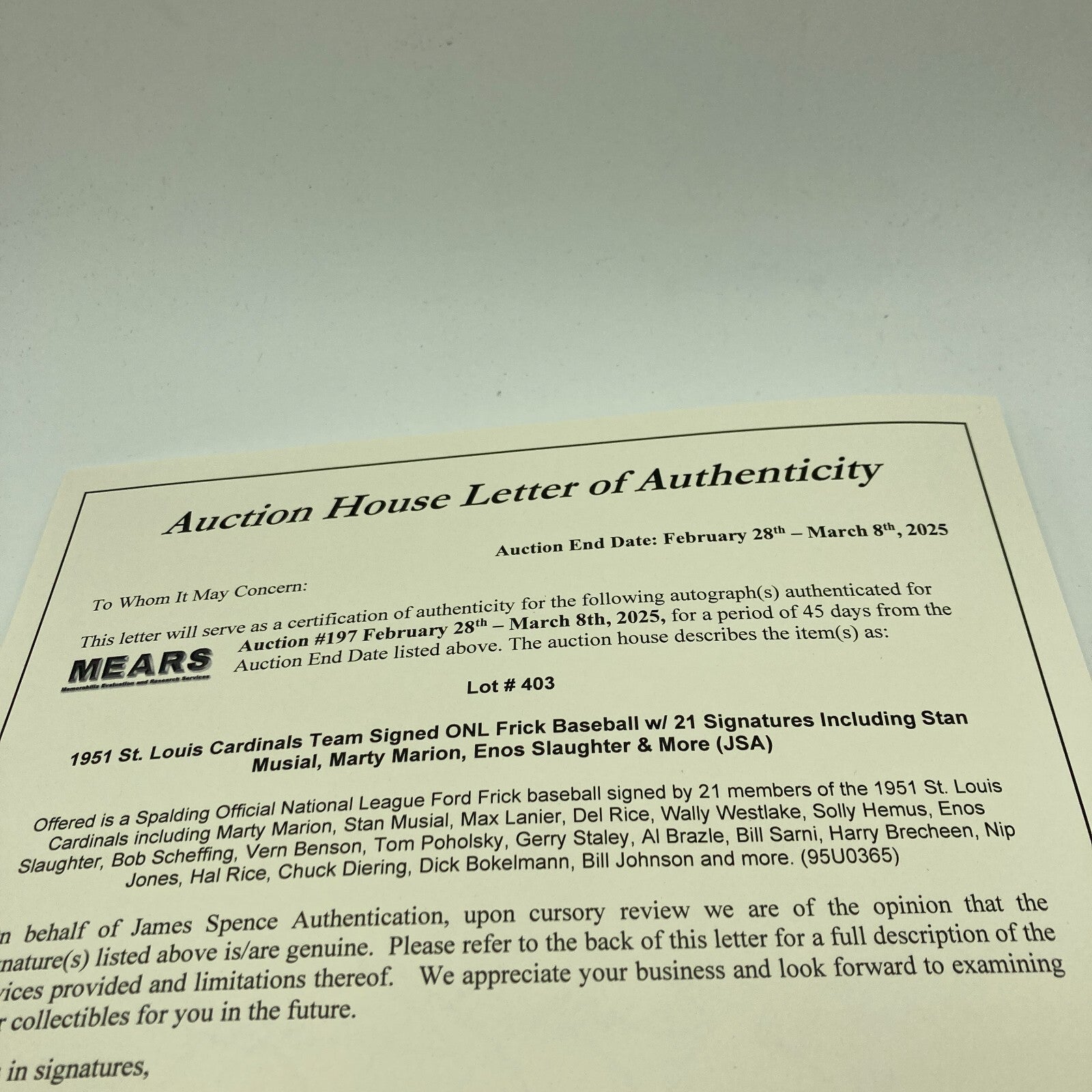 Offered is a Spalding Official National League Ford Frick baseball signed by 21 members of the 1951 St. Louis Cardinals including Marty Marion, Stan Musial, Max Lanier, Del Rice, Wally Westlake, Solly Hemus, Enos Slaughter, Bob Scheffing, Vern Benson, Tom Poholsky, Gerry Staley, Al Brazle, Bill Sarni, Harry Brecheen, Nip Jones, Hal Rice, Chuck Diering, Dick Bokelmann, Bill Johnson and more.