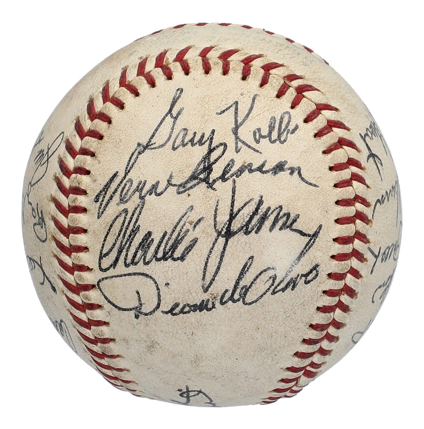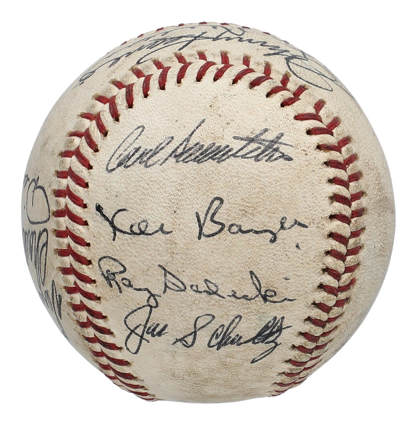 This offered Official American League Joseph Cronin baseball contains the signatures of 15 members of the 1963 St. Louis Cardinals Spring Training squad. The ball features key signatures from Hall of Famer Stan Musial, Ken Boyer, Joe Schultz, Howie Pollet, Ray Washburn, Dick Groat, Gary Kolb, Vern Benson, and Diomedes Olivo. The ball contains toning and comes with an LOA from JSA for the signatures.