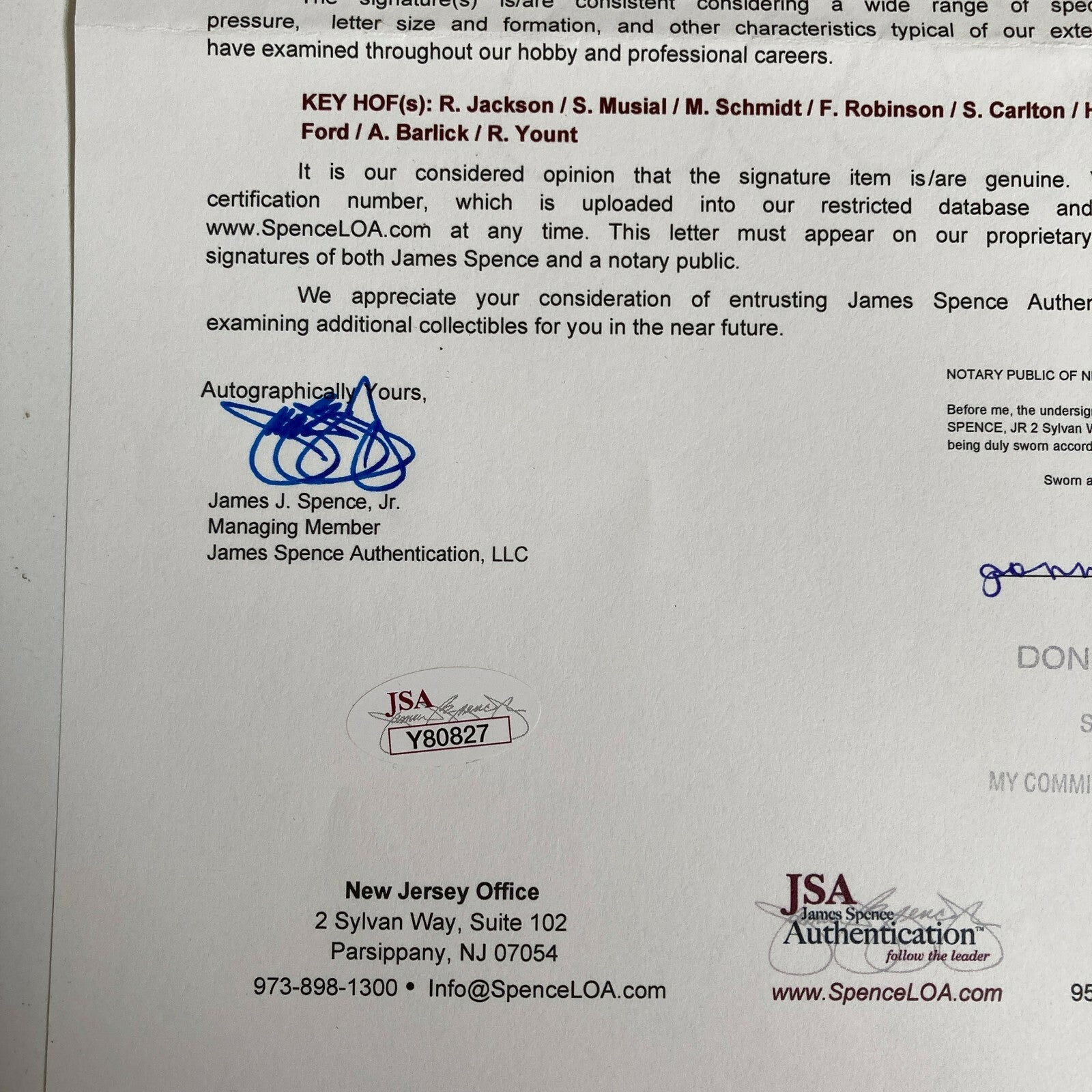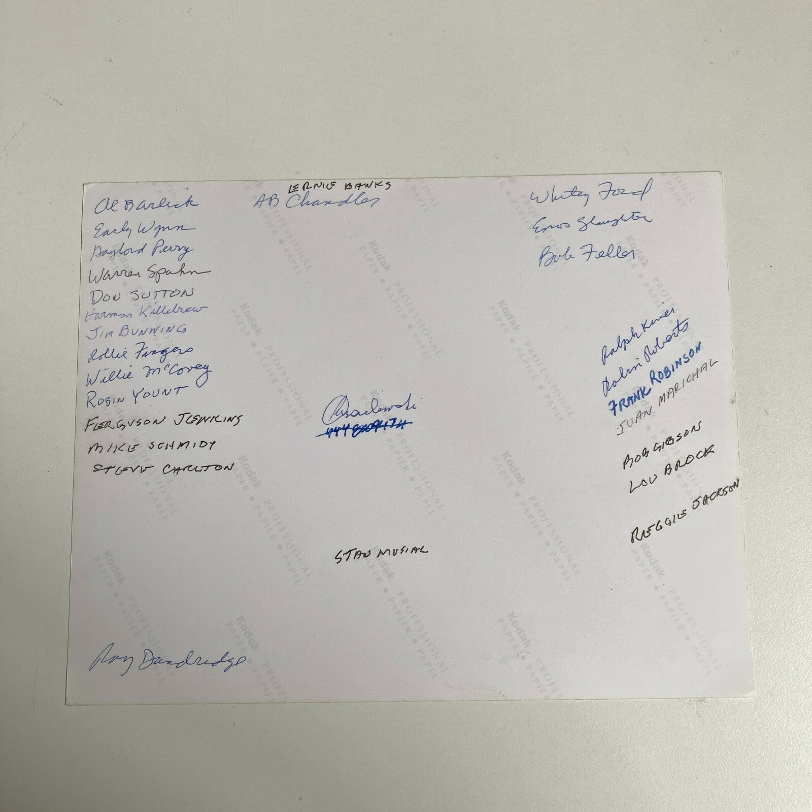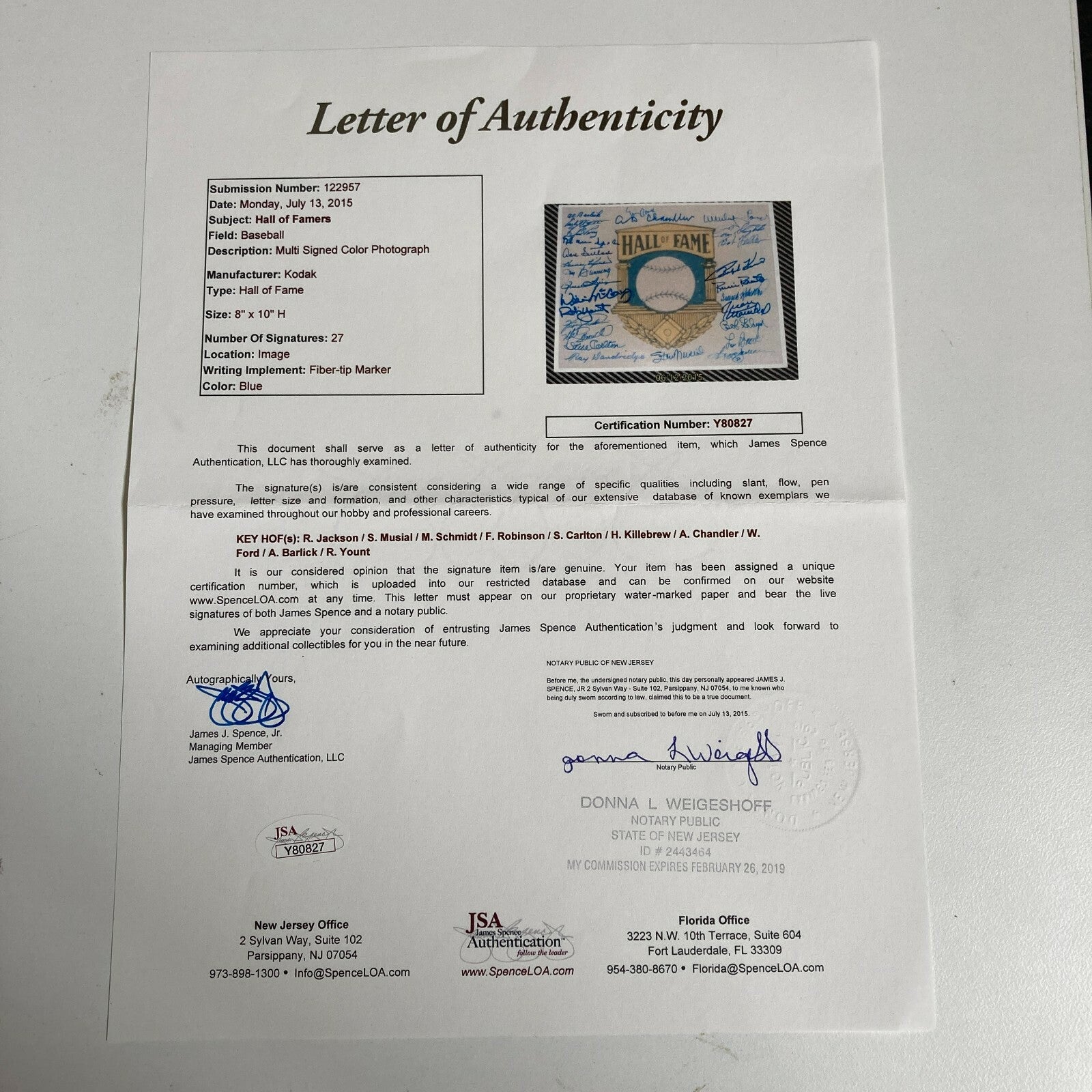 Baseball Hall of Famers have signed this 8 x 10 photograph, including key signatures of Reggie Jackson, Stan Musial, Mike Schmidt, Frank Robinson, Whitey Ford, Steve Carlton, Harmon Killebrew, Al Barlick, Robin Yount & A. Chandler. The photograph features 27 signatures. Very good condition. Comes with a James Spence Authentication (JSA) Letter of Authenticity
