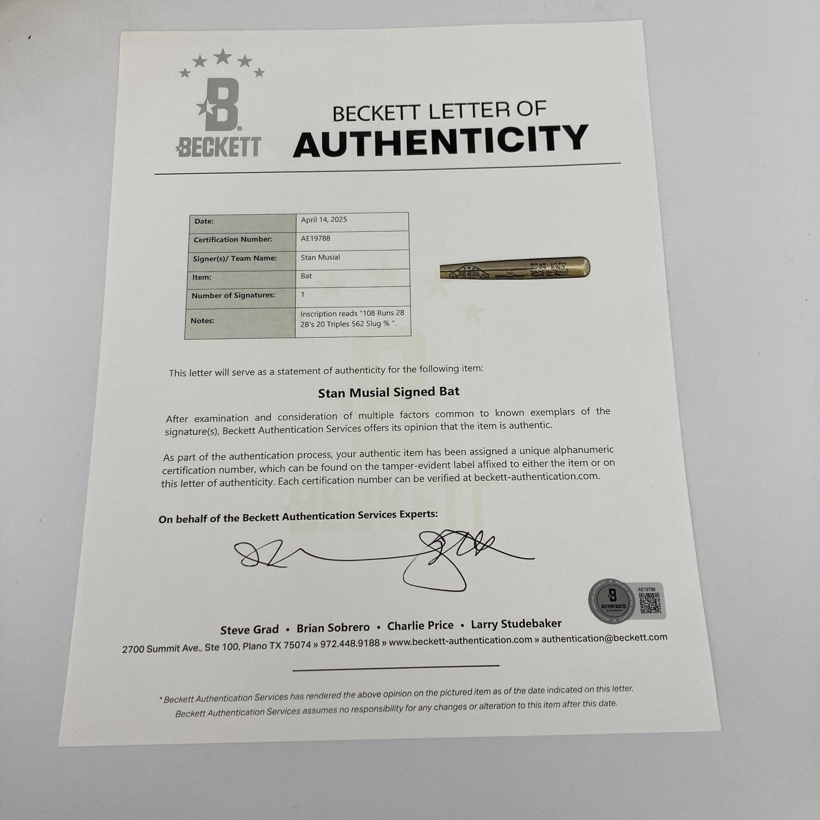 Stan Musial Batting Champion Signed Inscribed STATS Silver Baseball Bat Beckett