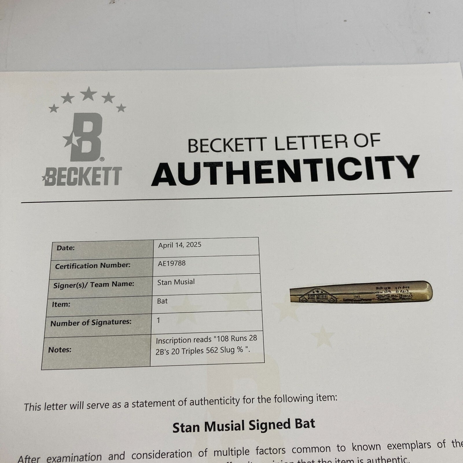 Stan Musial Signed & Inscribed Commemorative Bat. Stan Musial, a St. Louis Cardinals legend, was a 24-time All-Star, three-time MVP, and three-time World Series champion. He amassed 3,630 hits and a .331 batting average. Here we presented a commemorative 34" bat that is signed and inscribed with various stats by Stan the Man. Signed in NM black sharpie, the bat has a 10" crack in the metallic portion of the barrel. Full LOA from Beckett Authentication Services.