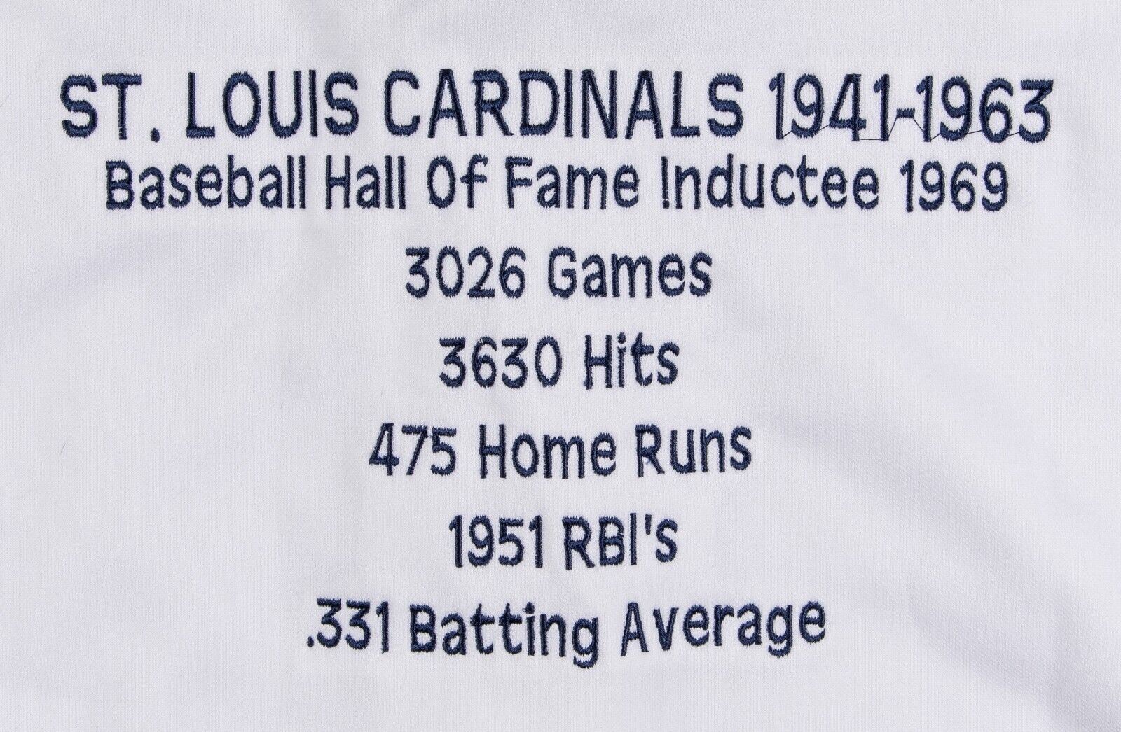 Presented is a St. Louis Cardinals jersey embroidered with the career stats of Hall of Fame Cardinals slugger Stan Musial. Musial has penned his flowing signature in silver marker on his number "6" on the jersey's back. A summary of Musial's career statistics is embroidered in black lettering and numbering on the back of the jersey below his number, along with the year of his Hall of Fame induction. The jersey comes with a COA from JSA (A38340) for signature.