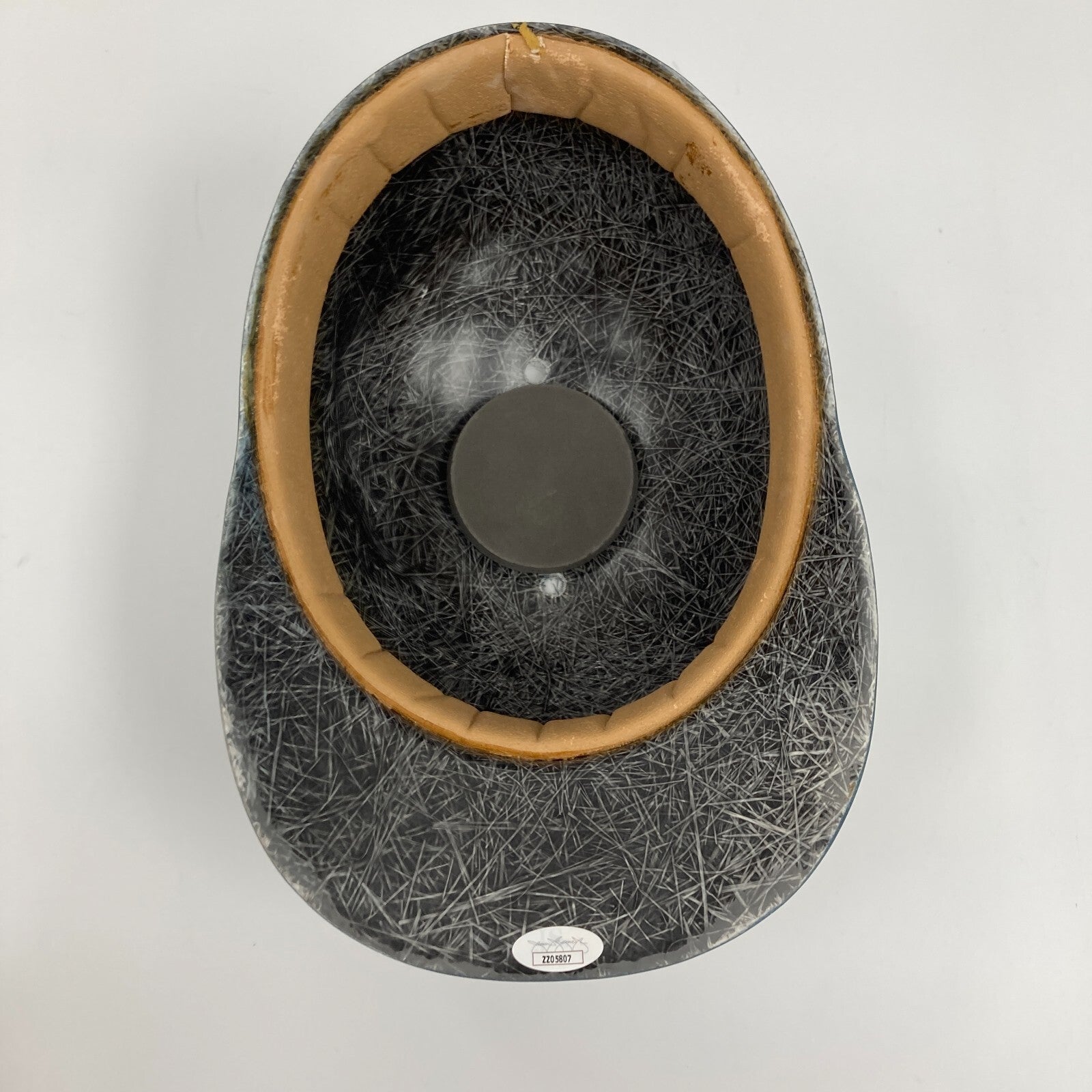 The offered full size batting helmet has no listed size but is large enough to fit some adults. The blue helmet has a red dot at the top center, and it sports the interlocking St. Louis Cardinals' logo on the front. It has some interior padding. The helmet shows good use, with many small scratches on the top and brim. Musial signed the brim in silver as "Stan The Man' Musial."