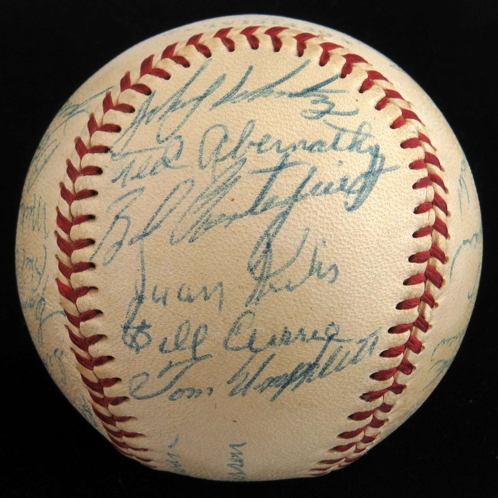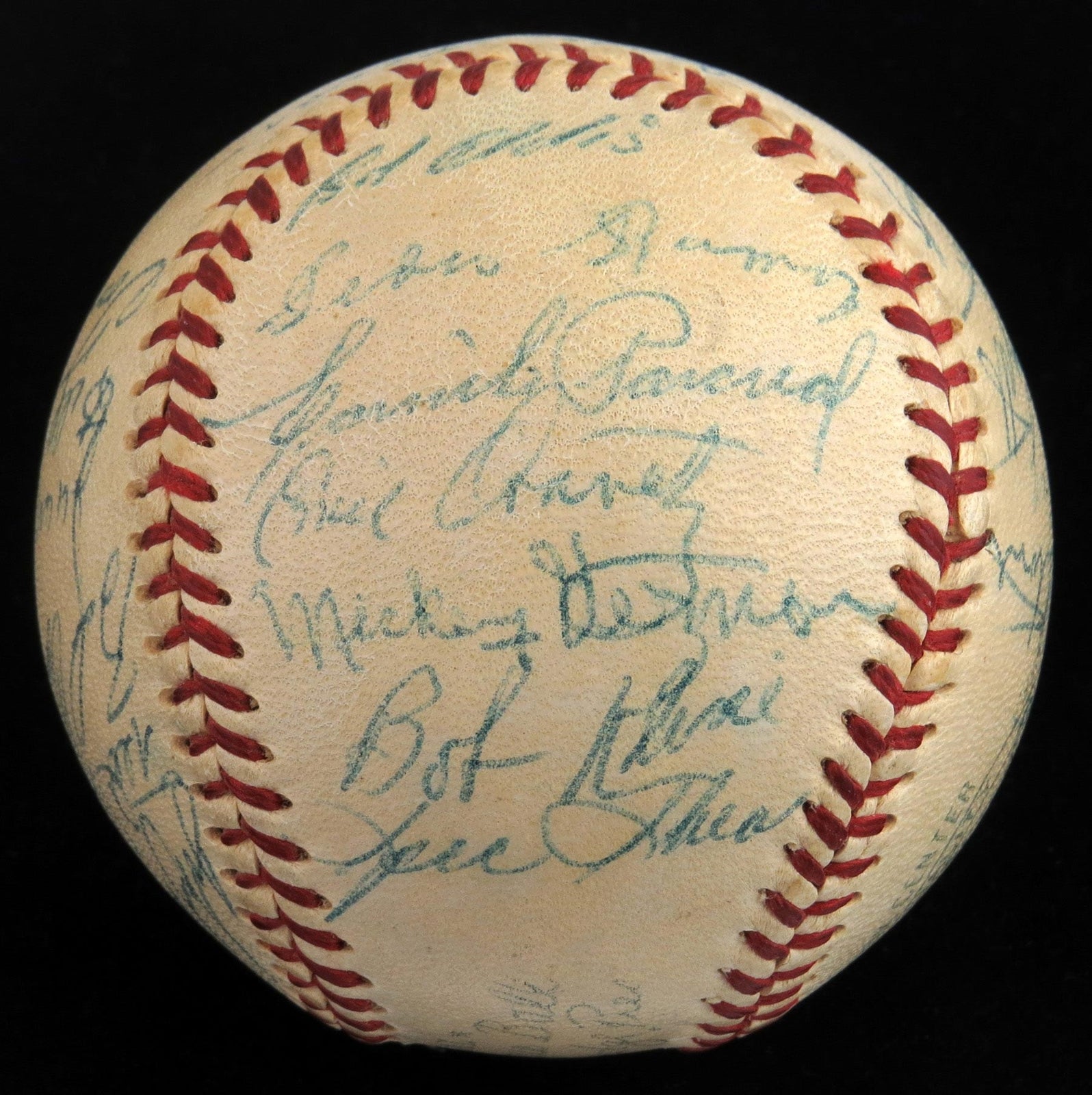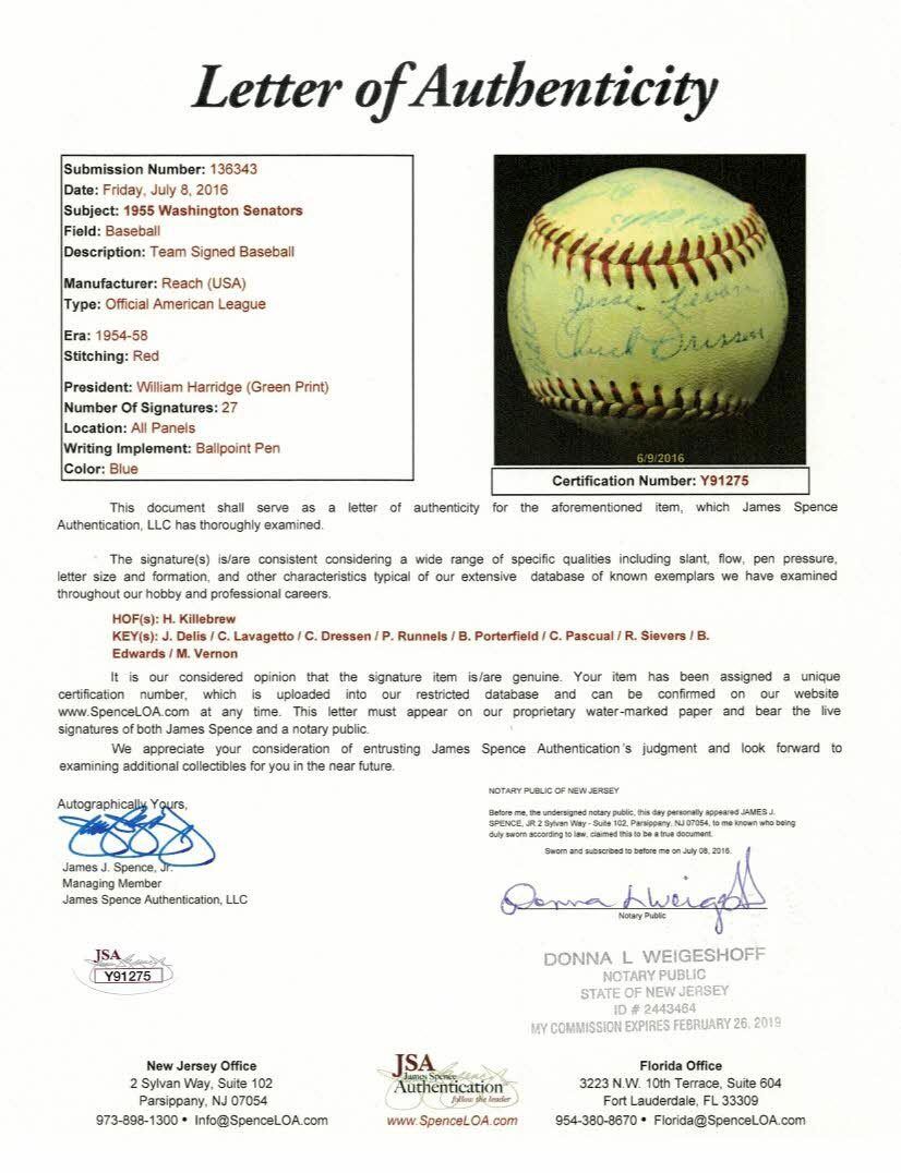 In 1955 the Washington Senators got a measure of consolation with a glimpse at the future of the franchise’s greatest slugger. On June 24th of that year “bonus baby” Harmon Killebrew (d.2011) hit the first of his 573 career home runs. Take your best swing at this 1955 Senators team-signed baseball featuring (27) autographs including an early example of “The Killer”. This period signed Official American League Harridge ball is clean and appealing with off-white panels and lightly faded factory stamps, registering as (EX-MT). Full photo LOA from JSA.