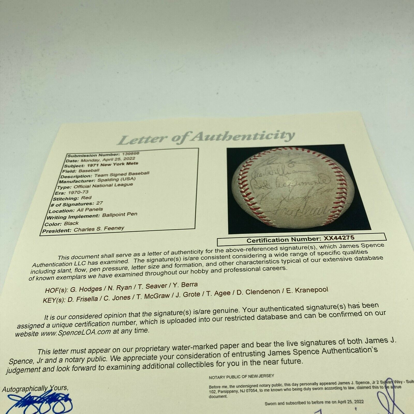 Nice 1971 New York Mets Team Signed Official National League Baseball. 27 signatures with Gil Hodges, Nolan Ryan, Tom Seaver, Yogi Berra and the rest of the team.