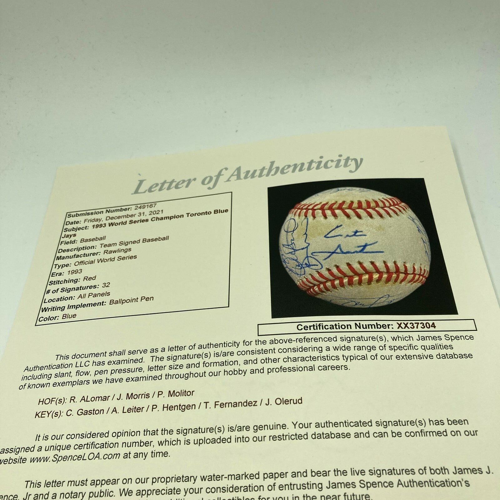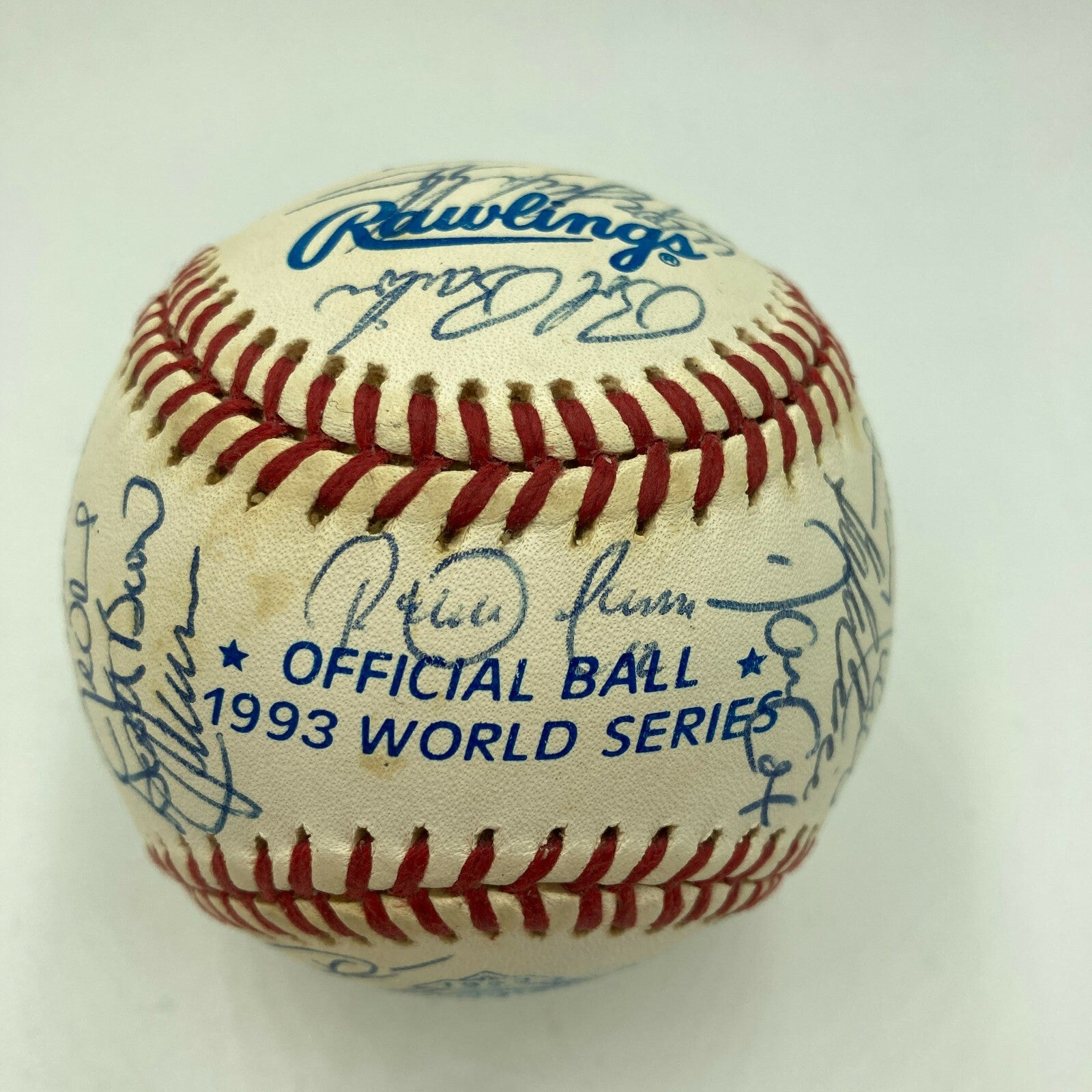Rawlings official 1993 World Series ball signed by (32) members of the champion Blue Jays including Cito Gaston, Paul Molitor, Jack Morris, Roberto Alomar, Tony Fernandez, John Olerud, Pat Hentgen, Dave Stewart, Juan Guzman, Duane Ward, Dan Cox, Mark Eichhorn, Al Leiter, Ed Sprague, Pat Borders, Turner Ward, Darnell Coles, and others