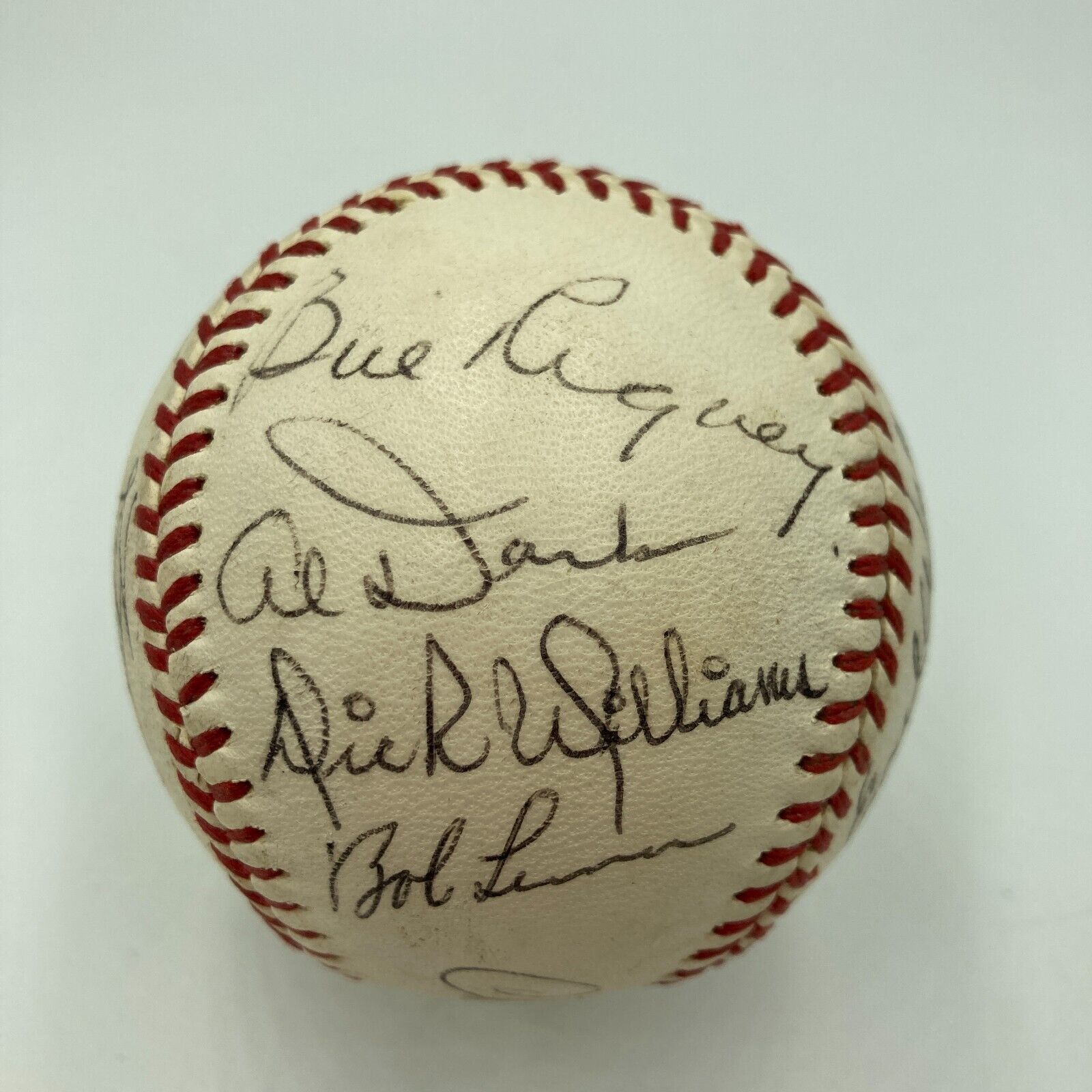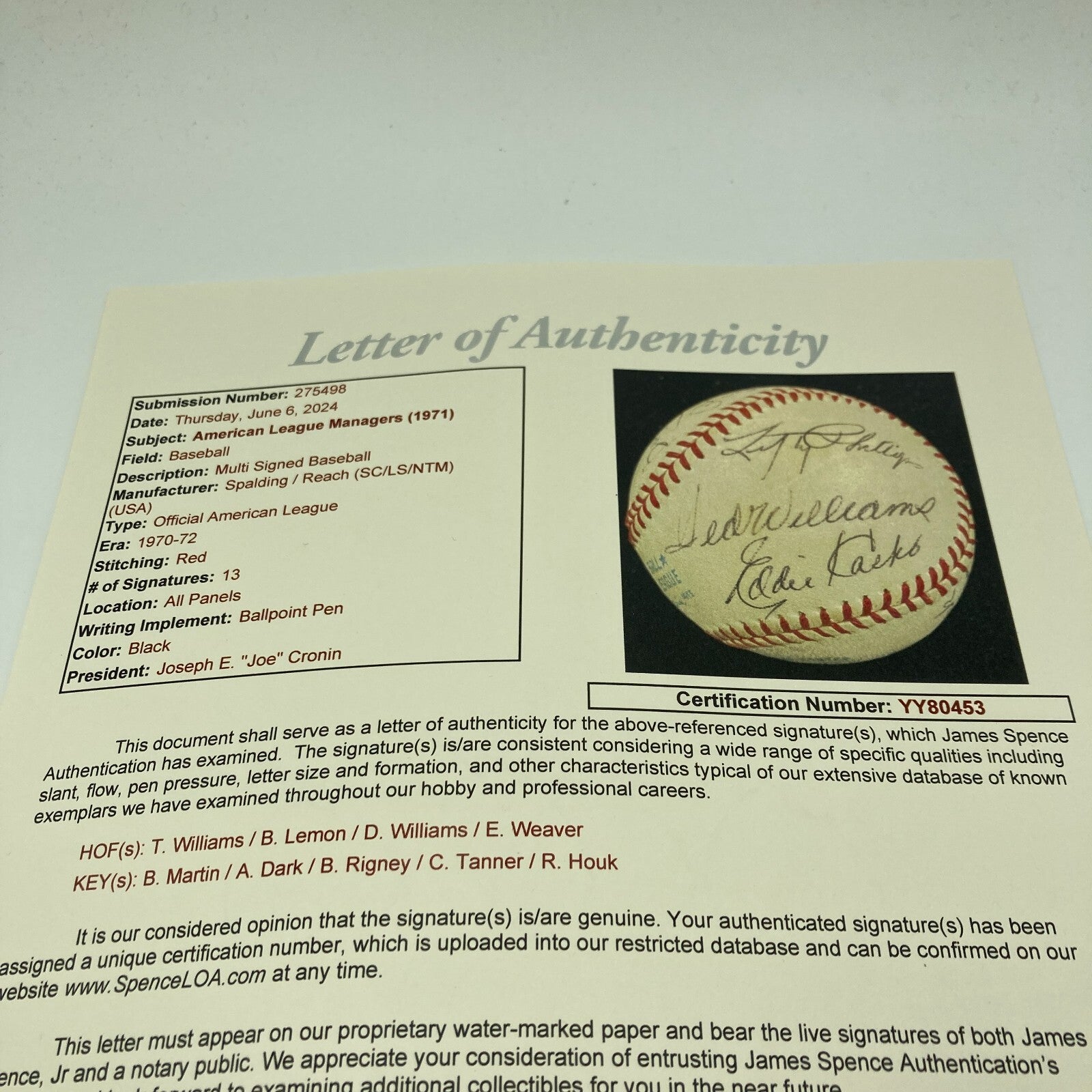 Official American League baseball (Joe Cronin) signed in black ink by thirteen American League managers from the 1971 season. The ball has been signed by Chuck Tanner (sweet spot), Ralph Houk, John Lipton, Bill Rigney, Al Dark, Dick Williams, Bob Lemon, Earl Weaver, Dave Bristol, Billy Martin, Lefty Phillips, Ted Williams, and Eddie Kasko. Excellent to Near Mint condition overall.