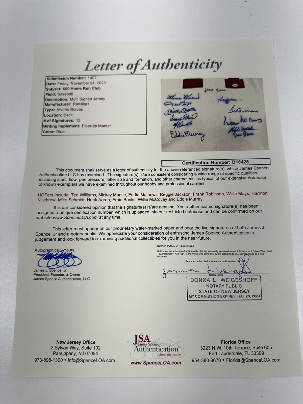 Terrific 500 Home Run Club signatures on a Hank Aaron Braves jersey. The jersey is a Rawlings, with a Rawlings tag on the right sleeve and a Rawlings size "42" tag in the neck. The front of the jersey has "Braves" in red script and underneath the team's name is the Braves' tomahawk logo. The back of the jersey has an "Aaron" name plate and the number "44" beneath the nameplate. A tag on the inside lower left tail reads, "Rawlings 42." Hank Aaron (755), Willie Mays (660), Frank Robinson (586), Harmon Killebrew (573), Reggie Jackson (563), Mike Schmidt (548), Mickey Mantle (536), Willie McCovey (521), Ted Williams (521) Eddie Mathews (512), Ernie Banks (512), and Eddie Murray (504). The signatures are JSA authenticated with a sticker and full letter COA. This signed 500 Club jersey makes a great collectible as these signatures are from players who have hit 6,791 home runs.