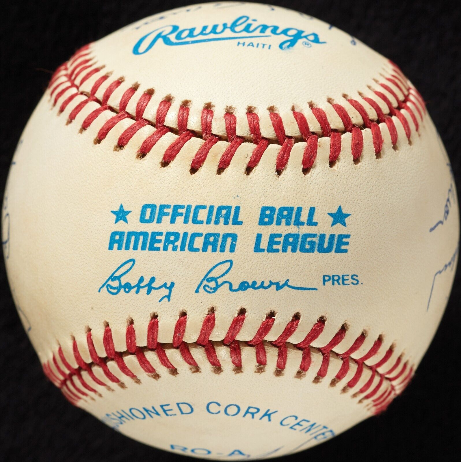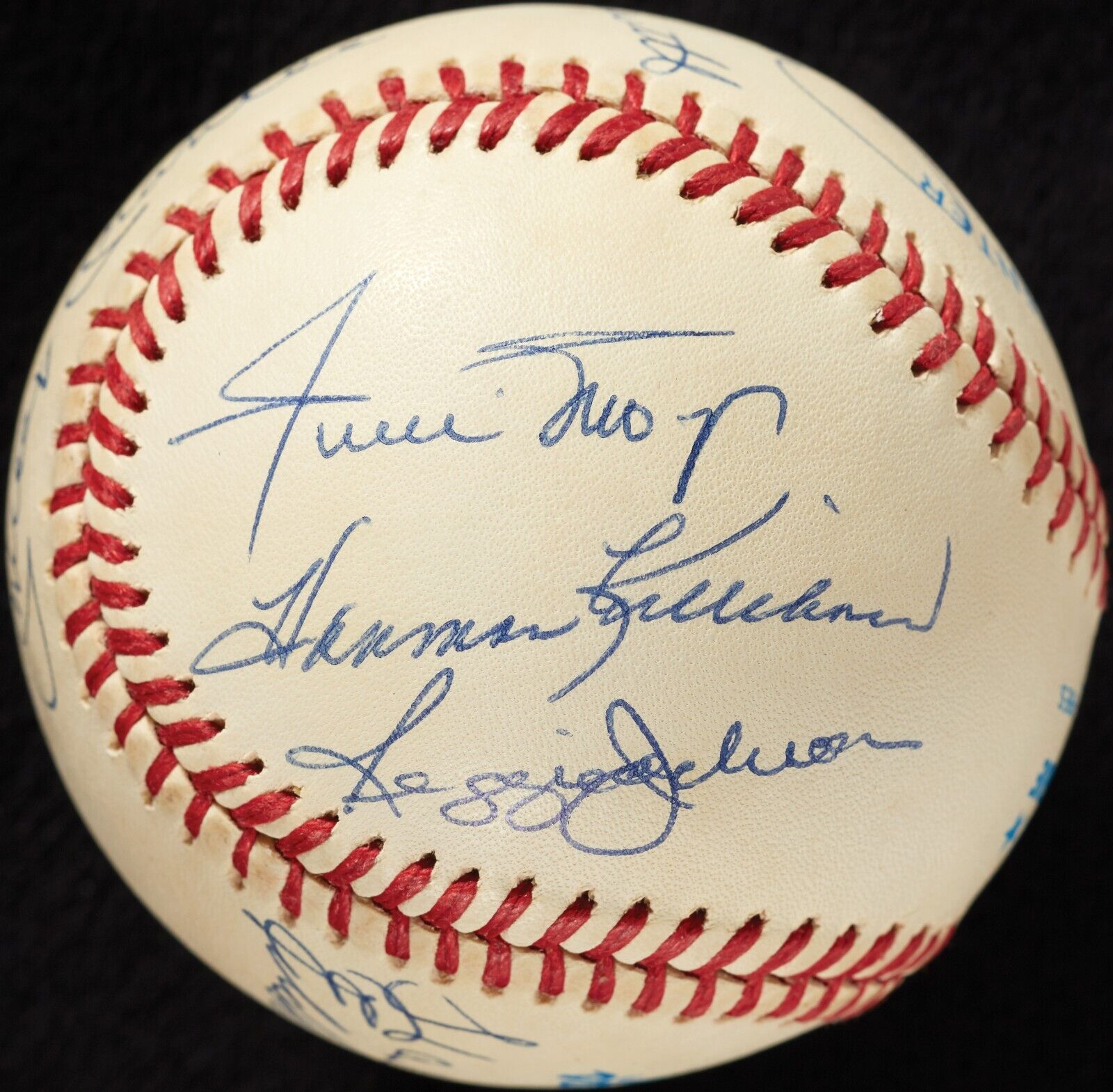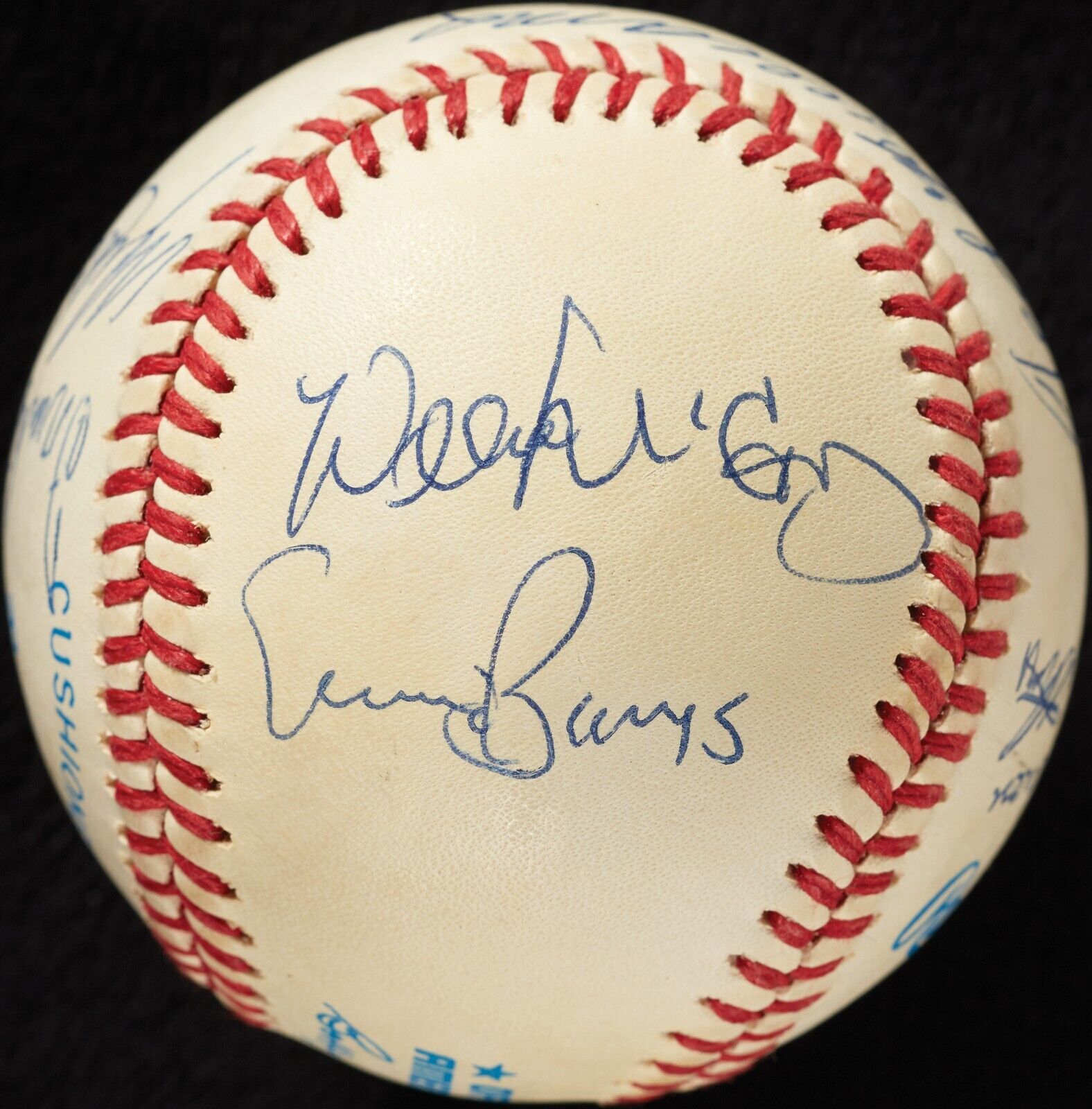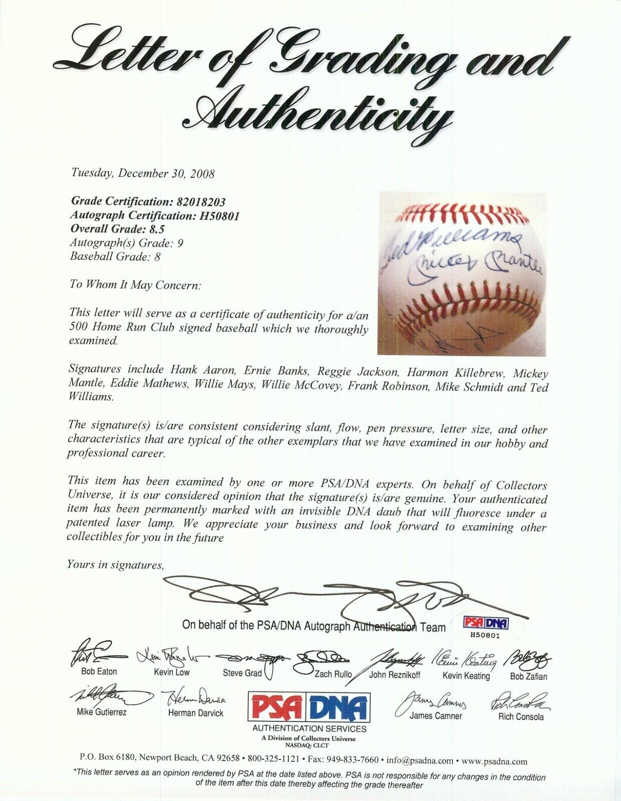 This Official American League baseball features signatures from 11 members of the 500 Home Run Club, with Ted Williams and Mickey Mantle sharing the sweet spot. Other signatures include: Hank Aaron, Harmon Killebrew, Reggie Jackson, Ernie Banks, Willie Mays, Mike Schmidt, Willie McCovey and Eddie Mathews. Each signature is in blue ballpoint pen and authenticated by PSA/DNA with a full LOA, with signatures graded "9", the ball graded "8" and the overall grade being PSA/DNA 8.5.