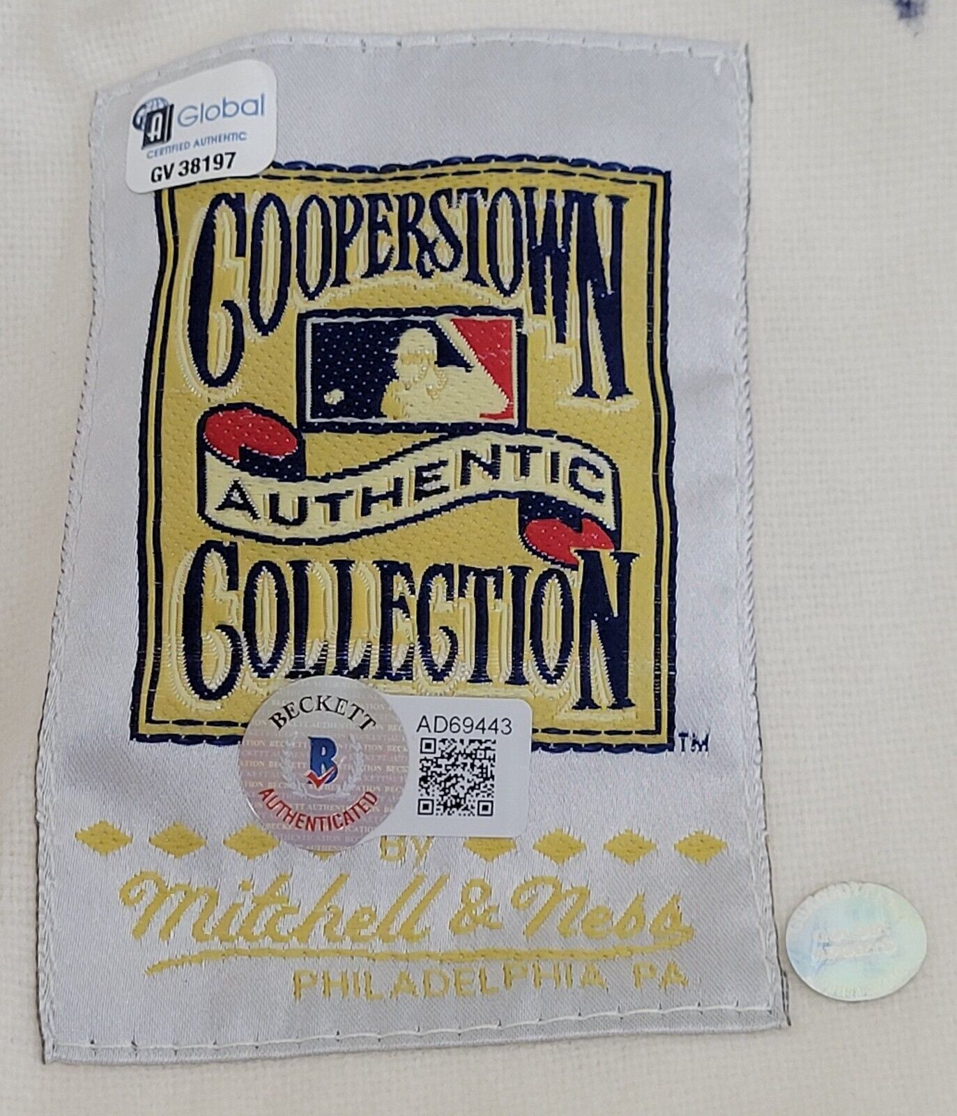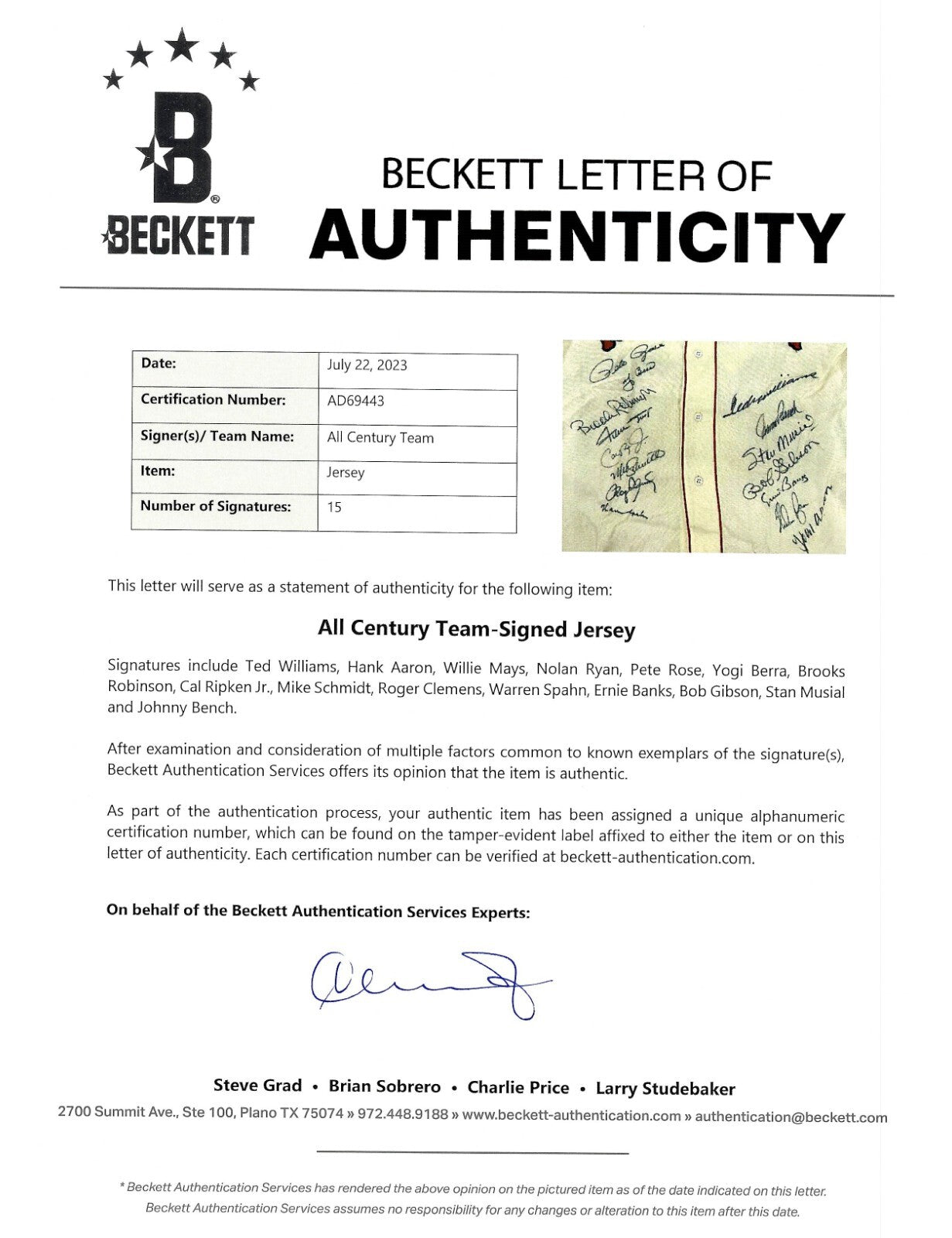 MLB All-Century Team autographed Boston Red Sox Mitchell & Ness jersey. To celebrate the 100th Anniversary of the MLB, an All-Century baseball team was assembled and a VERY LIMITED number of pieces were signed by the players honored. The rarest of the signed items is this authentic Mitchell and Ness Cooperstown Collection jersey which has been personally signed by: Pete Rose, Yogi Berra, Brooks Robinson, Willie Mays, Cal Ripken Jr., Mike Schmidt, Roger Clemens, Warren Spahn, Ted Williams, Johnny Bench, Stan Musial, Bob Gibson, Ernie Banks, Nolan Ryan and Hank Aaron. This carries a Goldin Hologram and a full Beckett LOA.