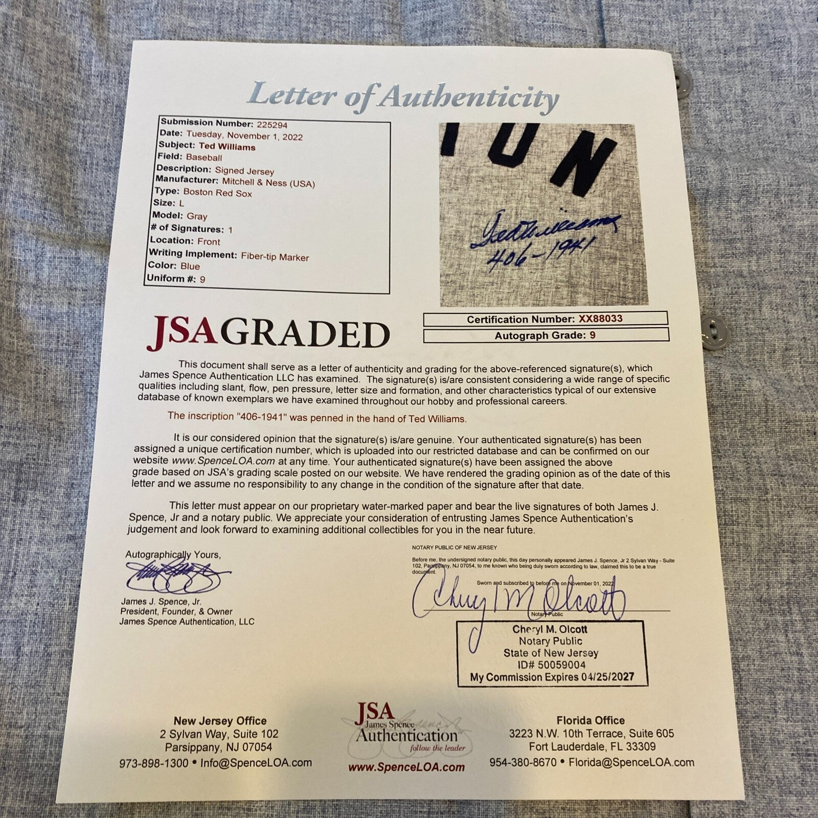 Sold out Beautiful Ted Williams .406 -1941 Signed Boston Red Sox Jersey JSA COA Ted Williams Boston Red Sox signed and inscribed jersey. This size 44 Mitchell & Ness Cooperstown Collection jersey has been signed at the lef... View full details