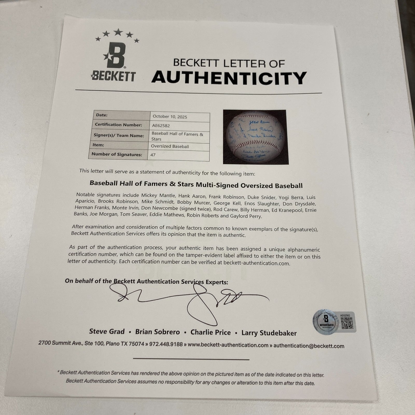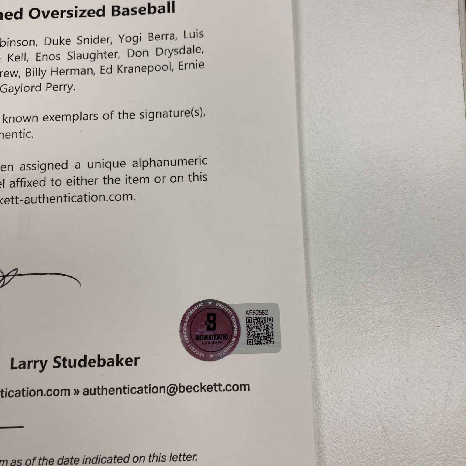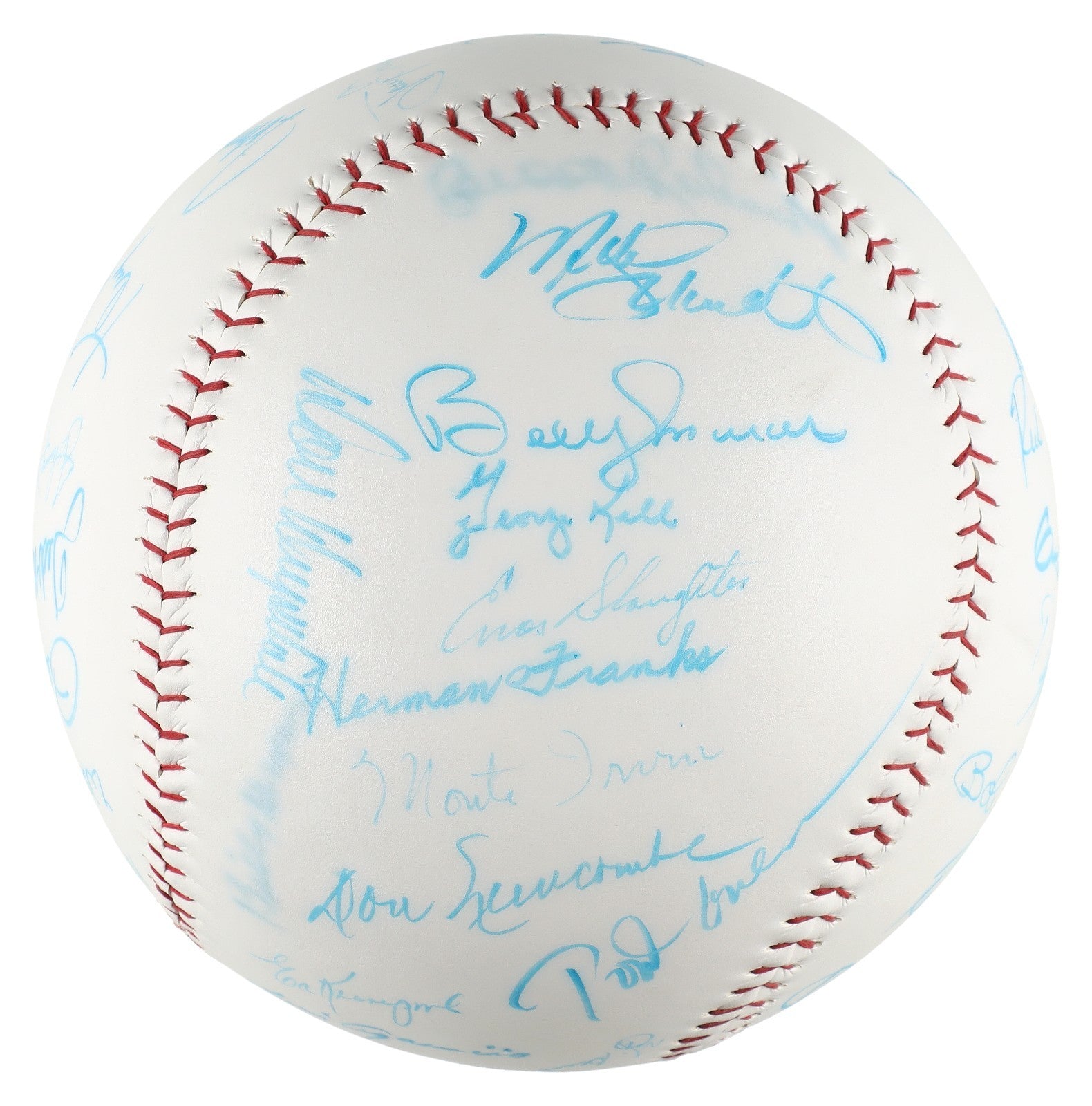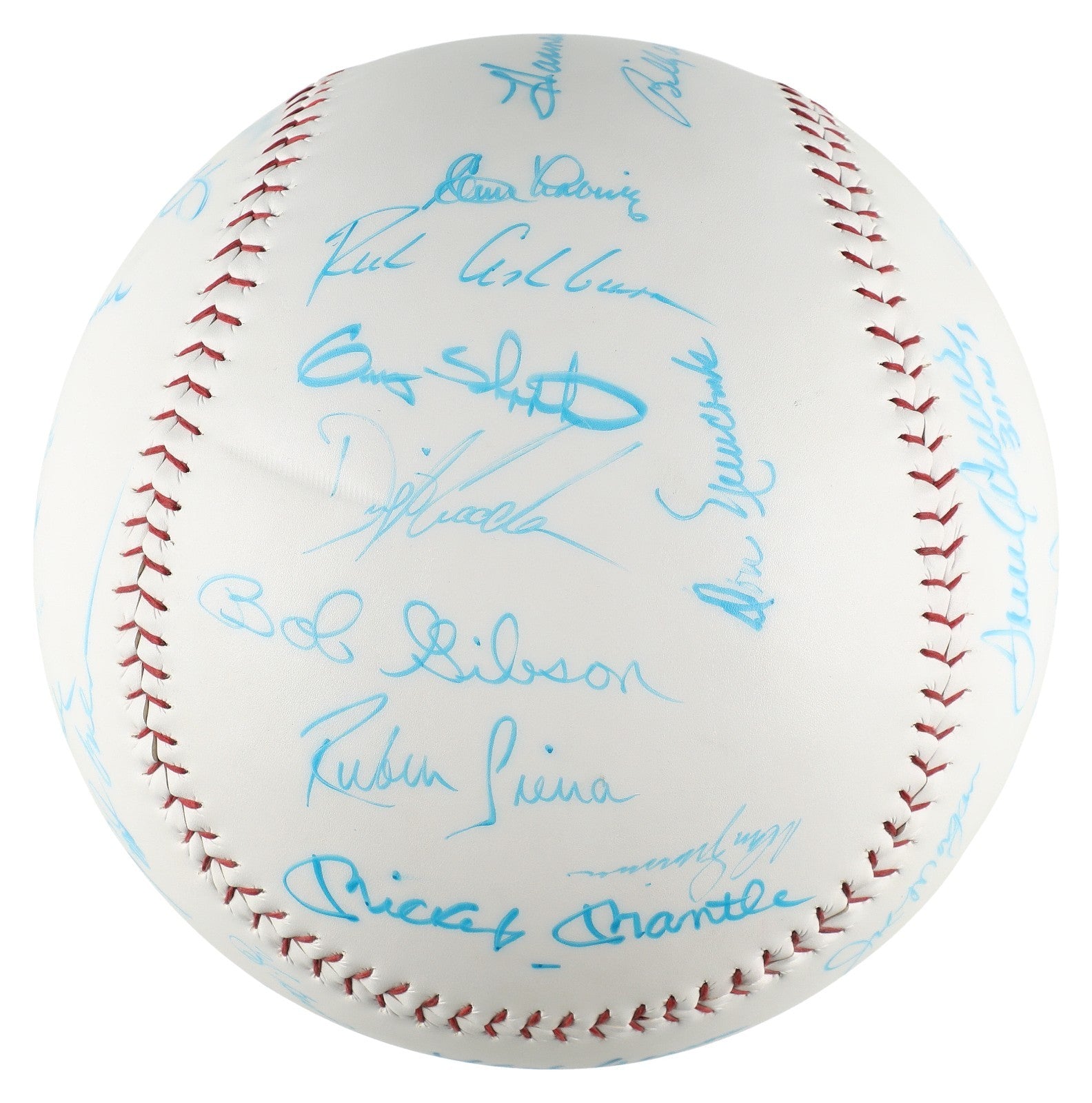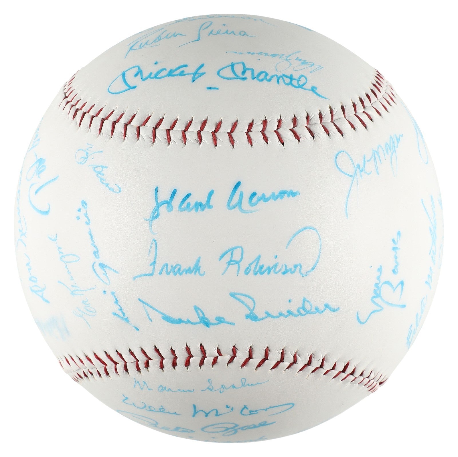 Presented is a 12-inch multi-signed oversized baseball adorned with the signatures of 47 baseball icons, including various Baseball Hall of Famers. Using light blue marker, the following Hall of Famers have penned their flowing signatures across this baseball: Mickey Mantle, Hank Aaron, Frank Robinson, Duke Snider, Yogi Berra, Luis Aparicio, Brooks Robinson, Mike Schmidt, Ernie Banks, George Kell, Enos Slaughter, Don Drysdale, Monte Irvin, Rod Carew, Billy Herman, Joe Morgan, Tom Seaver, Eddie Mathews, Robin Roberts, Gaylord Perry, Carl Yastrzemski, Juan Marichal, Warren Spahn, Willie McCovey, Ted Williams, Whitey Ford, Early Wynn, Johnny Mize, Tony Pérez, Johnny Bench, Tony Gwynn, Harmon Killebrew, Billy Williams, Richie Ashburn, Bob Gibson, and Sandy Koufax. Additionally, the following baseball stars have penned their flowing signatures in light blue marker across this baseball: Pete Rose, Bobby Murcer, Herman Franks, Don Newcombe (twice signed), Clem Labine, Dwight "Doc" Gooden, Gary Sheffield, Don Zimmer, Rubén Sierra, and Ed Kranepool. While some of the signatures have faded, the overall condition of this item is exemplary and would make an excellent addition to any baseball collection. Comes with full letter Beckett COA.