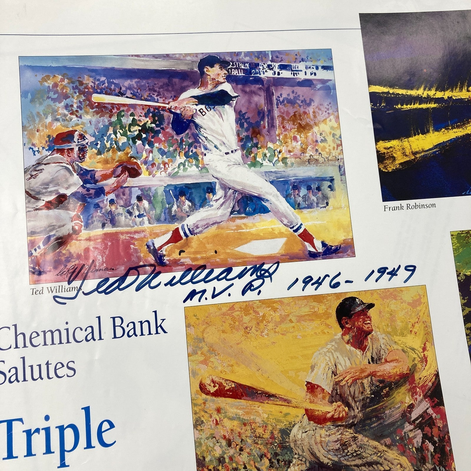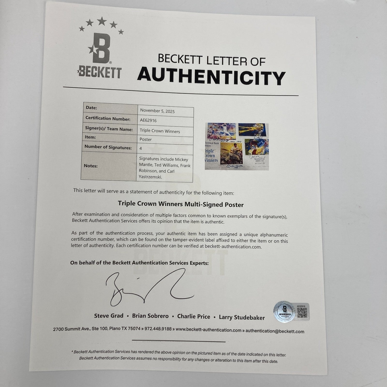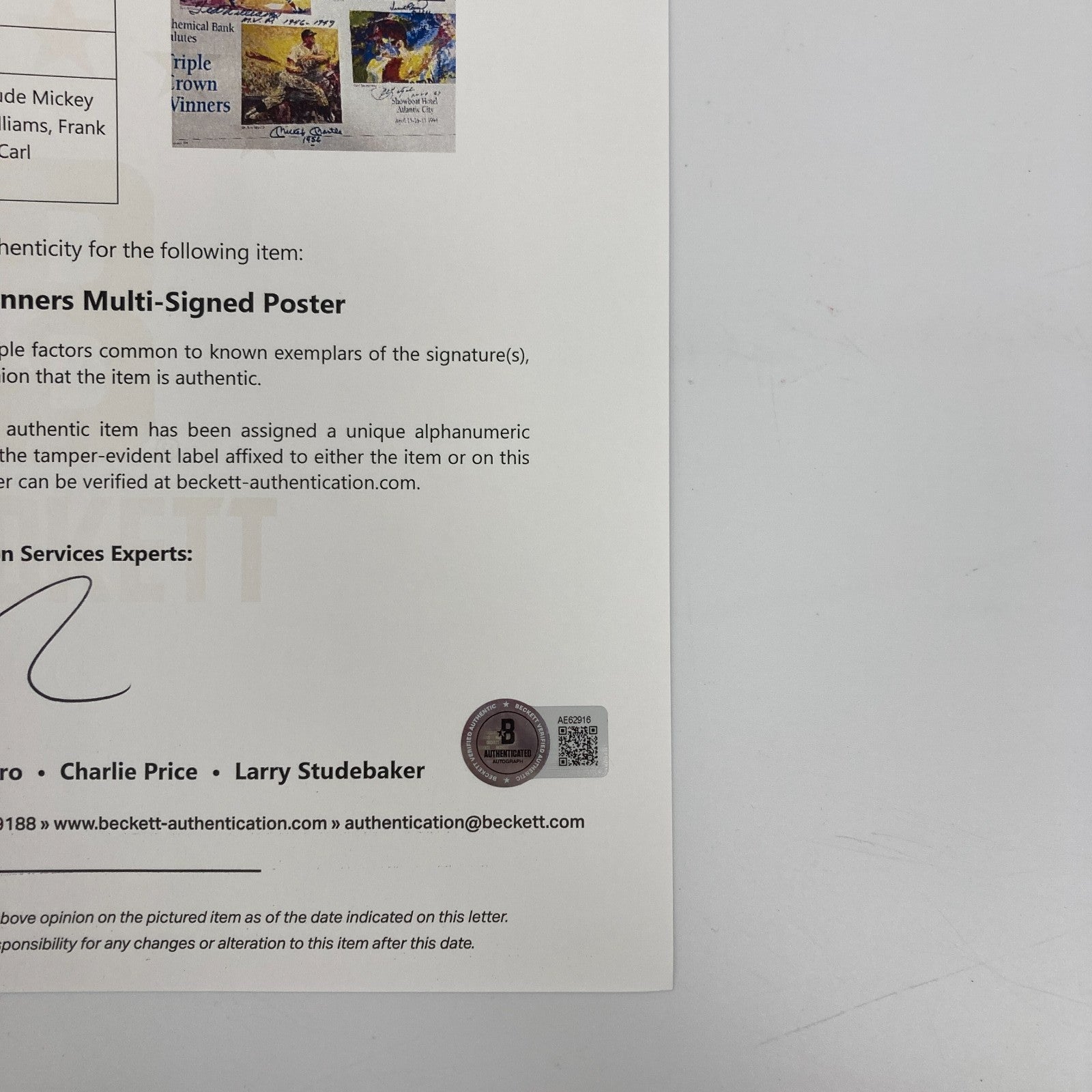 Hall of Famers. Presented is a Triple Crown winners print featuring National Baseball Hall of Famers Mickey Mantle, Ted Williams, Frank Robinson, and Carl Yastrzemski. Mantle, Williams, Robinson, and Yastrzemski have penned their blue ink signatures across their likeness on this print (4 signatures). Williams has inscribed "MVP 1946-1949," Robinson has inscribed "MVP 66," Yastrzemski has inscribed "MVP 67," and Mantle has inscribed "1956." The print features artwork by Leroy Neiman, and displays a generally clean manner of appearance. The print measures 16.5-by-22 inches. LOA from Beckett for the signatures accompanies.