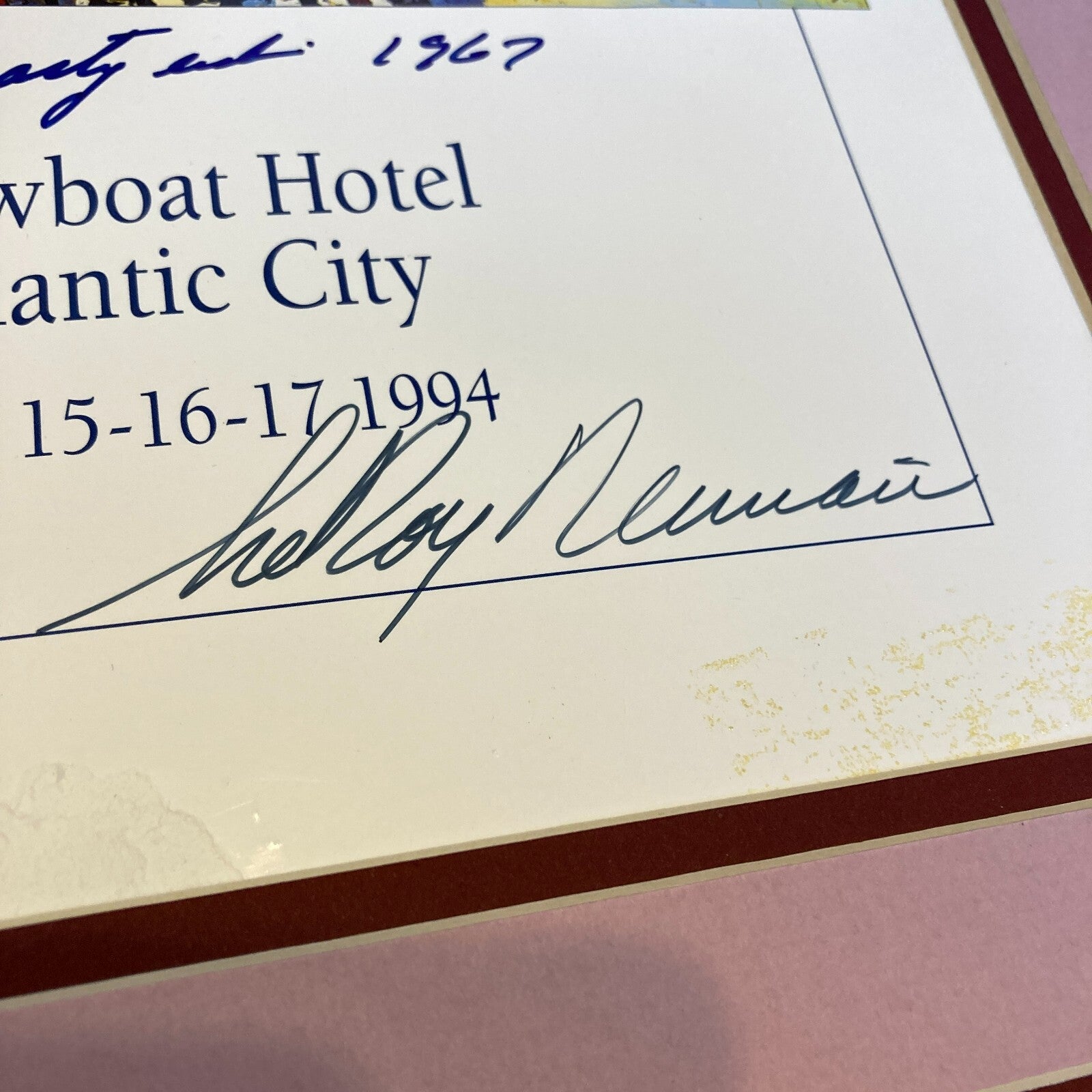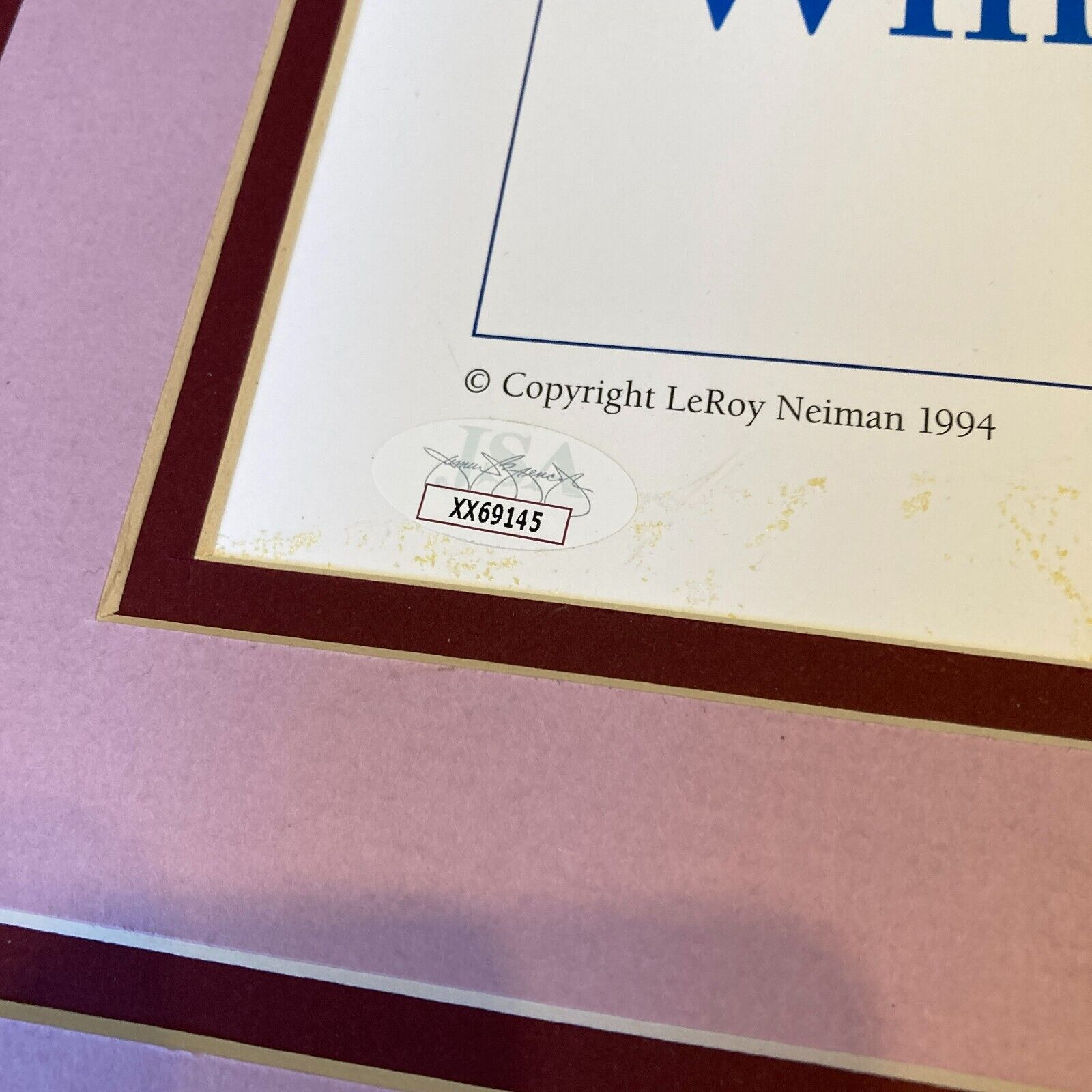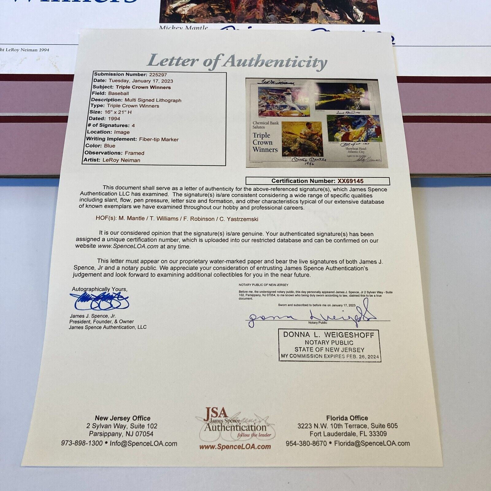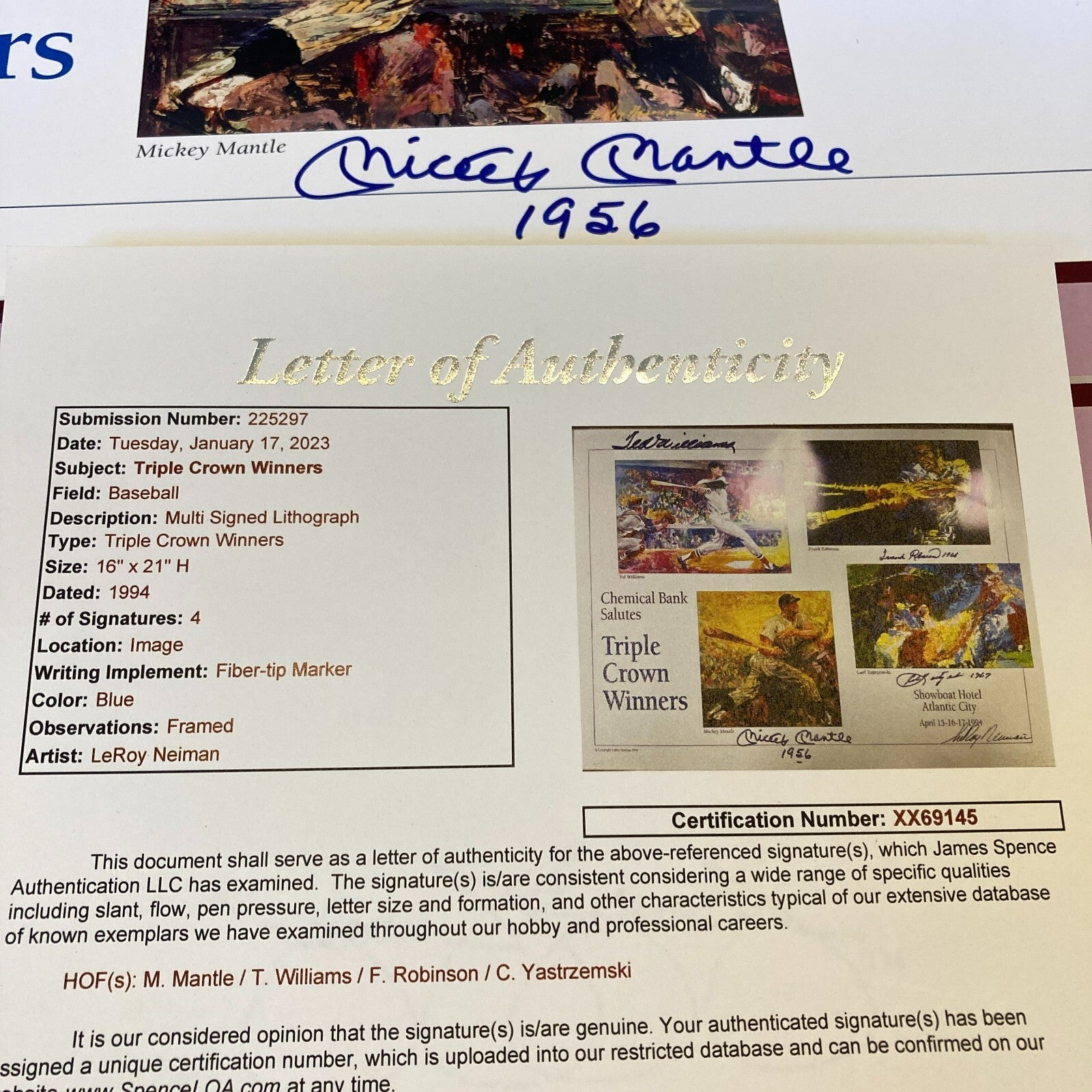 The poster is signed by Mickey Mantle (with a “1956” inscription), Ted Williams, Carl Yastrzemski (with a “1967” inscription) & Frank Robinson "1966" in blue sharpie. The poster is also signed by the artist, LeRoy Neiman, in black sharpie.