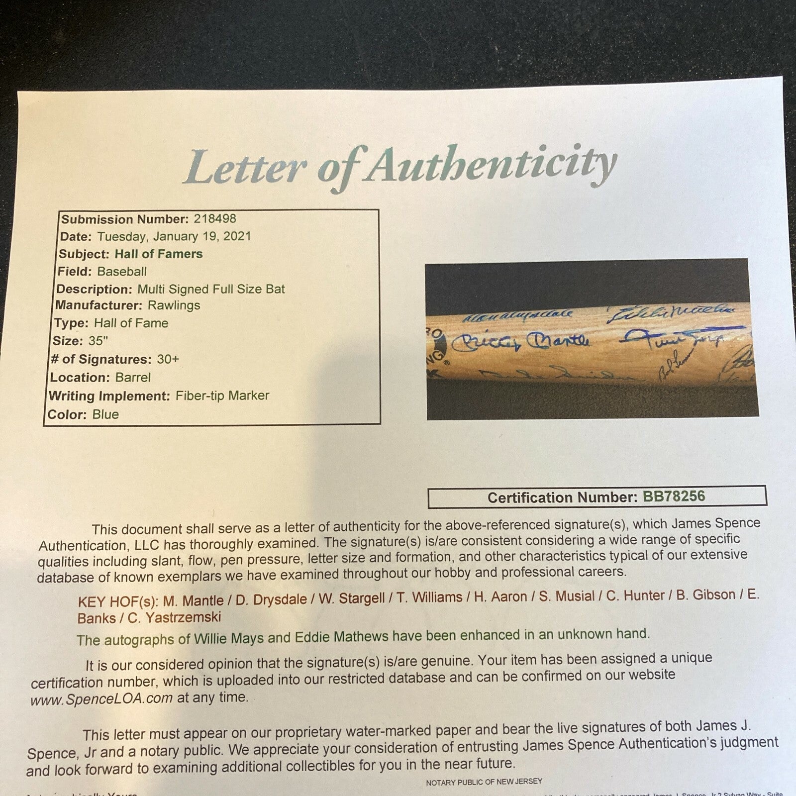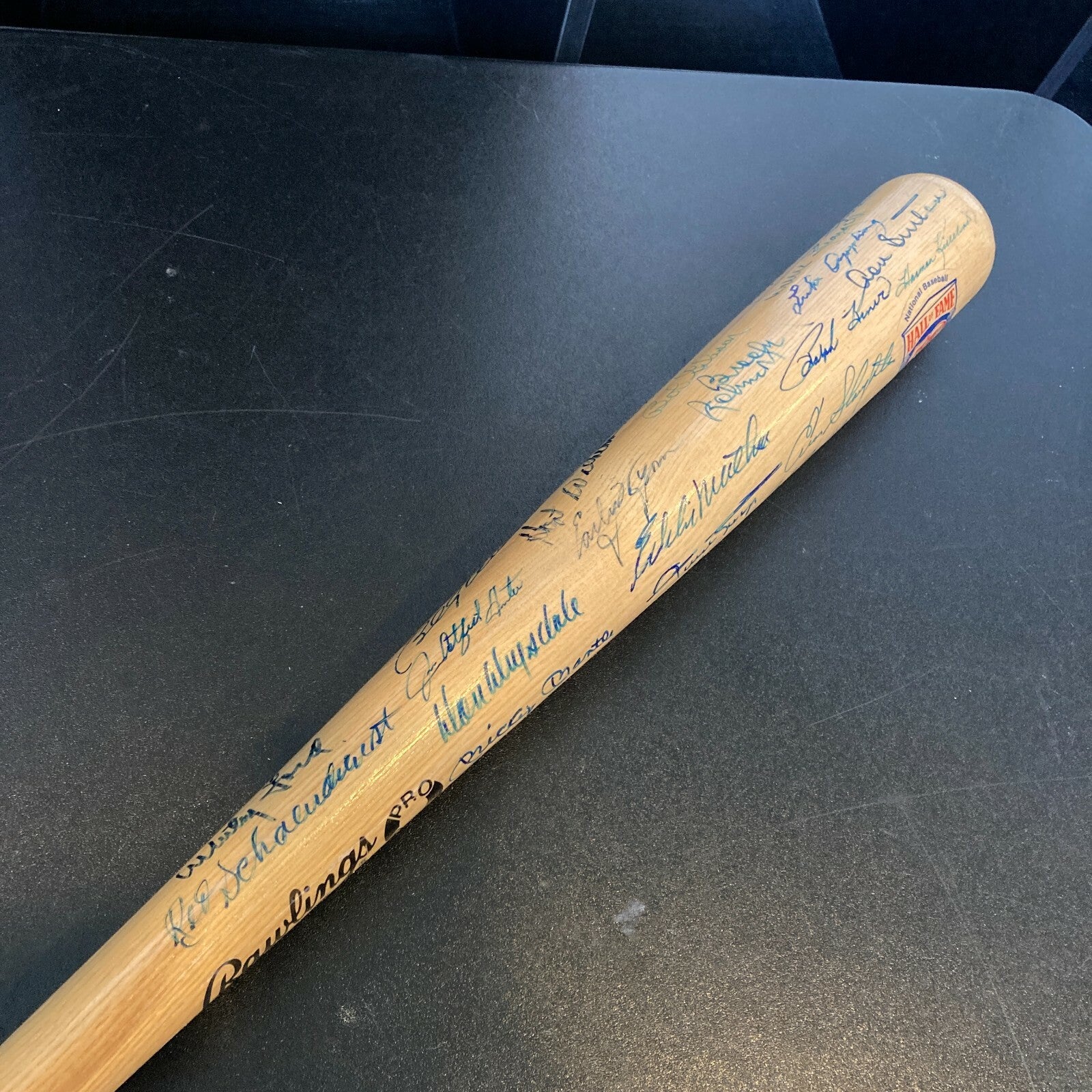 Rawlings Adirondack, 50 Years Hall of Fame Multi Signed Bat. Includes over 35 signatures with Mickey Mantle, Brooks Robinson, Enos Slaughter, Don Drysdale, Duke Snider, Willie Mays, Bob Feller, Hank Aaron, Ted Williams, Stan Musial, Ernie Banks, Lou Brock, Monte Irvin, Bob Gibson, Whitey Ford, and many other. Full letter COA from JSA. Also has a PSA DNA sticker.