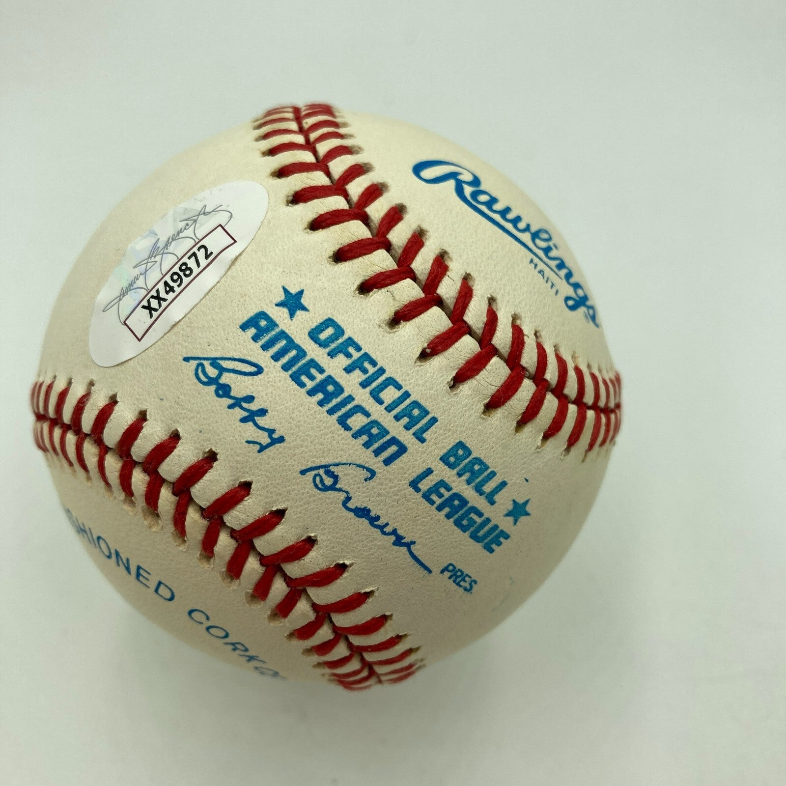 Offered is an Official American League Lee MacPhail baseball signed by 20 former MLB Hall of Famers and stars in blue ballpoint ink. Key signatur...